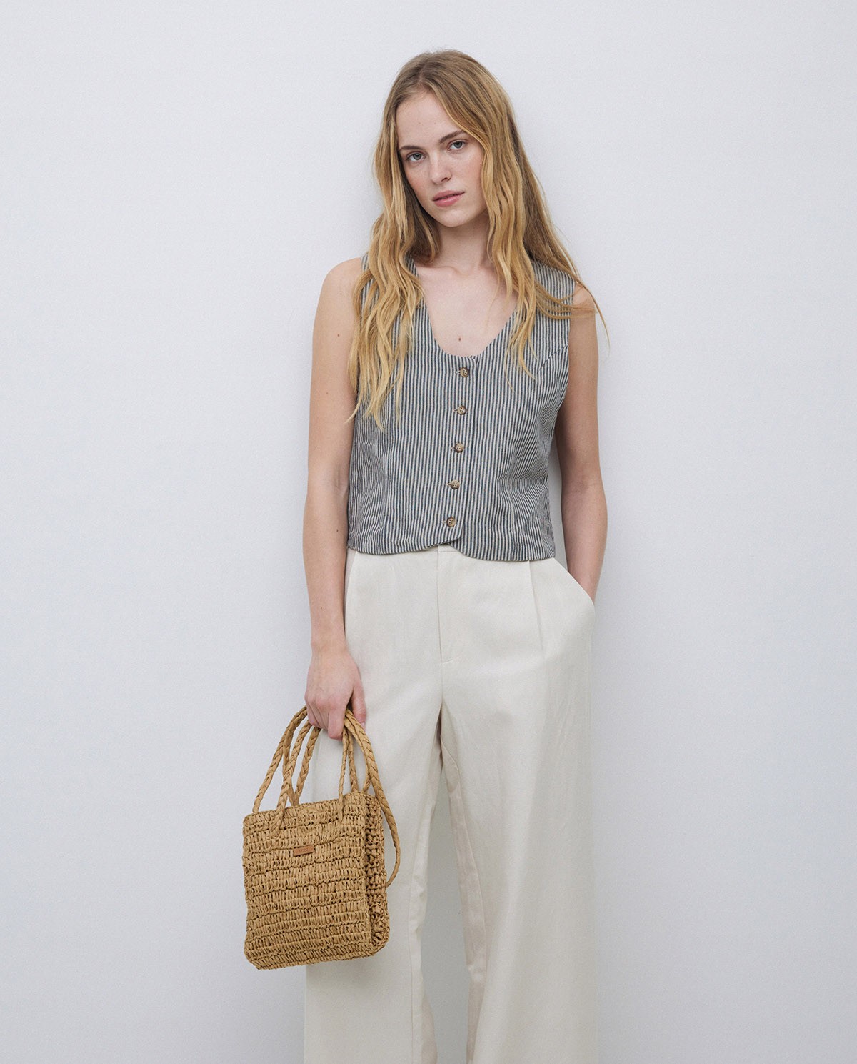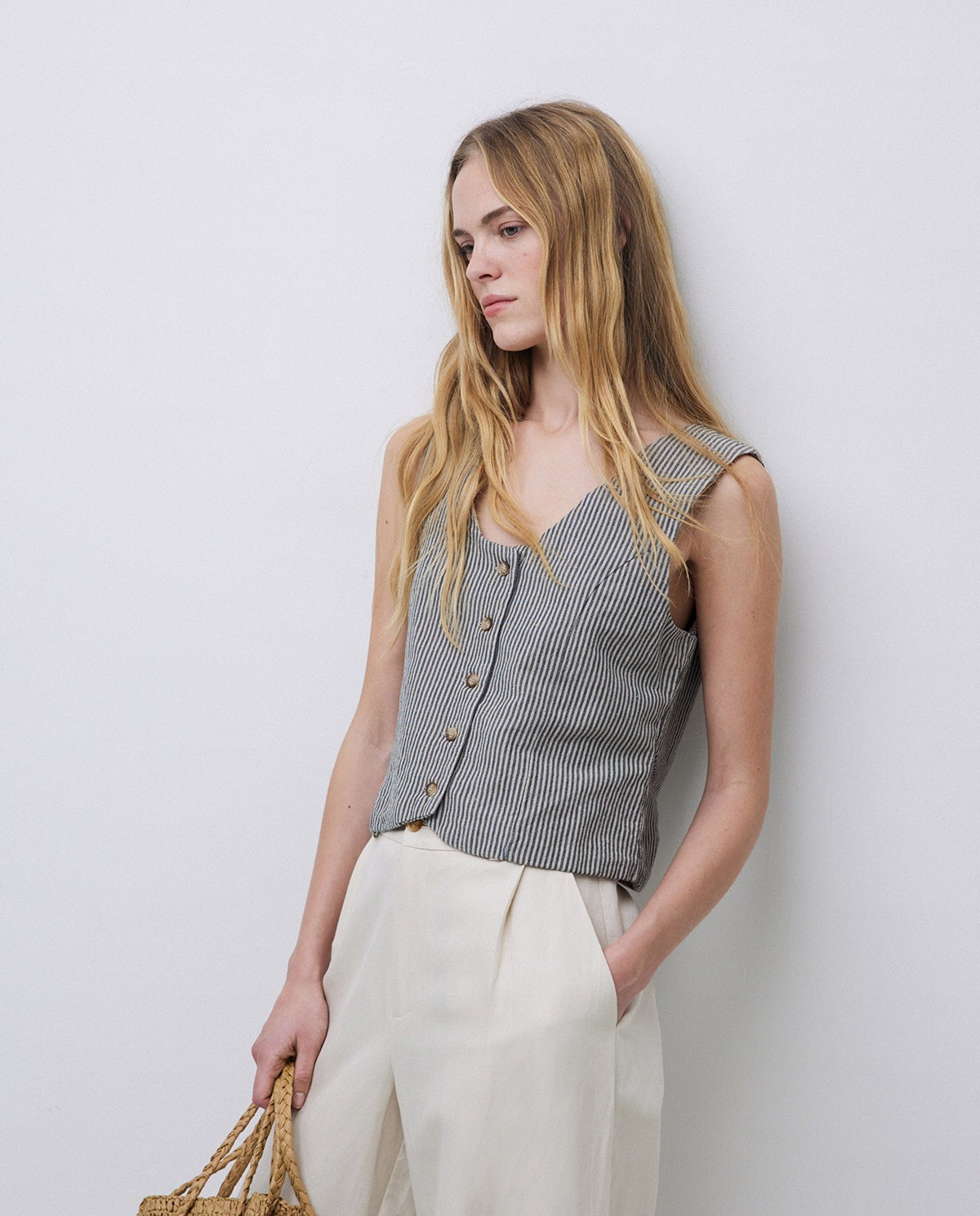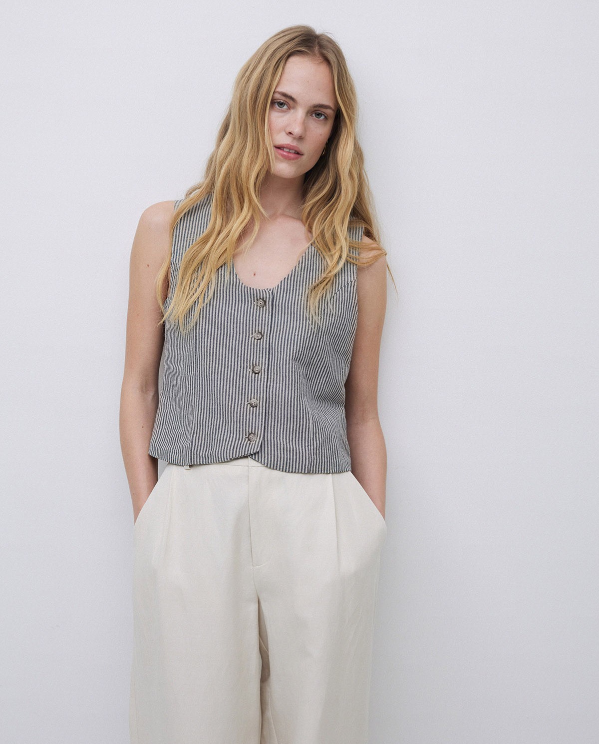 Chaleco mezcla de lino y algodón. Estampado de rayas. Diseño recto. Escote redondo. Sin mangas. Cierre con botones efecto carey. Tiras ajustables con hebilla detrás.