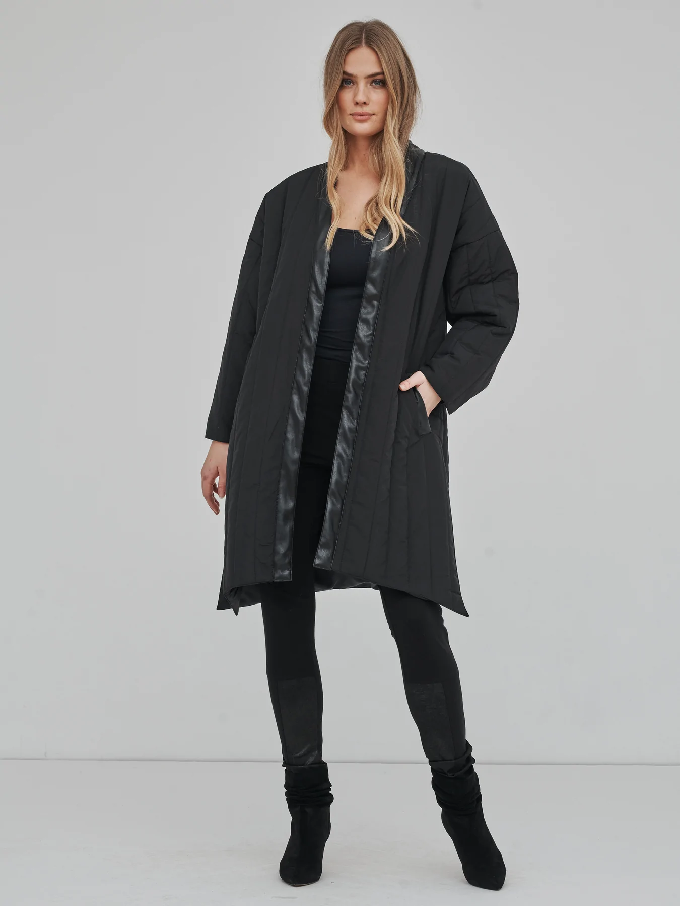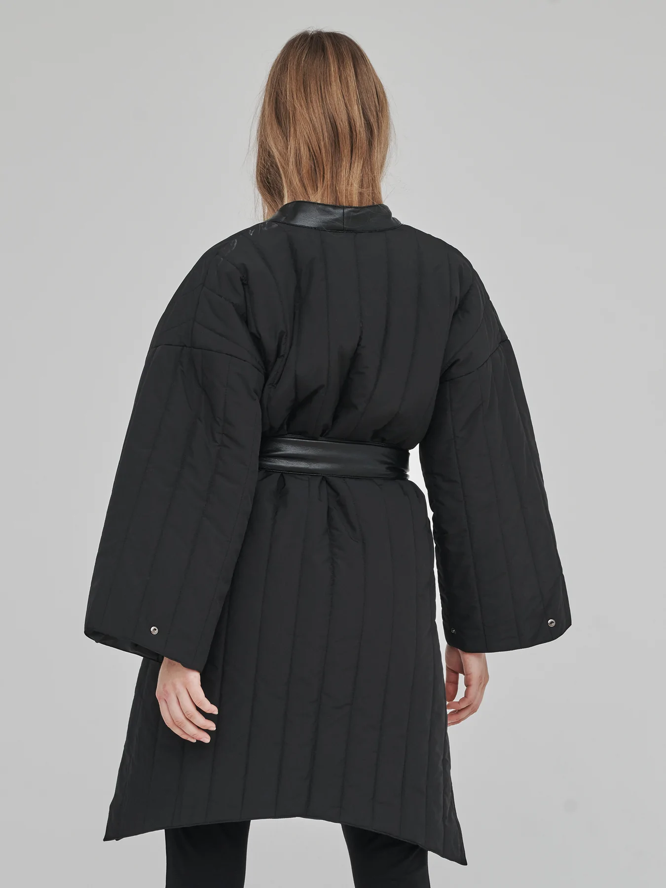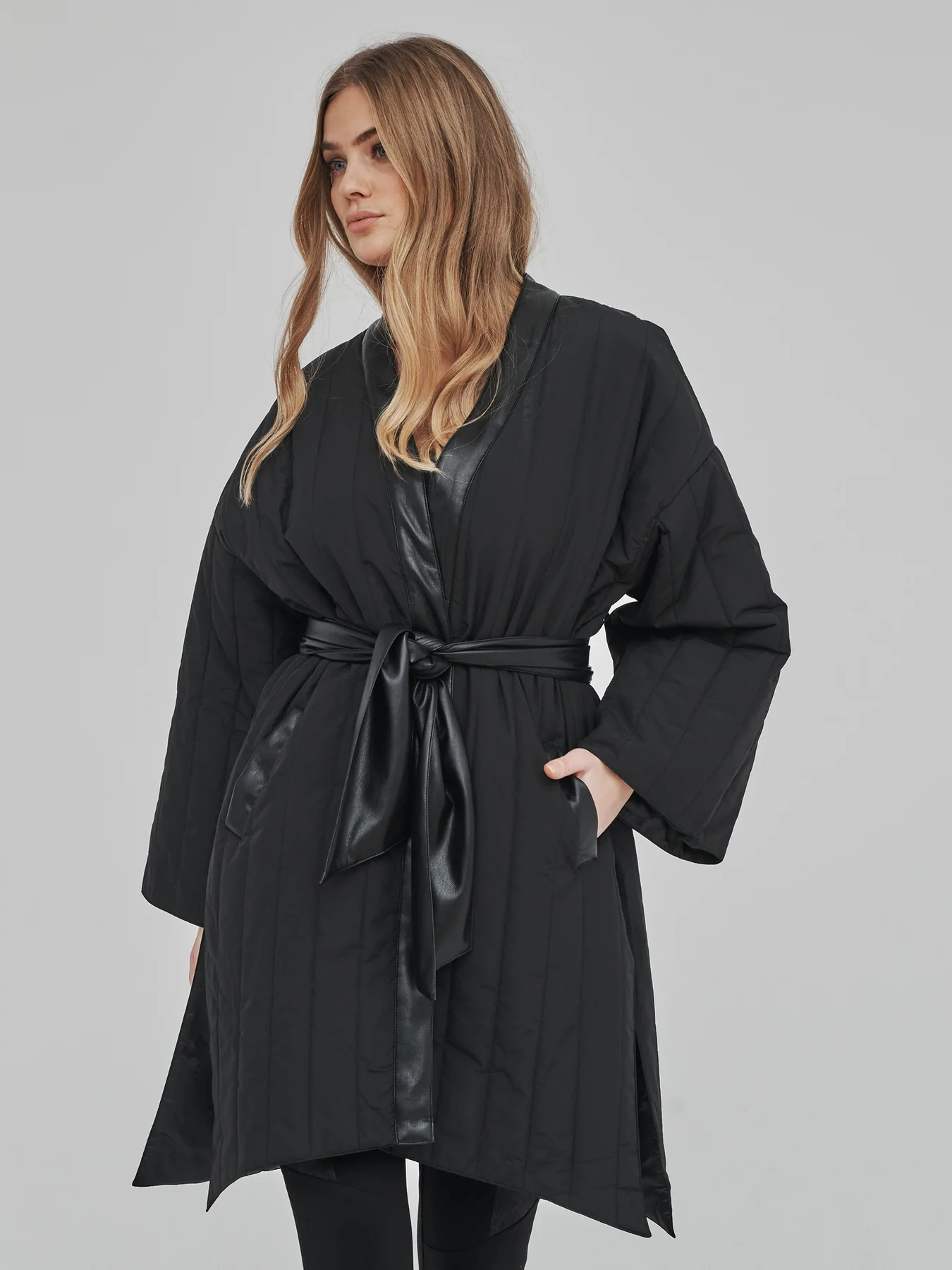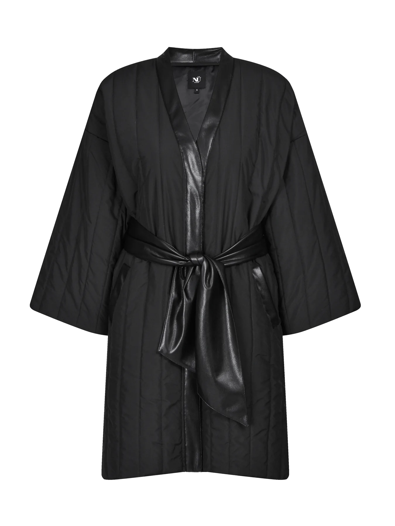 Esta chaqueta negra está confeccionada en un cómodo tejido acolchado con mangas oversize, así como ribetes y tiras para anudar en ecopiel, lo que le da un toque exclusivo. Diseñado en una silueta de kimono que le da a la chaqueta un aspecto relajado, lo que la hace ideal cuando necesitas salir rápidamente. La chaqueta se adapta perfectamente a cualquier atuendo.