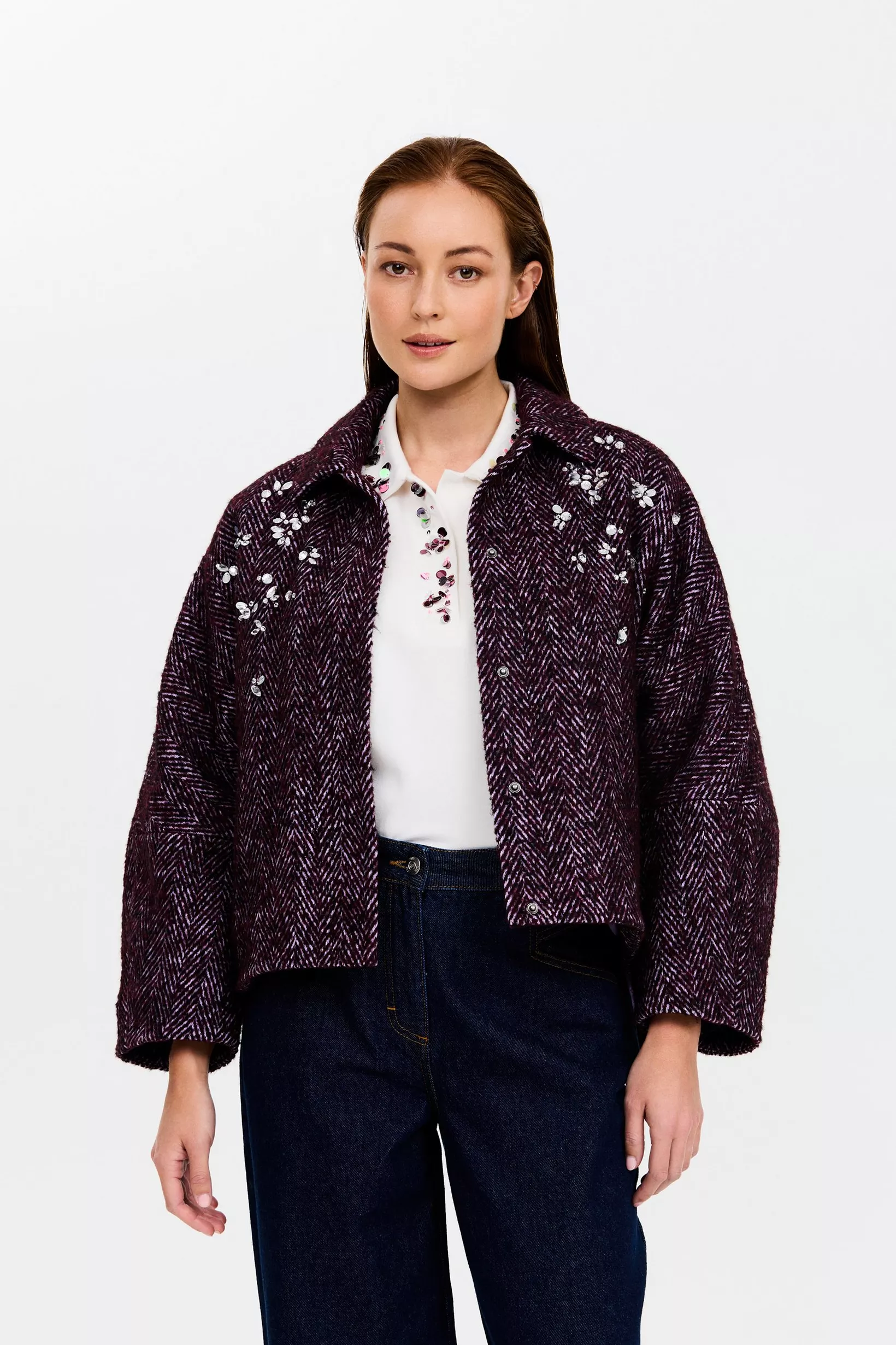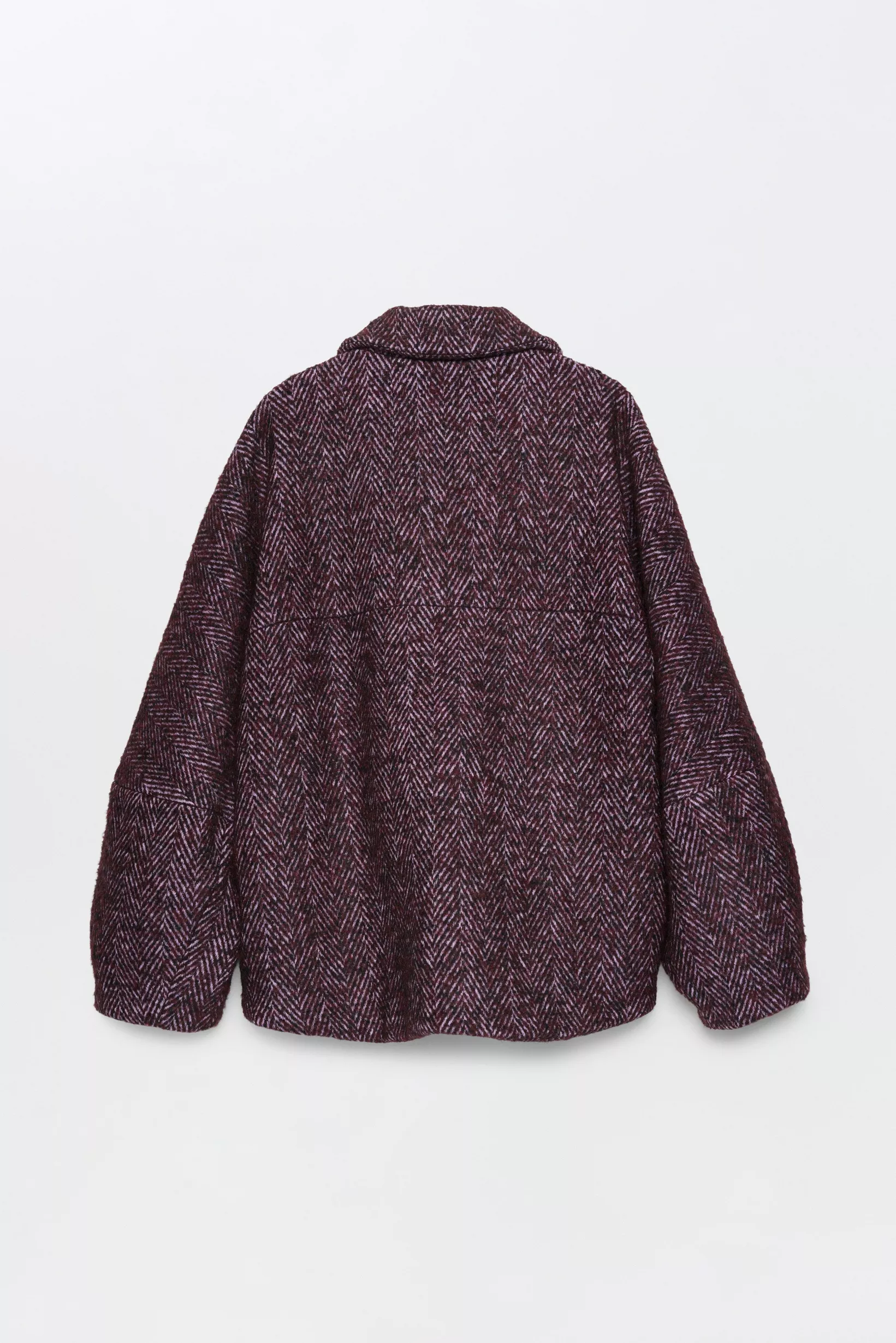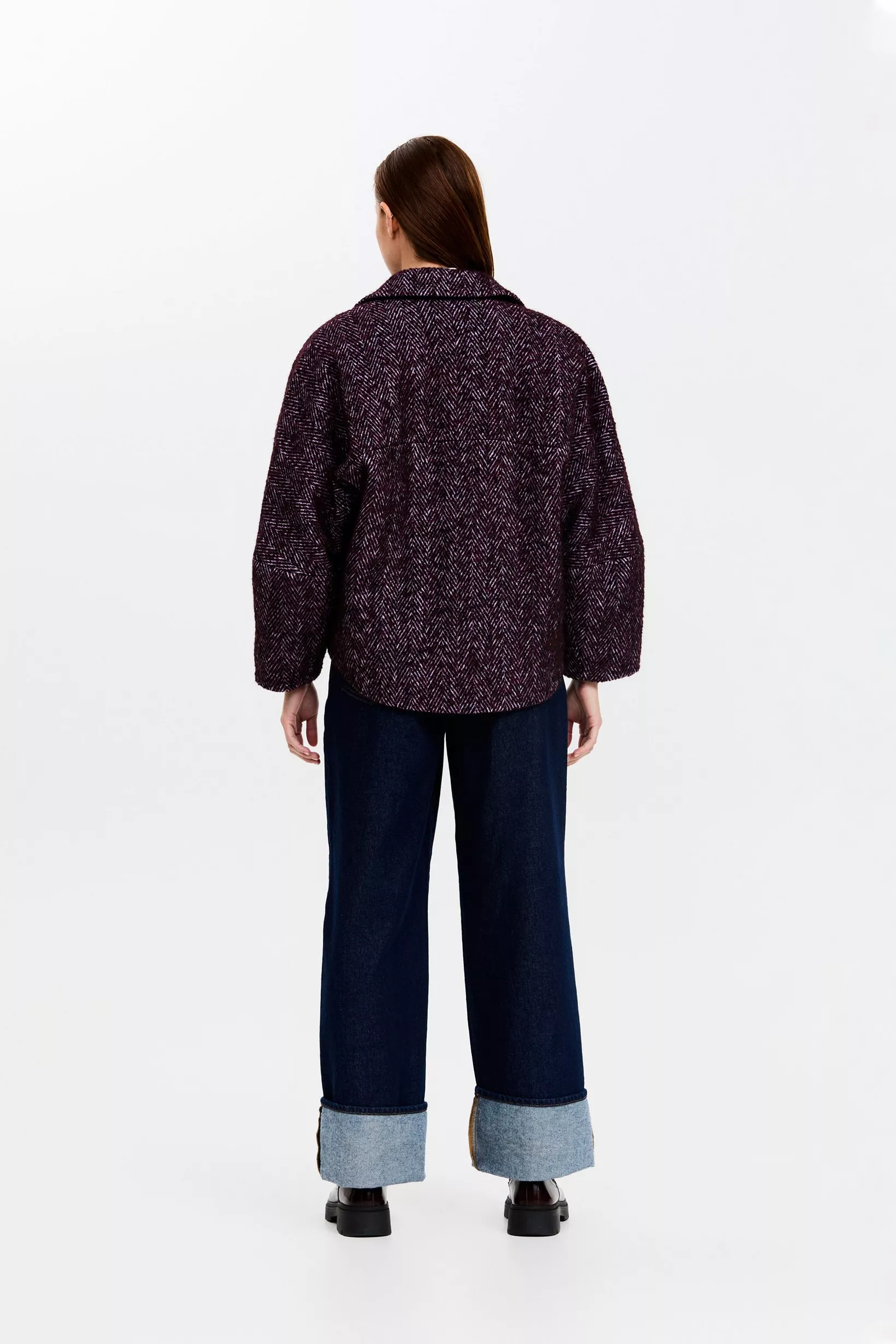 Enfrentate al frio con estilo con este abrigo corto y sencillo de tweed con estampado de espiga. Presenta cuello abotonado,bolsillos, broches y mangas globo redondeadas. El toque final perfecto.