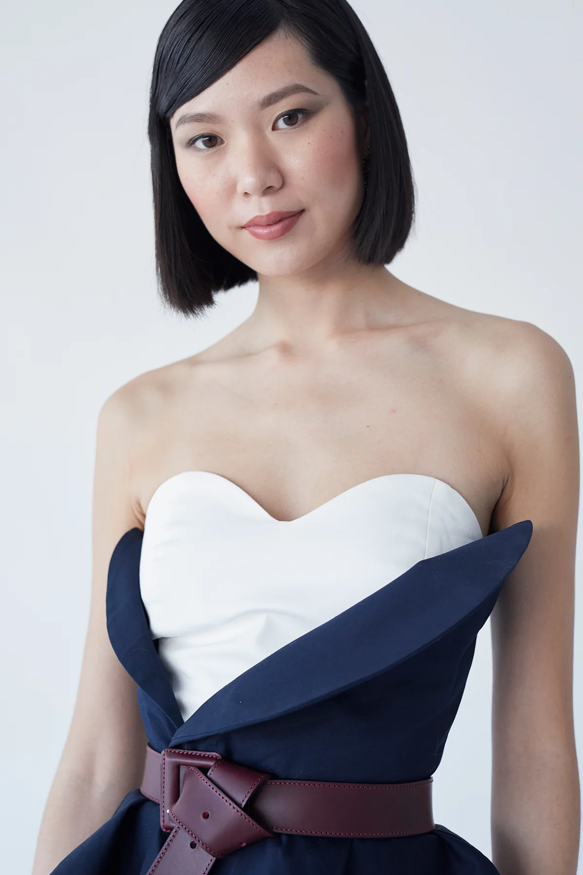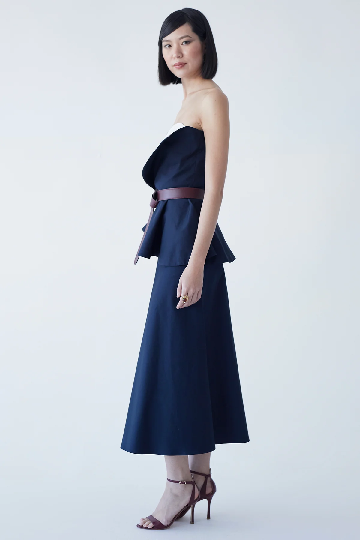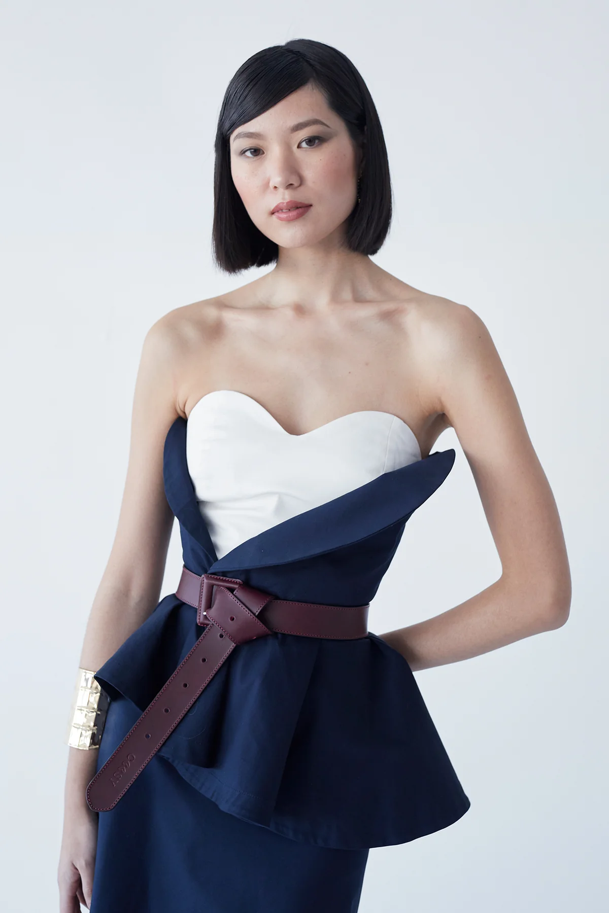 Destaca con nuestro conjunto sin tirantes en combinación de marino y blanco, diseñado para atraer todas las miradas. Este diseño exclusivo cuenta con un elegante escote corazón en color blanco que contrasta con la estructura marino y detalles de volantes asimétricos, creando una silueta única y sofisticada.