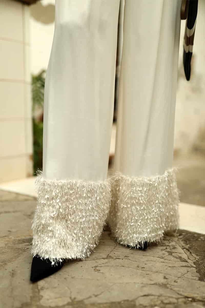 Pantalón de tiro alto, con bajo repleto de flecos en forma de plumas.
