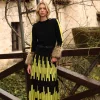 La falda Querin en lima ofrece un diseño llamativo gracias a su patrón gráfico en tono crudo, compuesto por líneas verticales desiguales que crean un efecto visual dinámico.