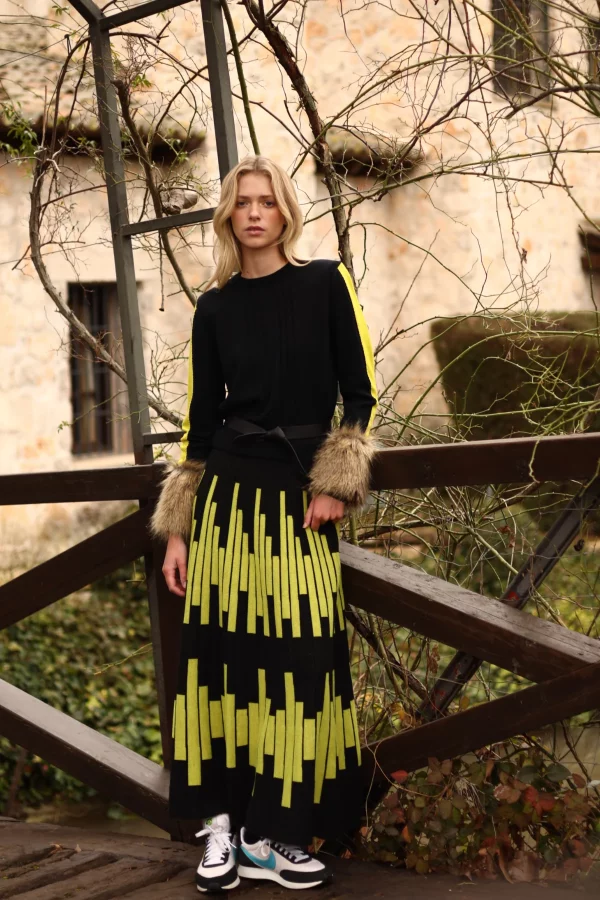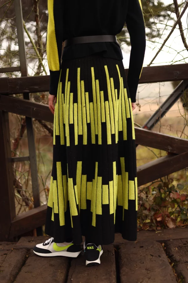Confeccionada en punto, se ajusta cómodamente a la cintura antes de abrirse en un vuelo sutil y elegante. Su caída fluida y su estructura plisada la hacen ideal para aportar movimiento y carácter al conjunto, equilibrando el diseño geométrico con una silueta femenina y sofisticada.