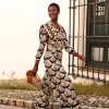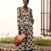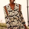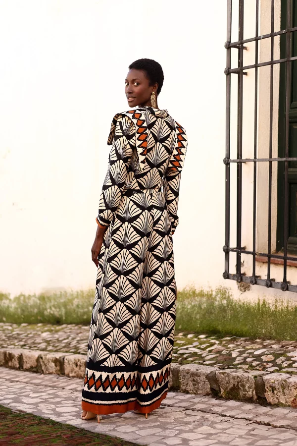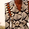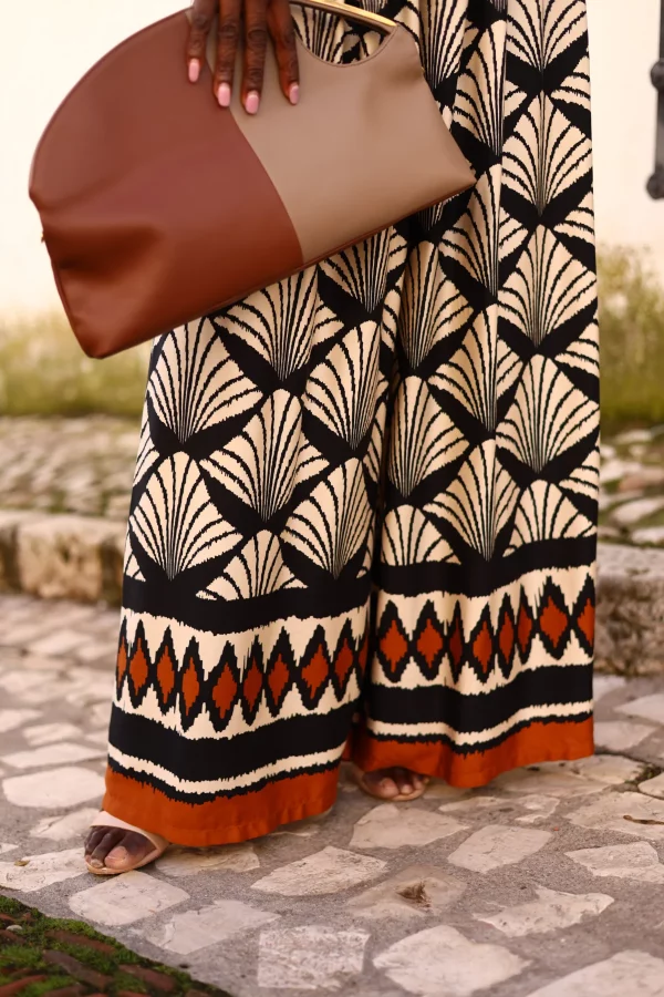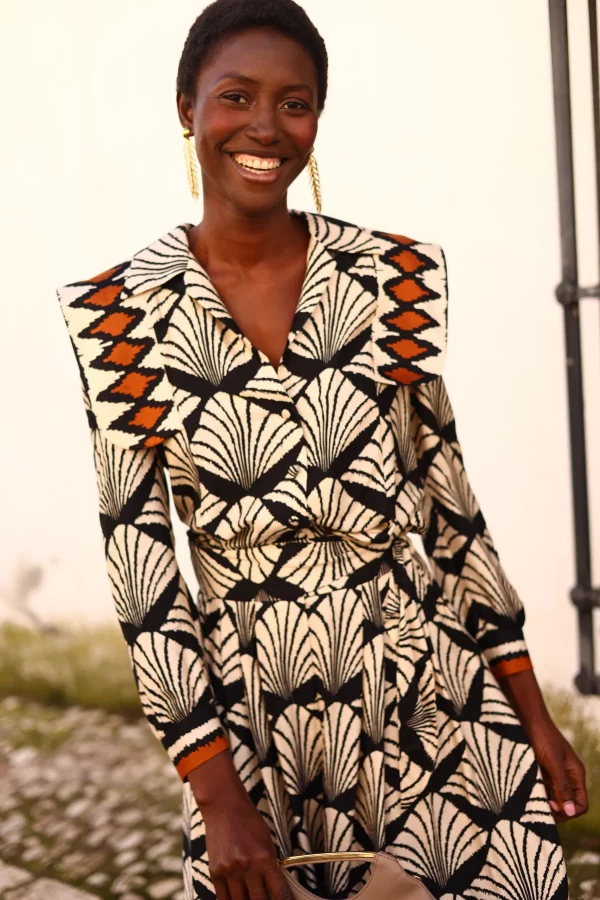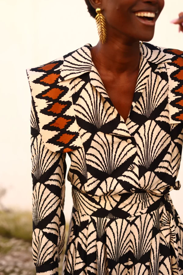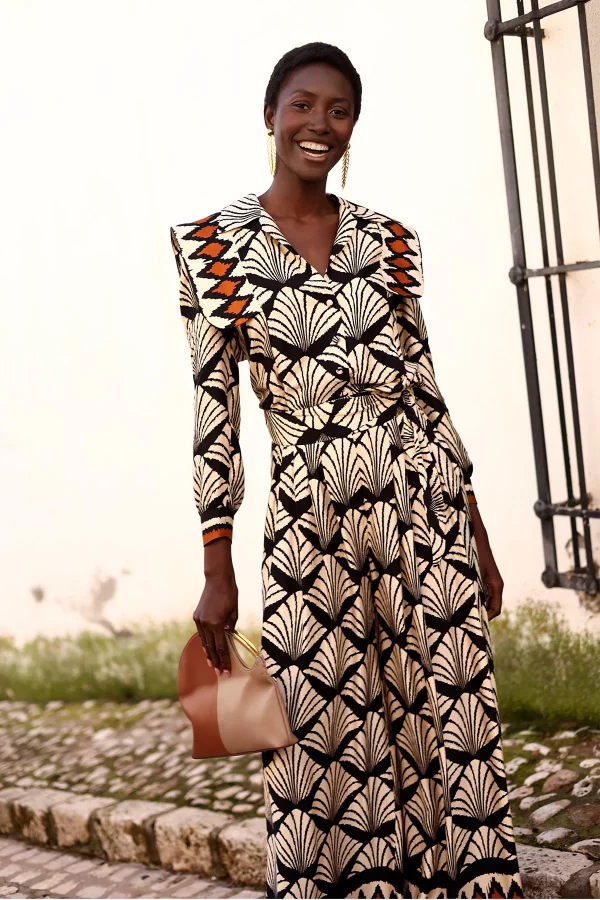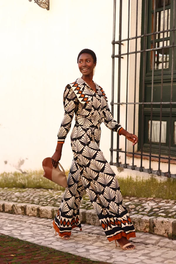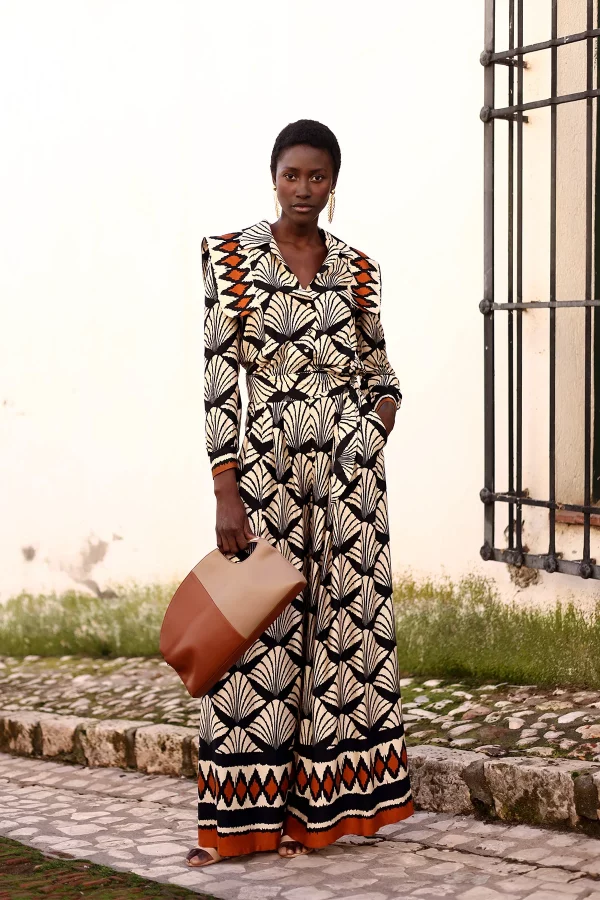 Una pieza que habla por sí sola. El conjunto Rami está confeccionada en tejido ligero con un estampado gráfico de inspiración art déco en tonos neutros y toques tierra que elevan cualquier look. Su silueta estructurada con hombreras marcadas y cuello XL la convierte en un diseño de fuerte personalidad, ideal para mujeres que apuestan por la elegancia con carácter.