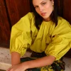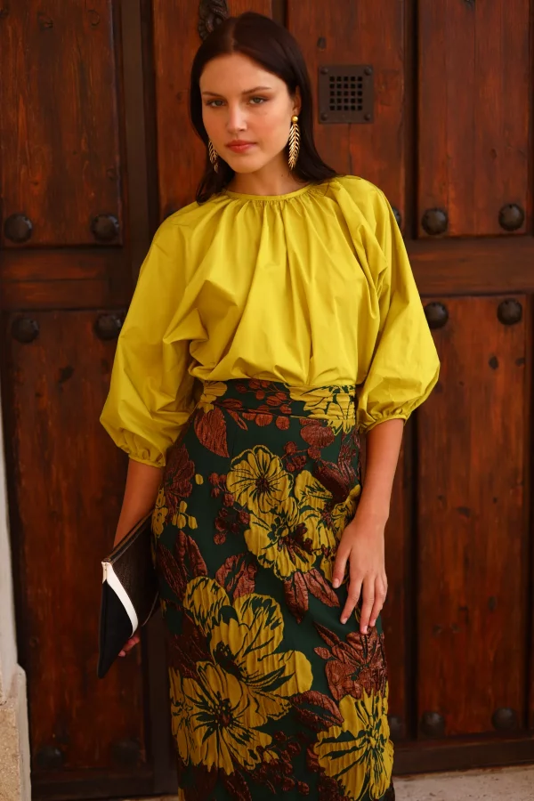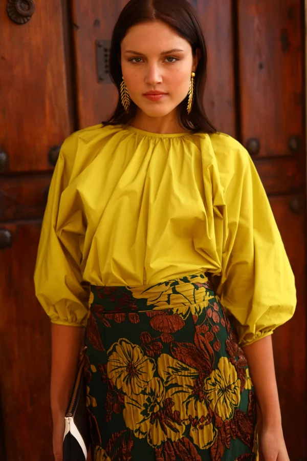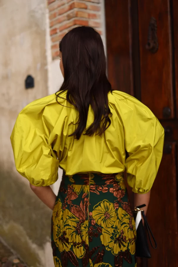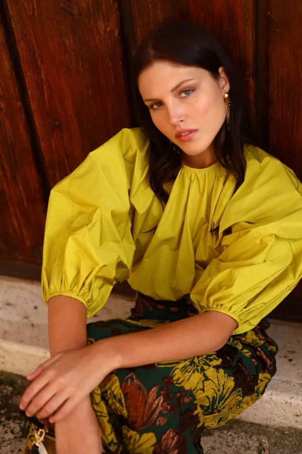 La camisa Remi es pura expresión: confeccionada en un tejido estructurado con volumen natural, su diseño con escote fruncido y mangas abullonadas la convierte en una prenda luminosa y con fuerza propia.