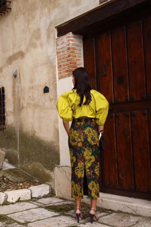 Las flores de gran tamaño aportan un aire artístico y evocador, convirtiendo esta prenda en el centro de cualquier look. De cintura alta y largo por debajo de la rodilla, la falda Remi es ideal para ocasiones especiales o para elevar conjuntos de diario con un toque audaz.