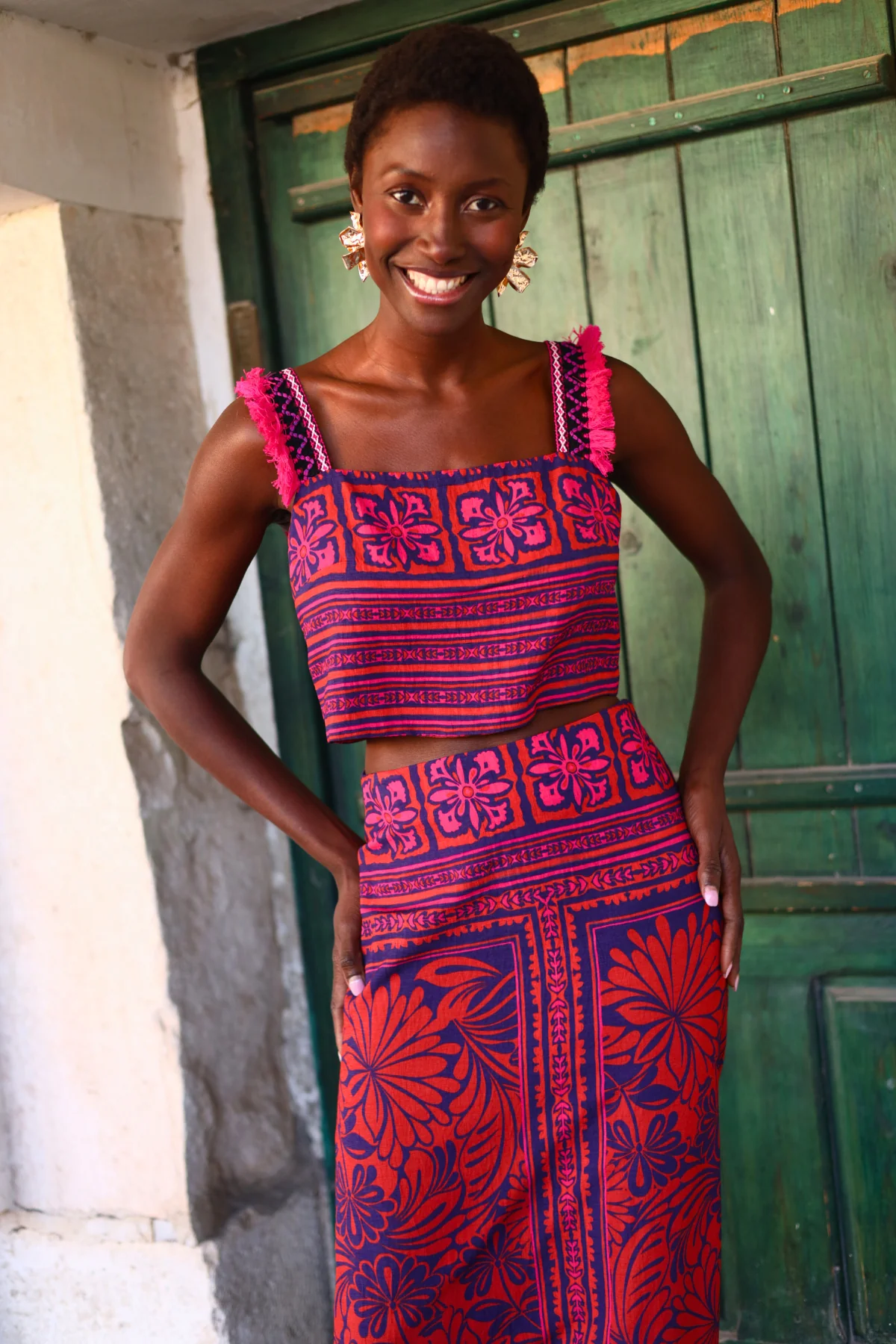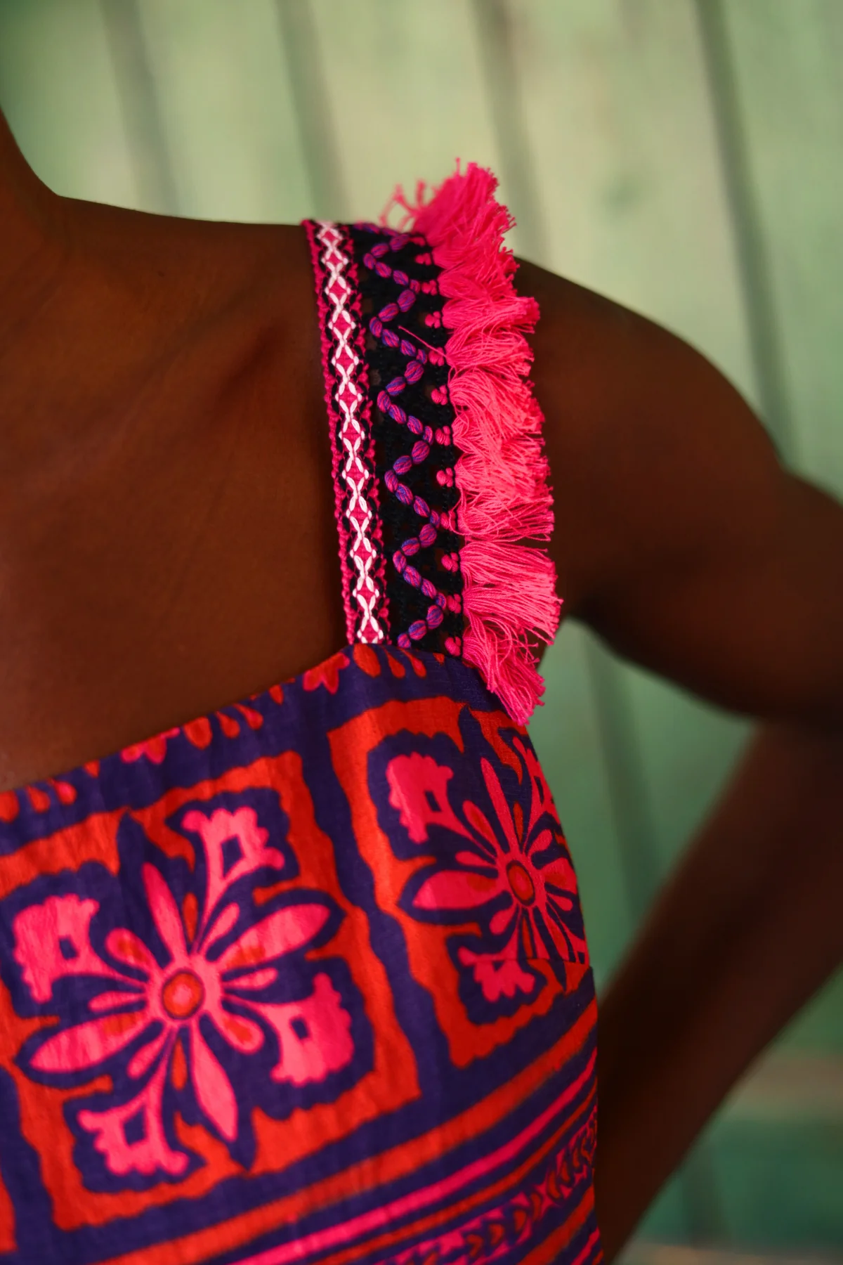 Top de tirantes anchos destaca por su colorido vibrante en tonos fucsia y morado, con bordados geométricos intrincados que realzan su estilo artesanal. Su corte recto y escote cuadrado aportan una silueta sofisticada, ideal para ocasiones casuales o para lucir con elegancia en eventos. Combínalo con faldas o pantalones de talle alto para un look fresco y femenino.