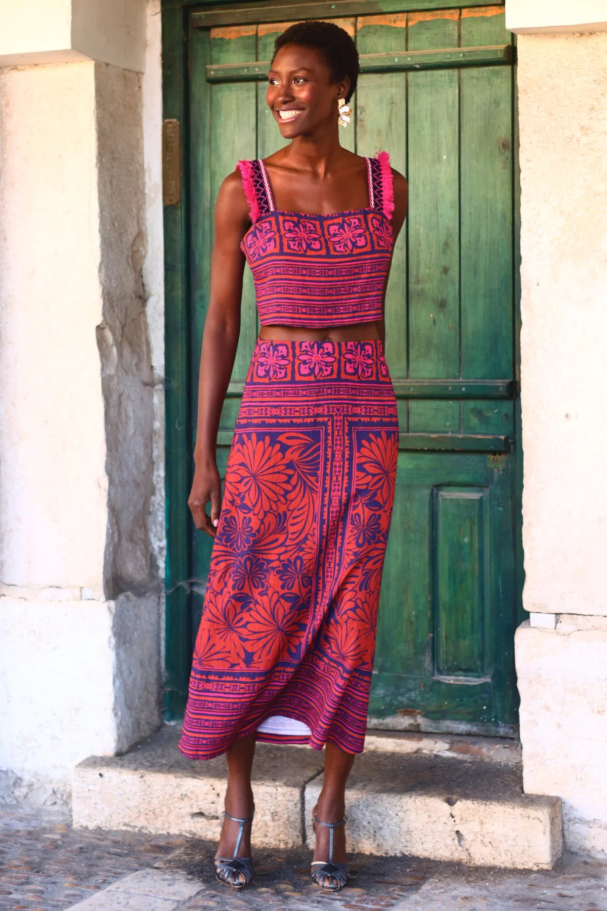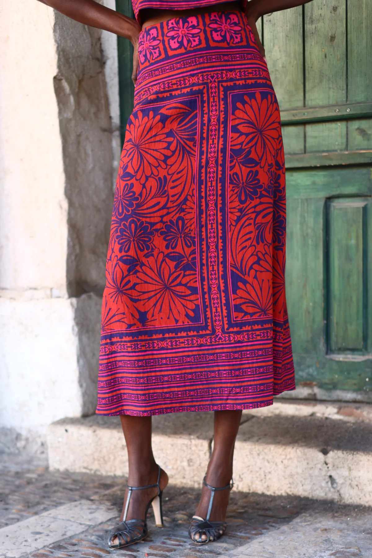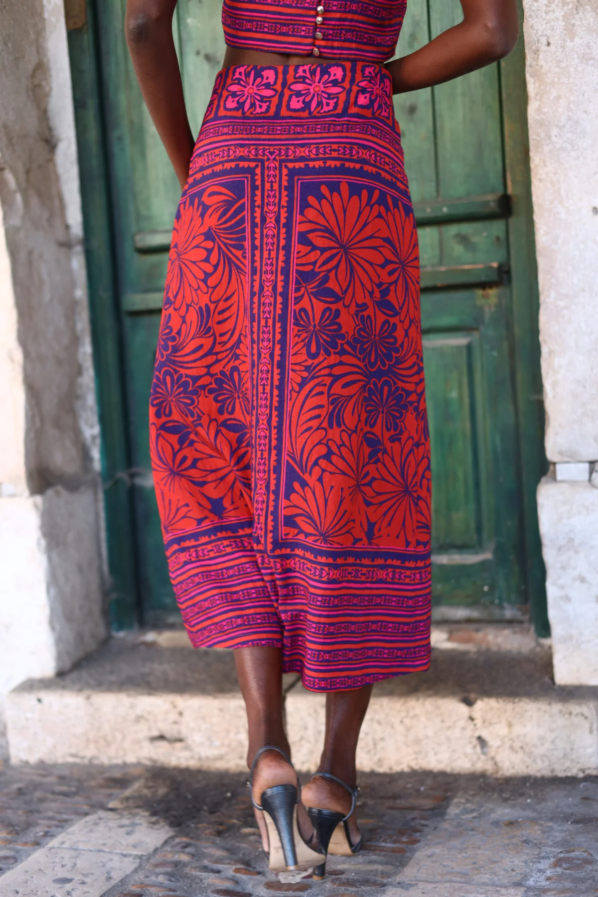 Confeccionada en un tejido de tonos vibrantes y estampados florales, esta falda midi aporta un aire bohemio y elegante. Su corte recto y talle alto estilizan la figura, mientras que su tejido ligero y suave proporciona comodidad en cada movimiento. Perfecta para complementar con tops básicos o atractivos y sandalias para un look chic de día o de noche.