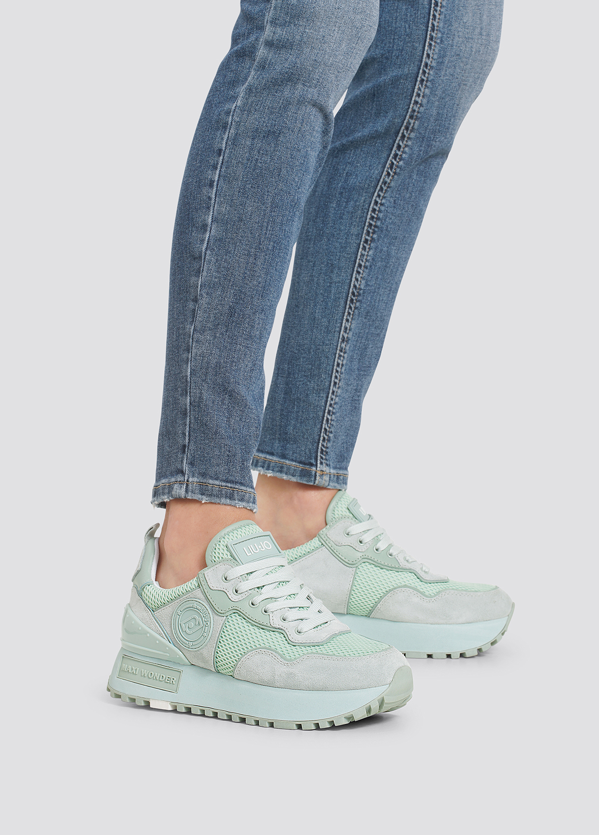 Deportiva ante y tejido con pala de raso iridiscente, logotipo metálico dorado aplicado en el lateral, talonera de efecto metalizado y cordones planos de algodón. Suela de plataforma con logotipo estampado y dentada de goma.