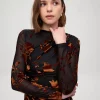 Tejido elástico tul negro con flores en terciopelo marrón