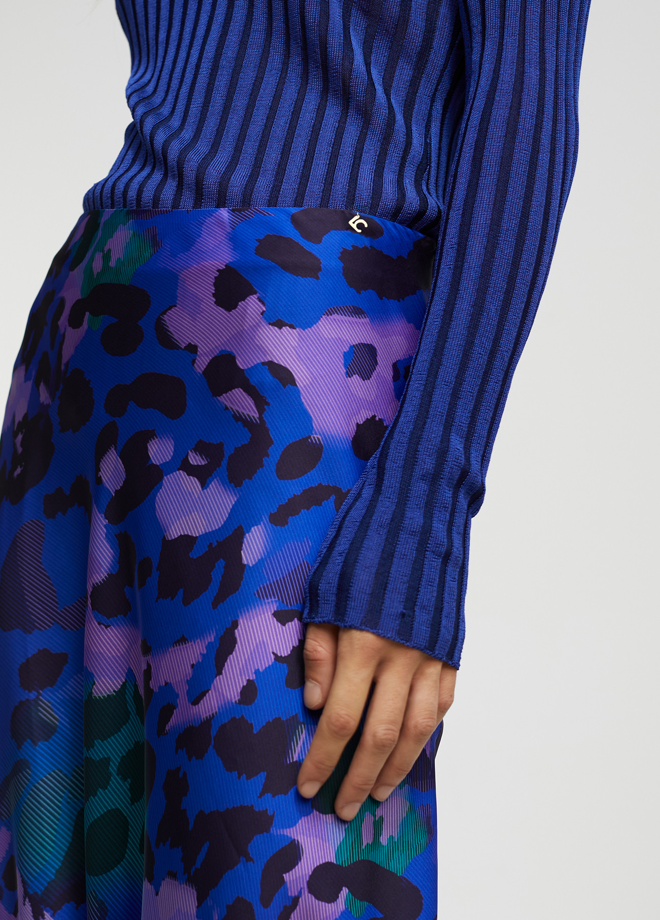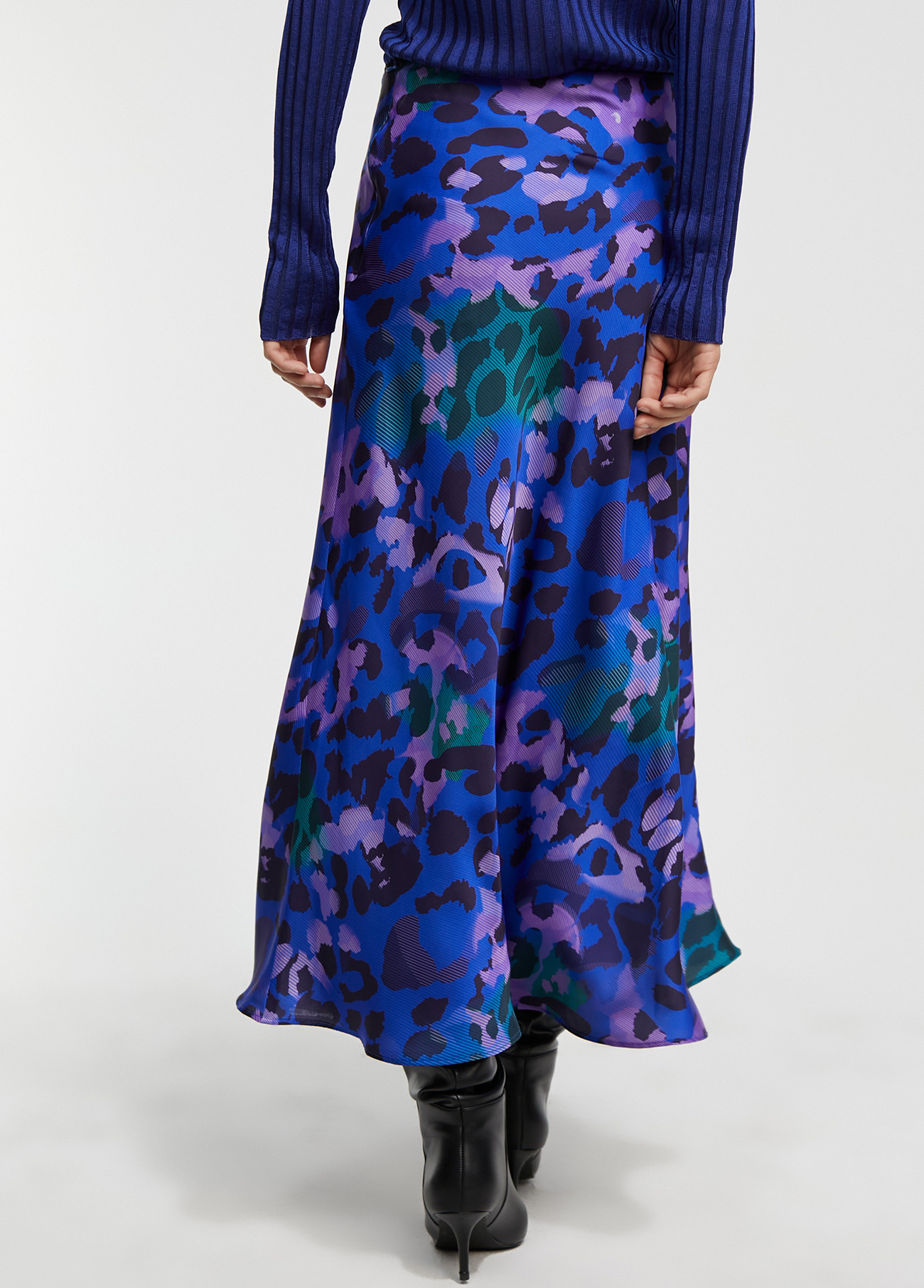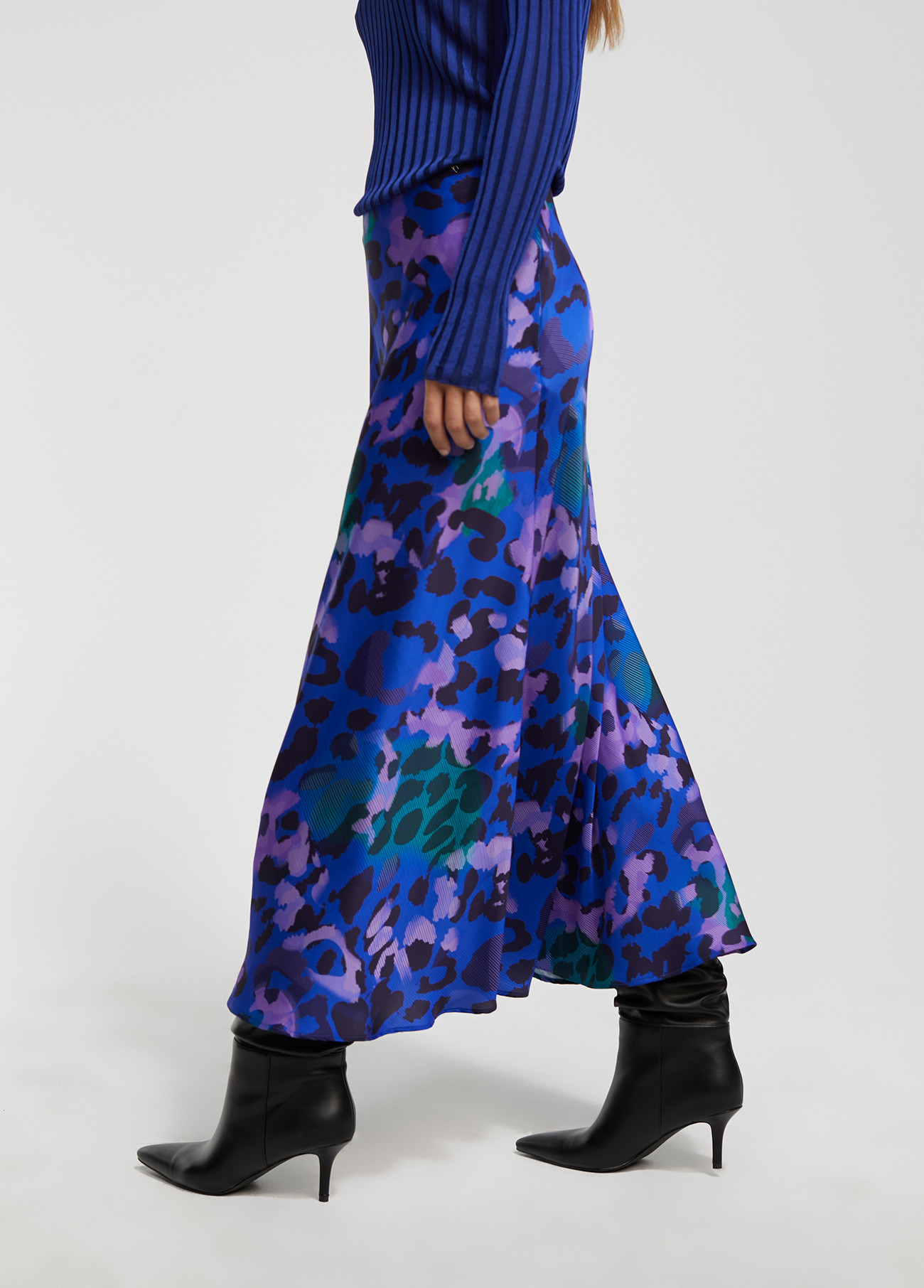 Falda en estampado animal print. De tejido fluido. Cerrada con cremallera lateral.