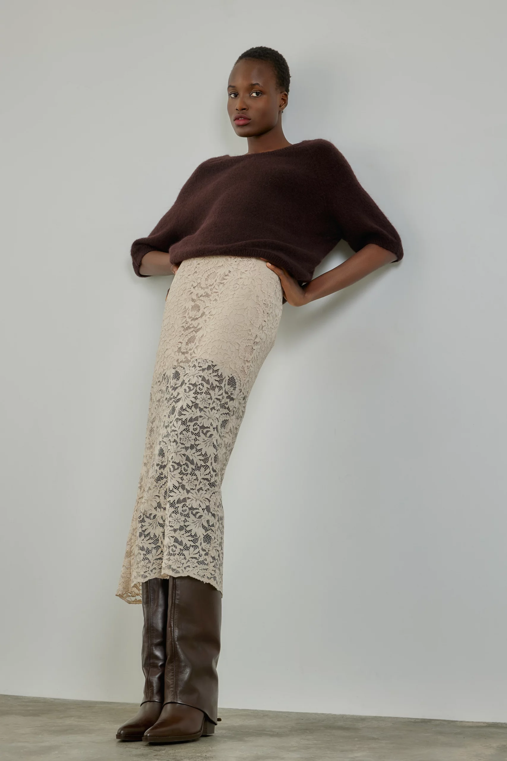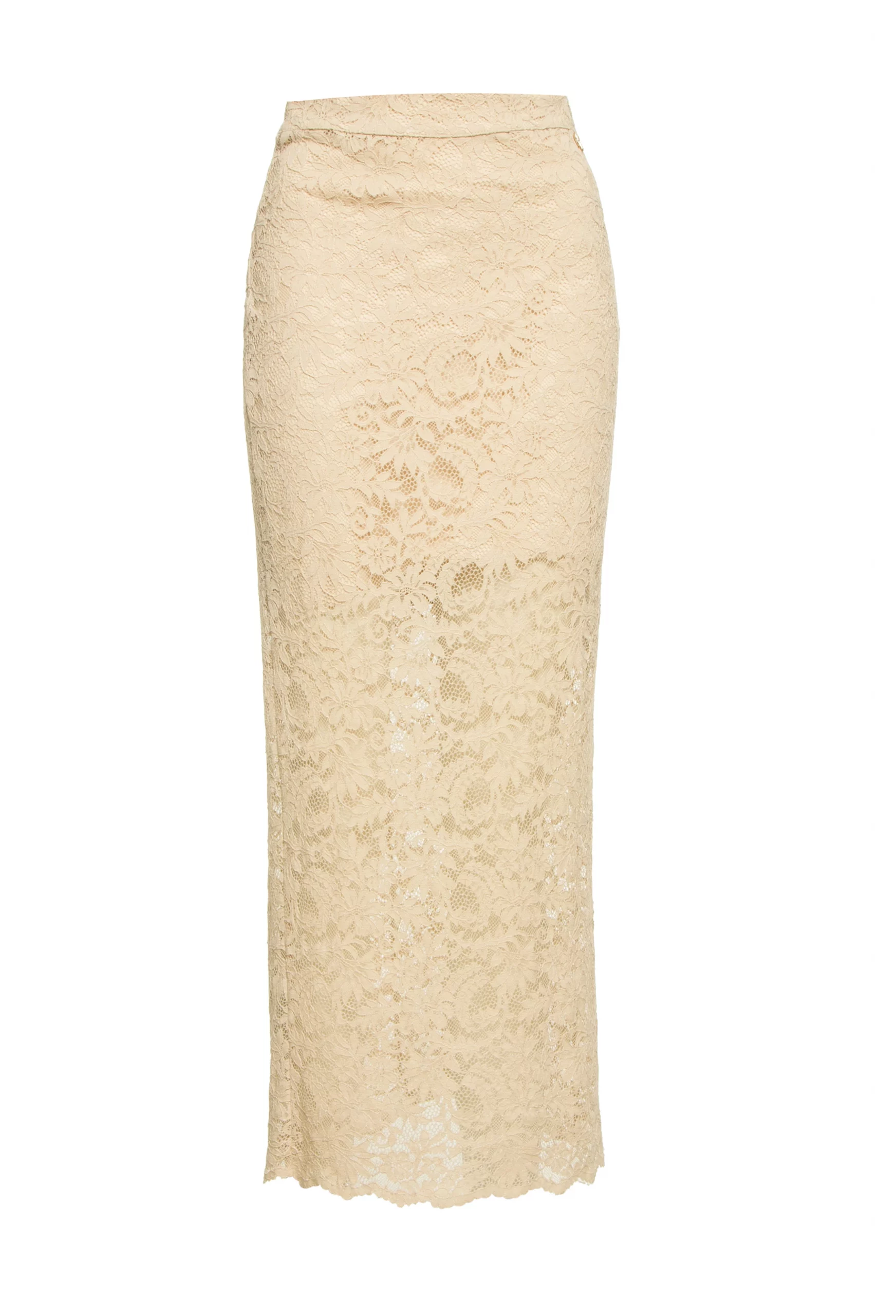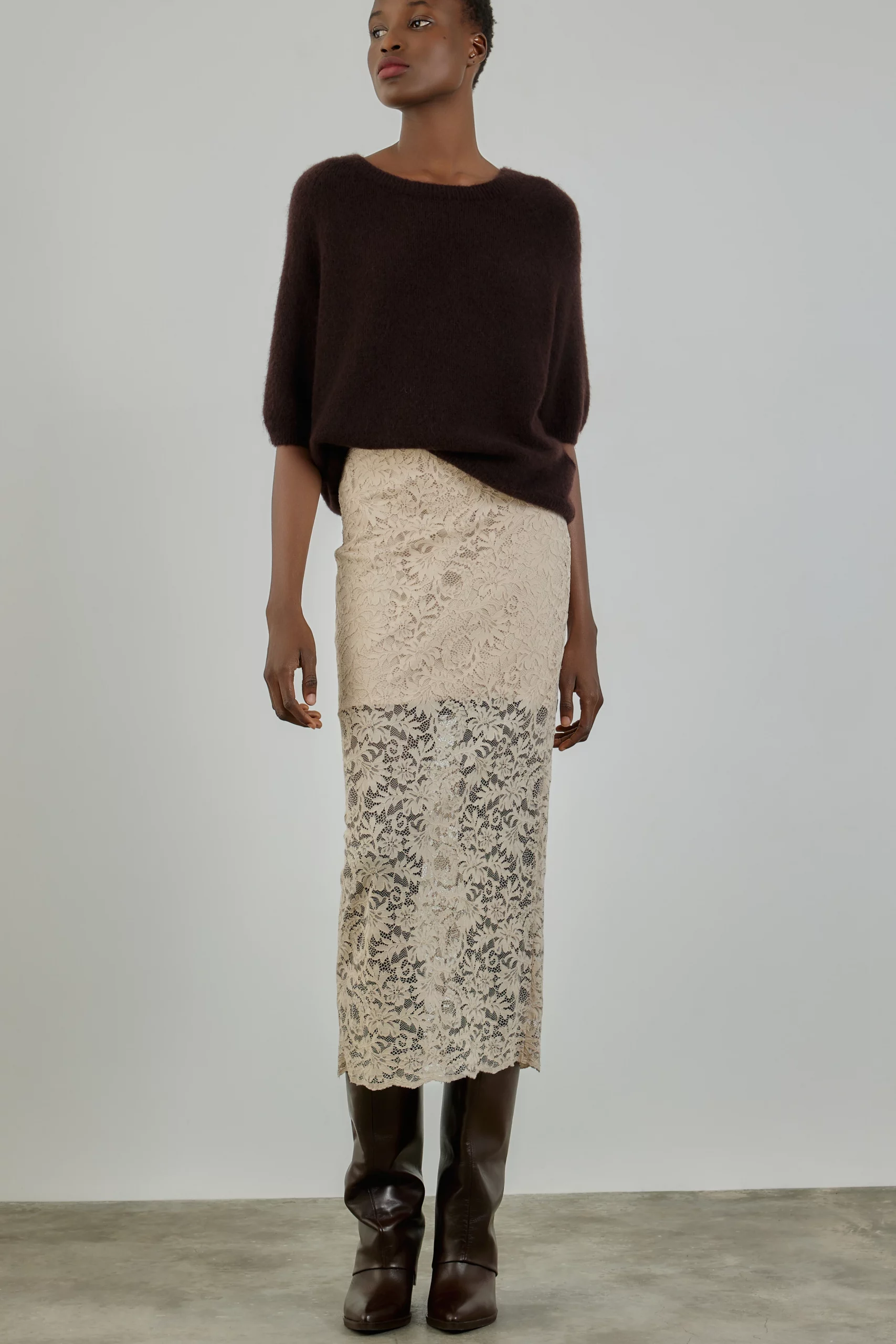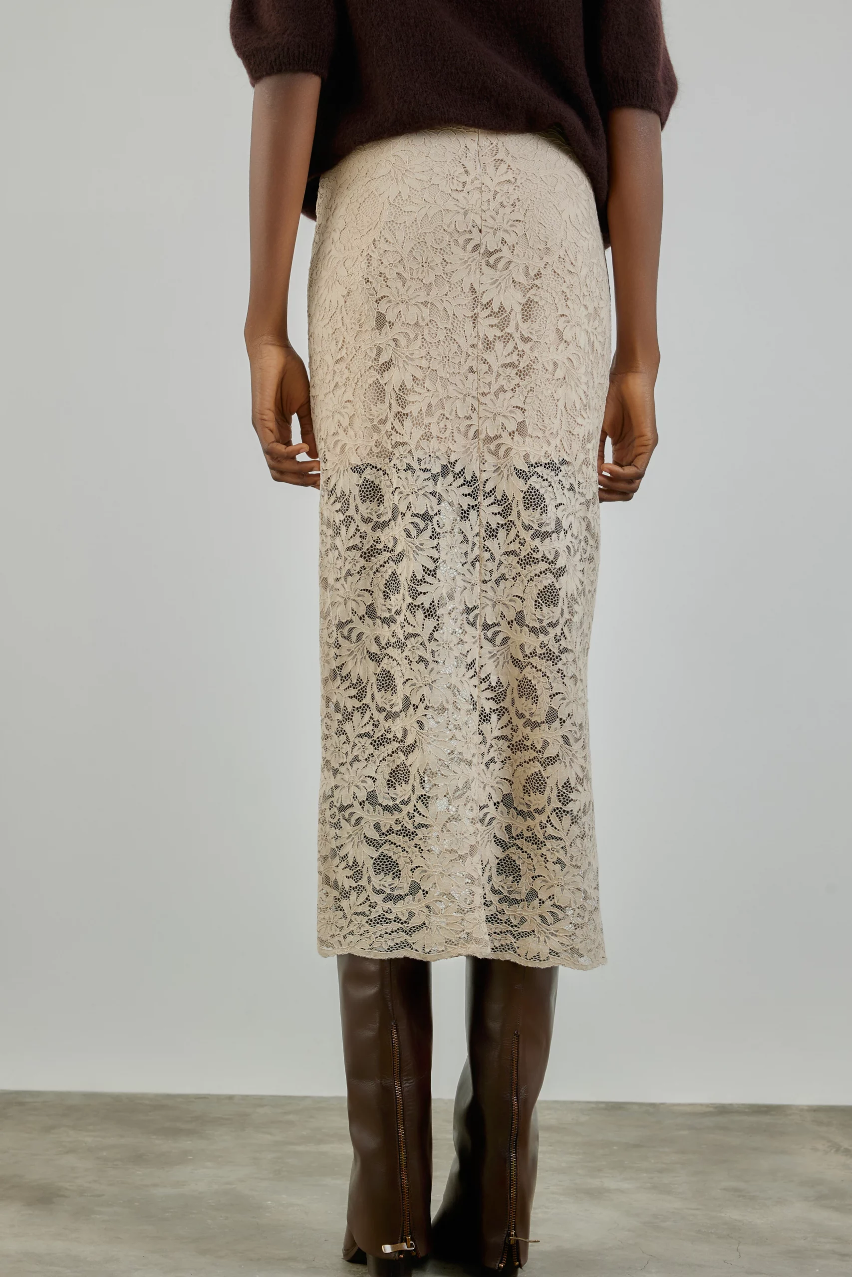 Falda midi, encaje, cintura elástica, forro interiro, diseño recto, aberturas