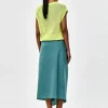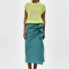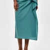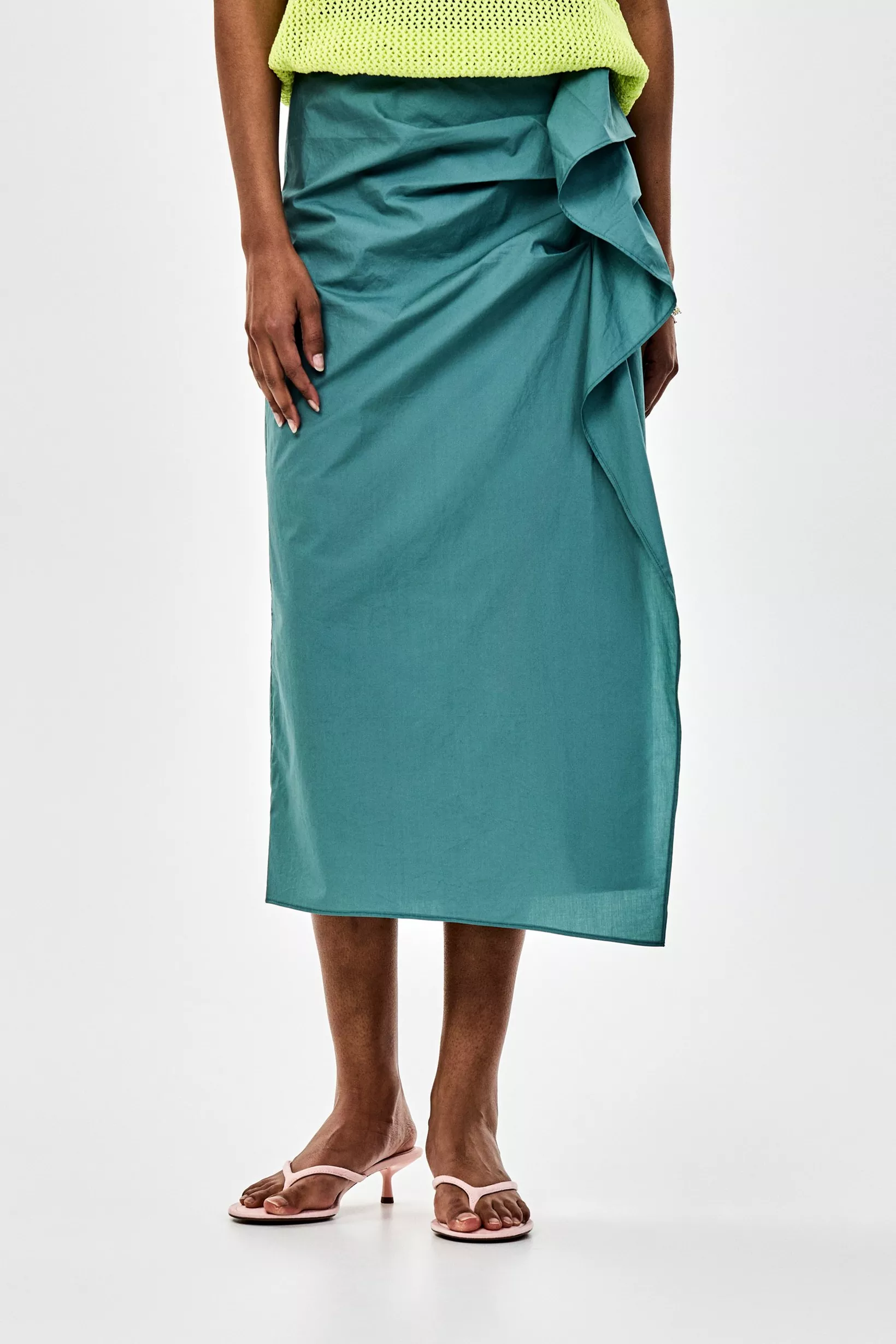 Falda midi verde para mujer con llamativos volantes laterales que le dan un toque festivo. Esta falda tan original es perfecta para una ocasión especial con una blusa elegante, o también queda genial con una camiseta para después.