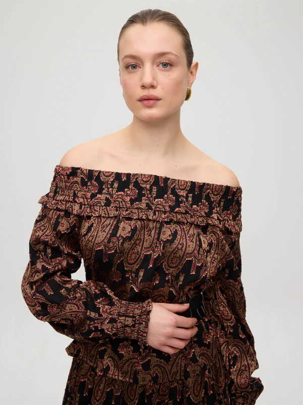 HENNA BLACK TOP – Top escote bardot nido de abeja