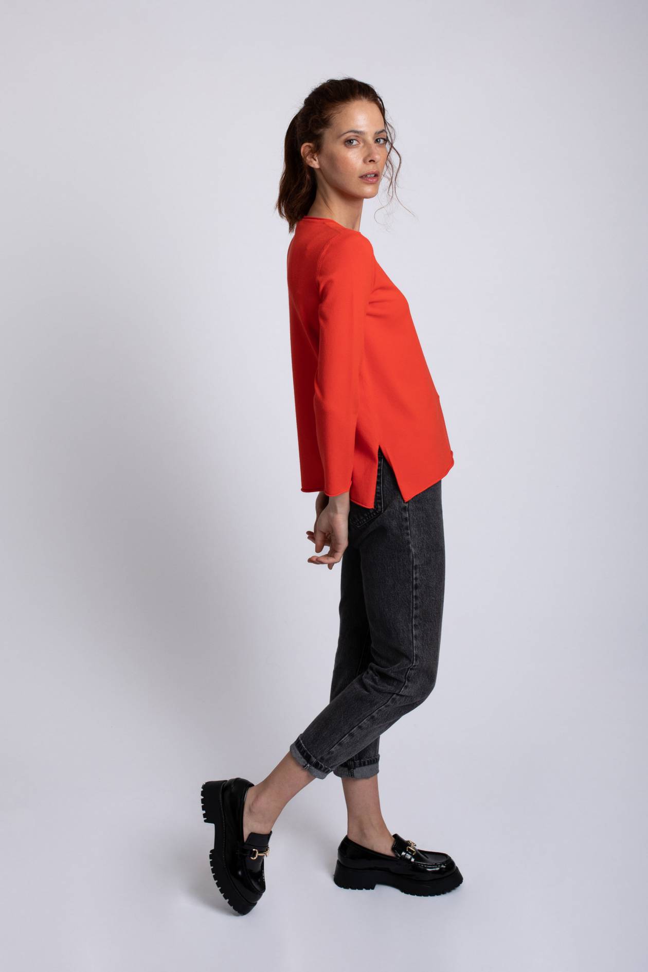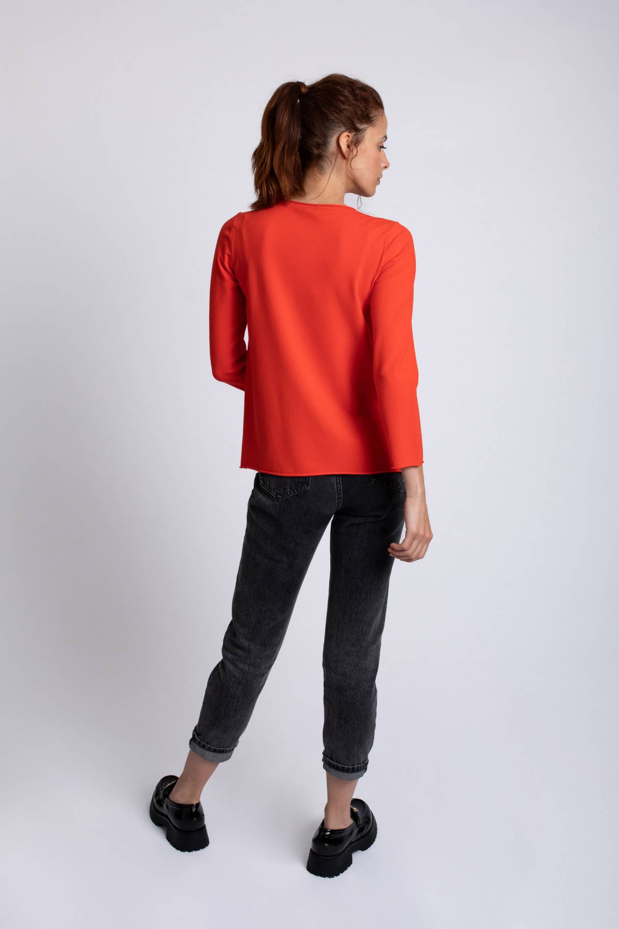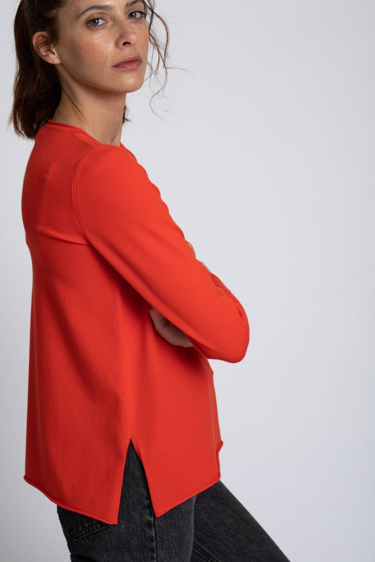 Jersey básico de punto fino en color rojo con cuello redondo, manga larga y aberturas laterales