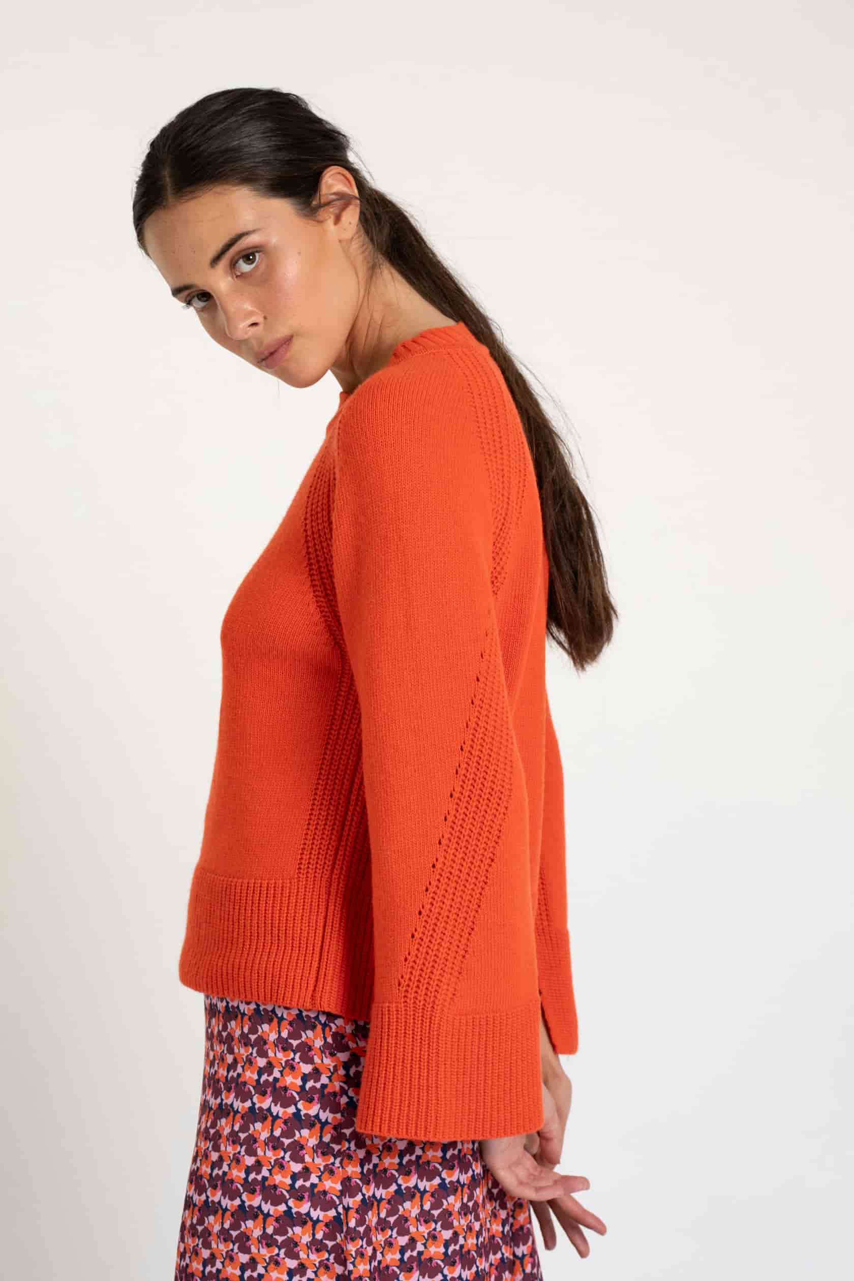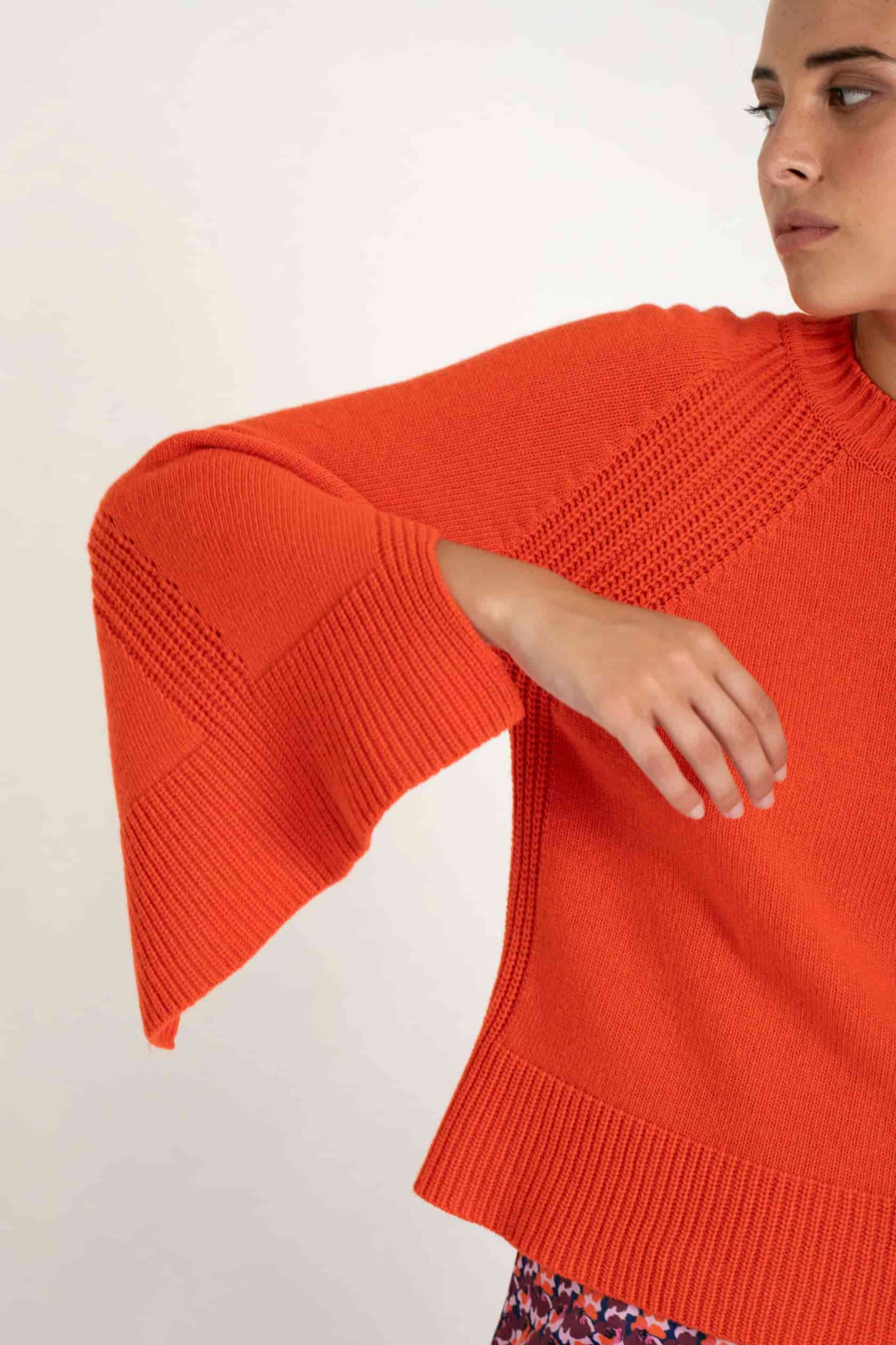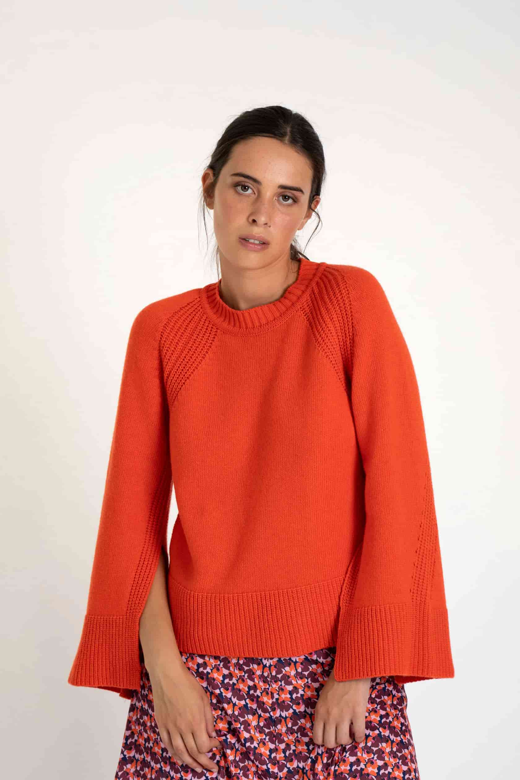 Jersey de punto tricot. Modelo de corte evasé con manga ranglan y cuello redondo. Manga larga acampanada con aberturas hasta el codo