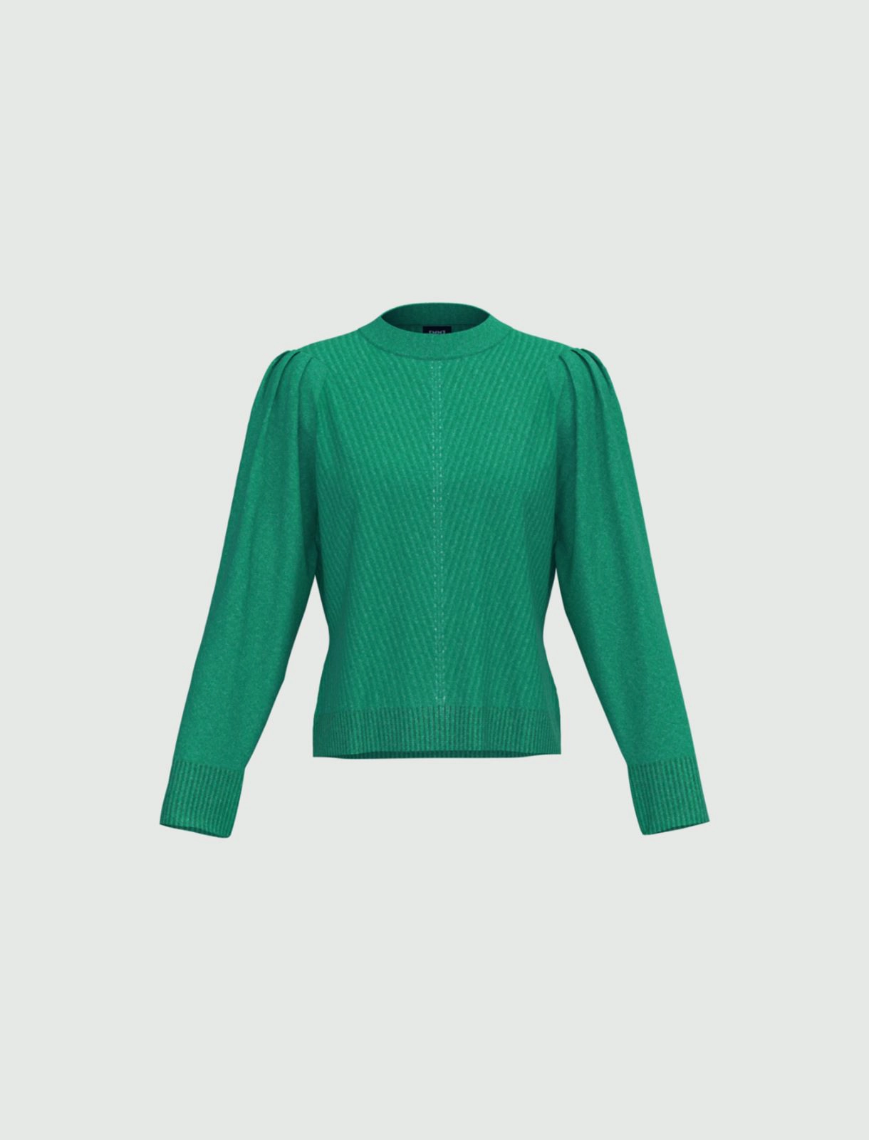 Jersey de mohair con lúrex de canalé diagonal, de corte recto. Cuello redondo y manga larga abullonada.