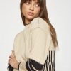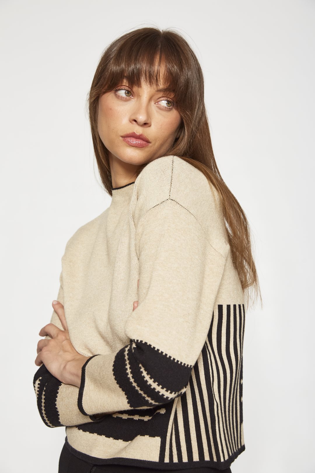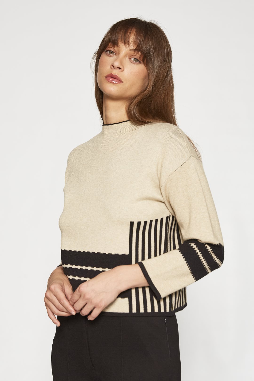 Jersey de punto con patrón de rayas horizontales y detalles gráficos en parte inferior y mangas. Cuello alto, puños y bajo con borde fino. Corte recto y ligeramente holgado