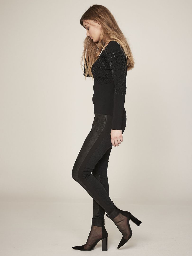 Preciosa blusa finamente tejida hecha de una tela de viscosa elástica súper hermosa que brinda una comodidad increíble. La blusa está decorada con pedrería negra brillante en la parte delantera y en la parte superior de las mangas, que le dan un aspecto sofisticado.