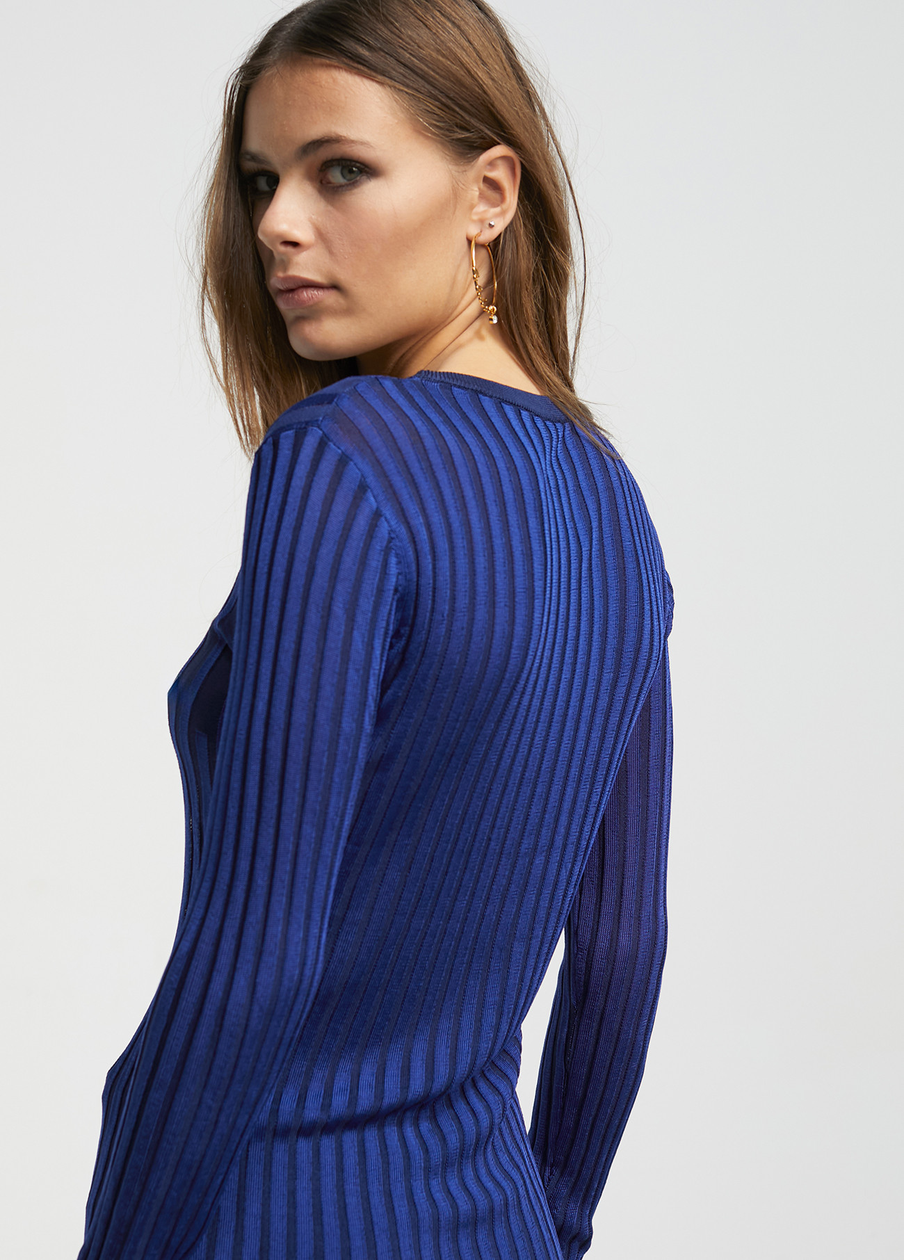 Jersey ajustado de cuello caja y manga larga. Punto de canalé bicolor.