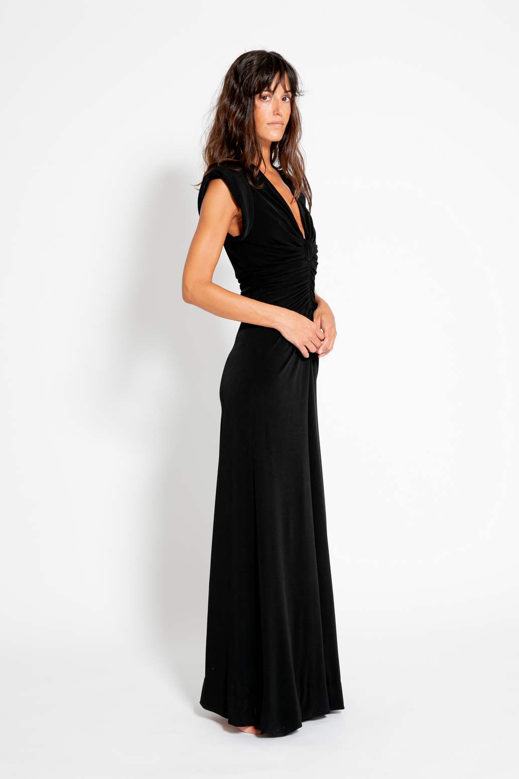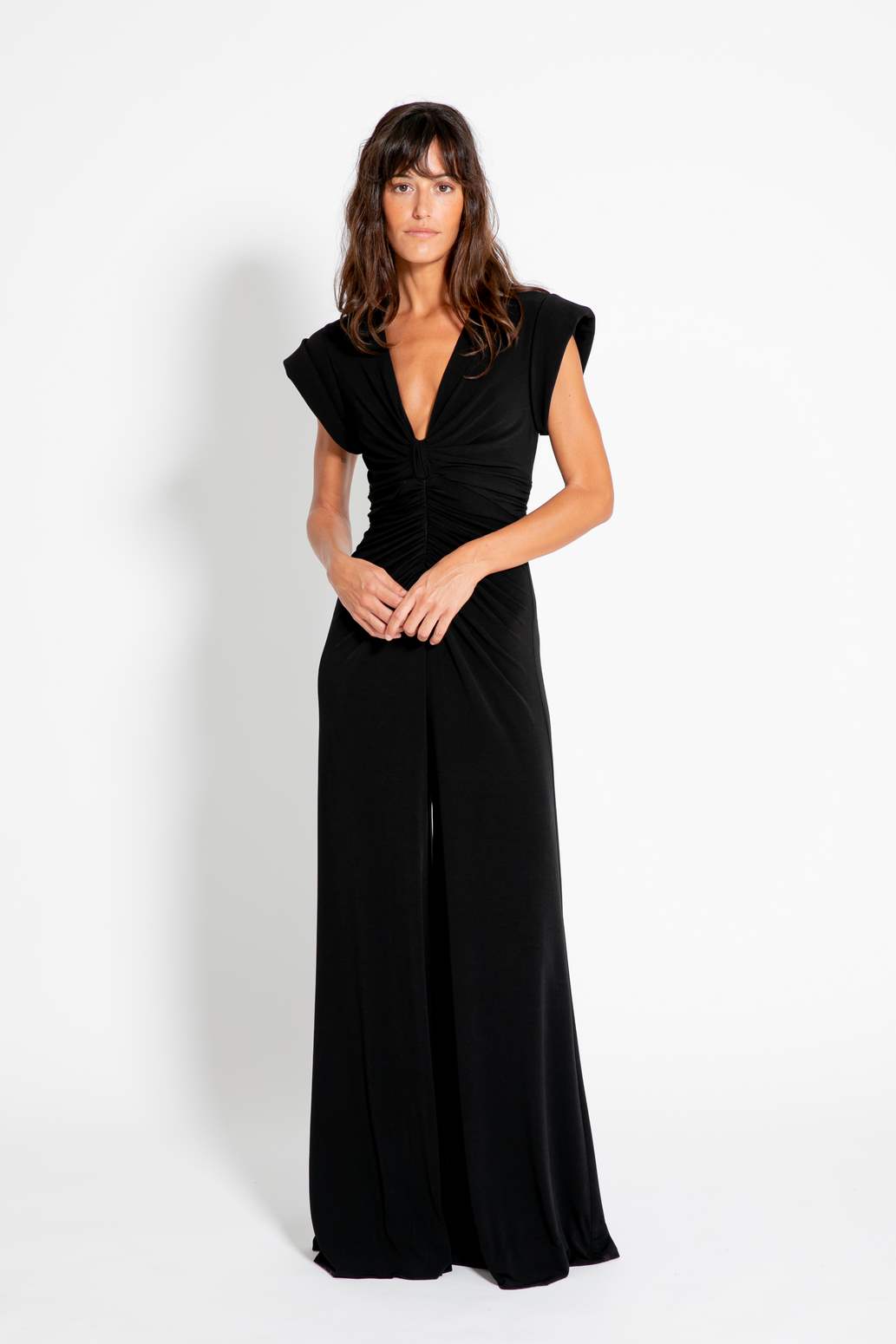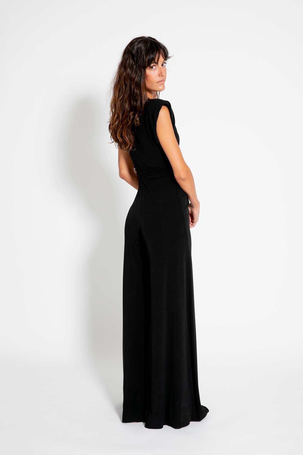 Mono anudado en punto con escote en pico. Tiene unas mangas cortas dobladas que hace efecto “sin mangas” y pantalón palazzo.