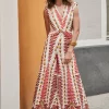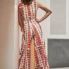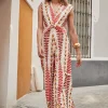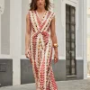Mono con estampado en tonos rojizos. Presenta escote en pico, detalle de drapeado a la cintura y pernera ancha que estiliza la silueta.