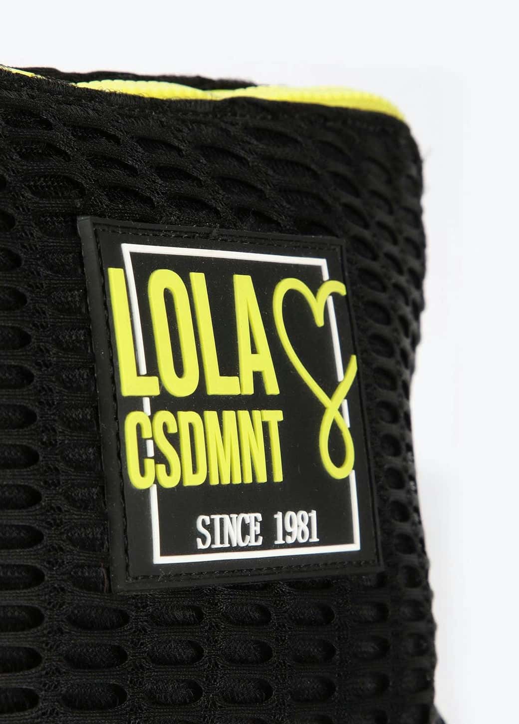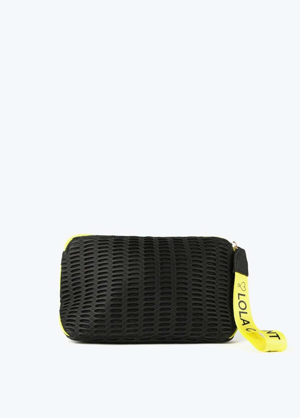 Neceser de rejilla en color negro combinado con logo y detalles en color flúor. Asa logotipada y cierre de cremallera.