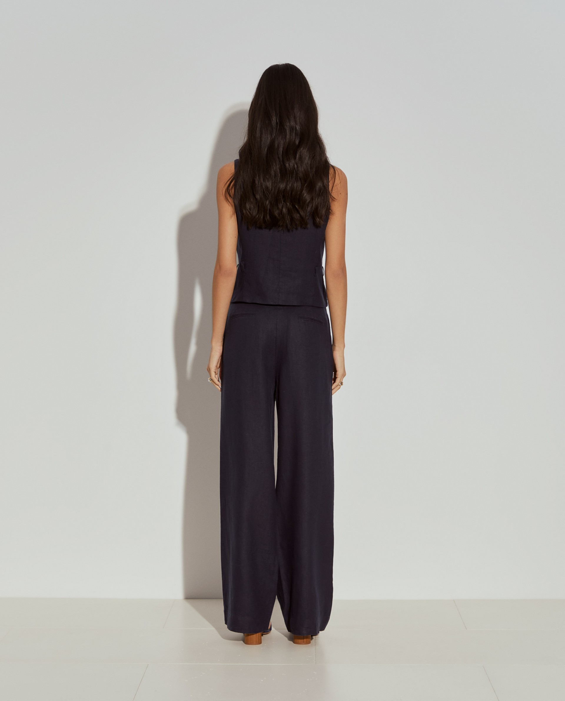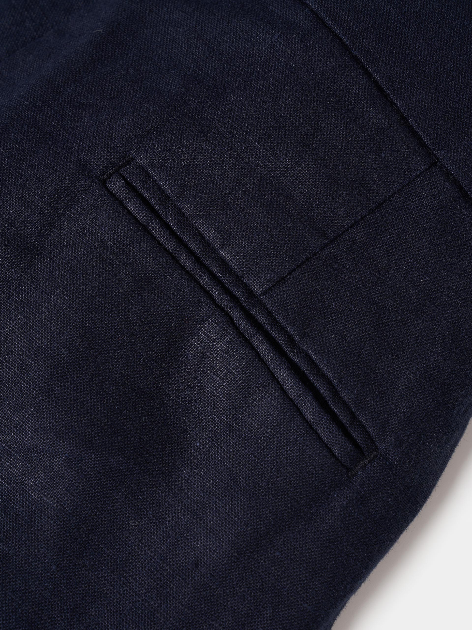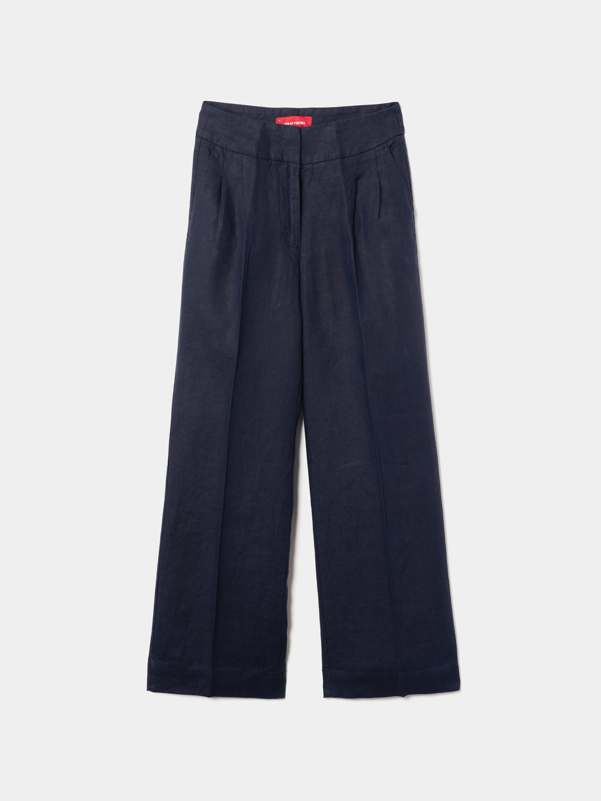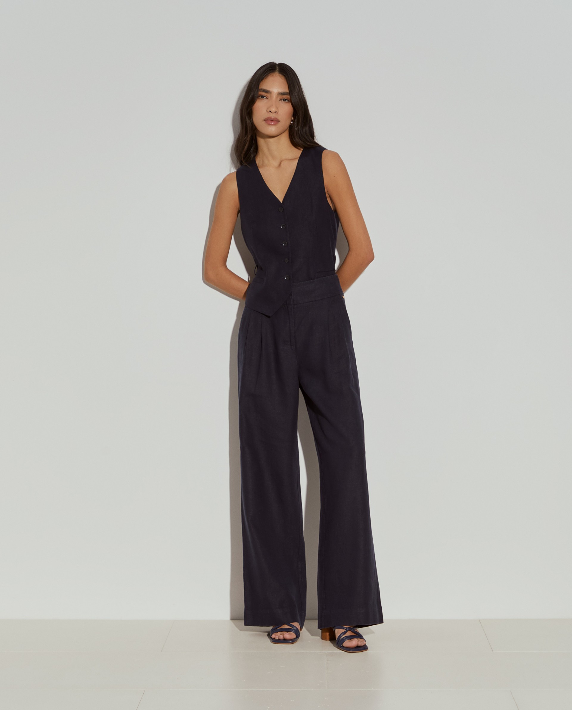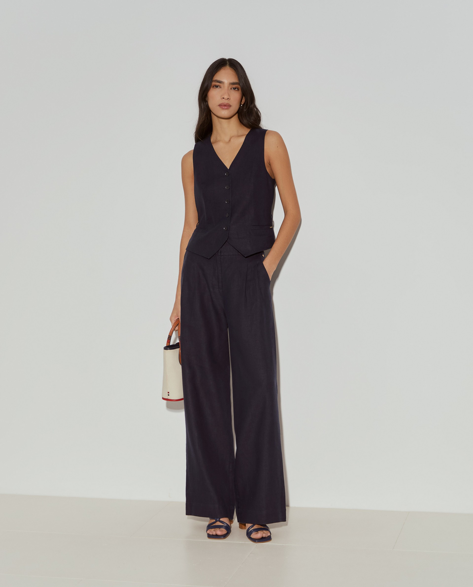 Pantalón ancho con pliegues en la parte delantera. El tejido de lino natural aporta comodidad y frescura, perfecto para climas más cálidos. También tienen dos bolsillos en la parte delantera y dos en la espalda. Perfecto para el día a día o para looks semiformales que valoren el equilibrio entre elegancia y comodidad. Complementa el look con el chaleco de lino de la misma colección
