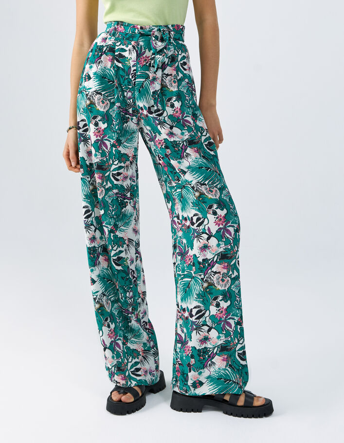 Pantalón ancho fluido verde con estampado vegetal
