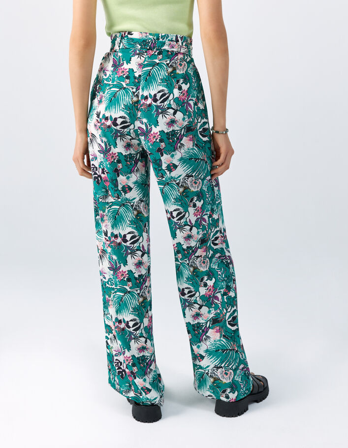 Pantalón de viscosa con estampado vegetal verde para mujer.