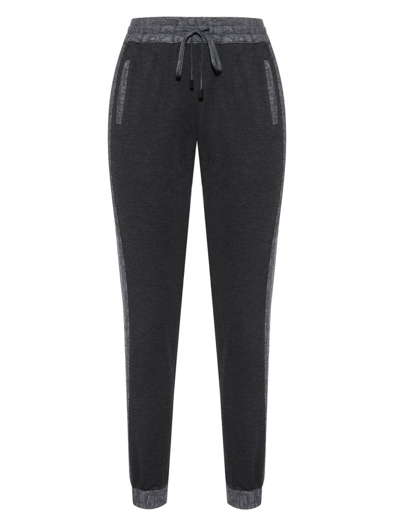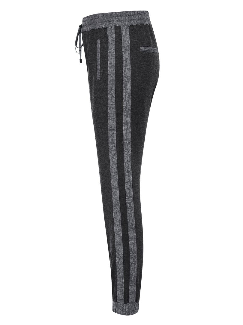 Estos geniales pantalones están confeccionados con un tejido de viscosa de punto fino increíblemente suave que proporciona una gran comodidad durante todo el día. Los pantalones tienen elegantes rayas que alargan las piernas a los lados y un ribete acanalado en un hermoso tono gris claro en los tobillos y en la cintura. Los pantalones también son de tejido elástico y tienen una cinturilla elástica con cordón, que asegura un ajuste cómodo.
