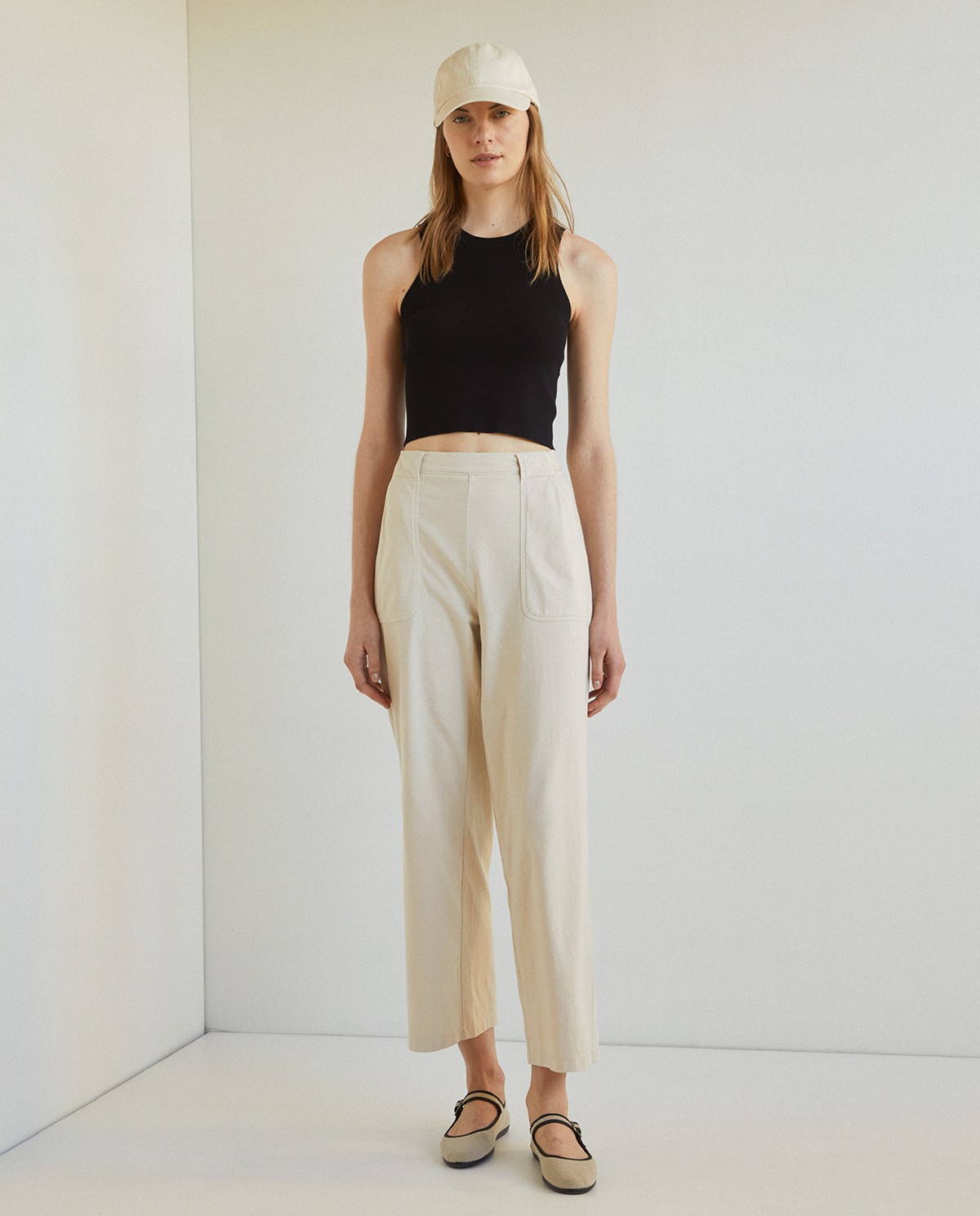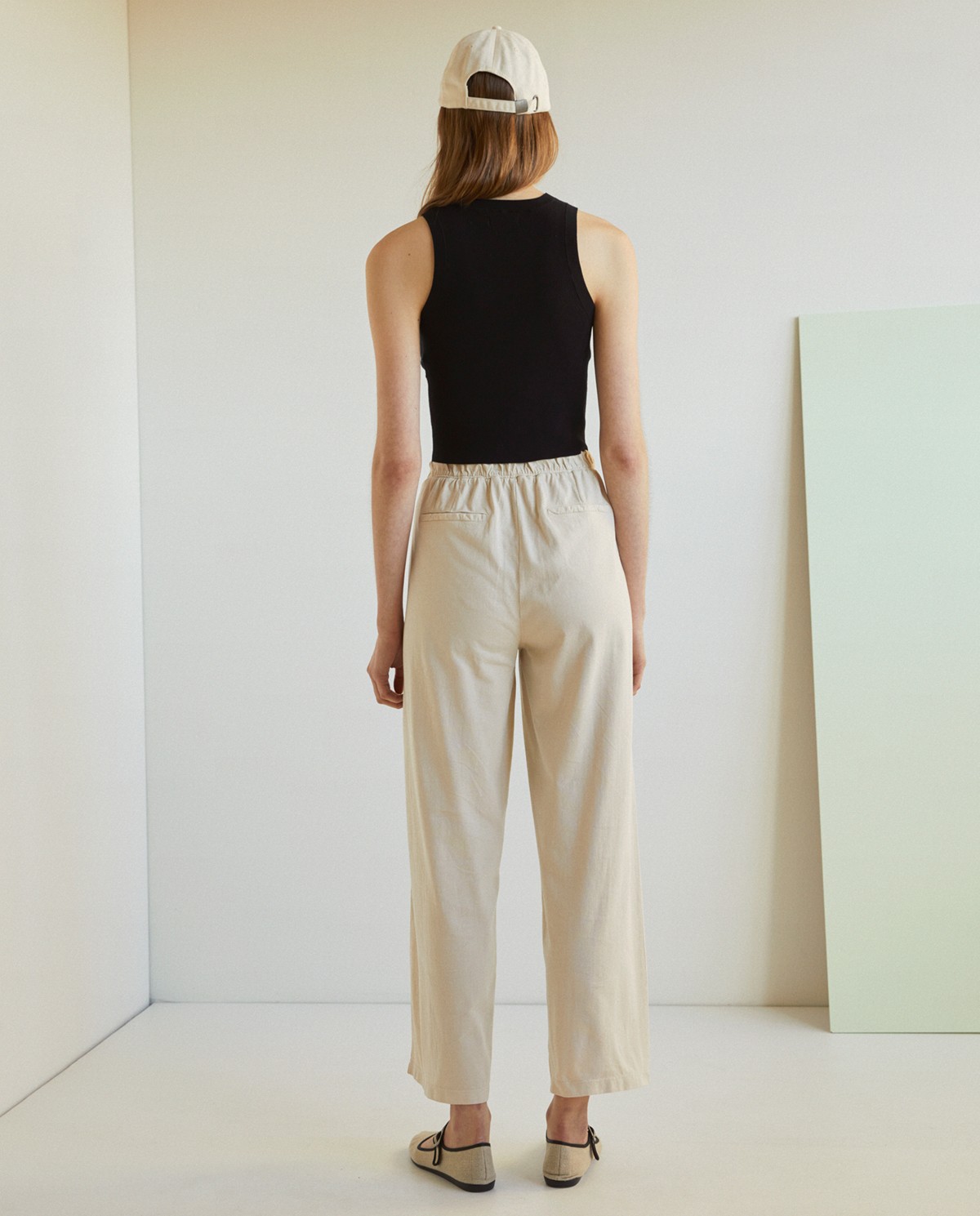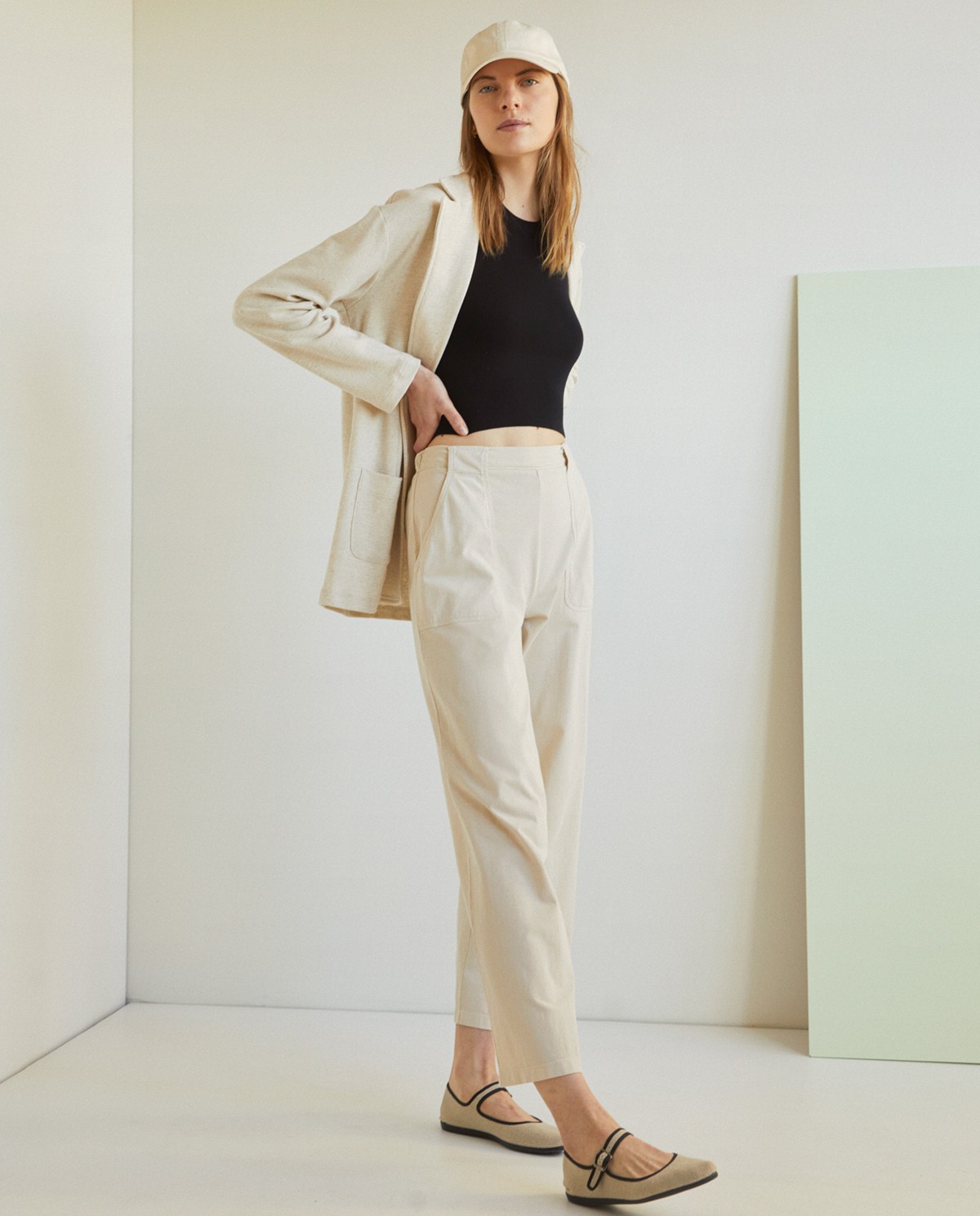 Pantalón ancho de punto. Fruncido en la cintura. Bolsillos laterales. Composición:100% algodón