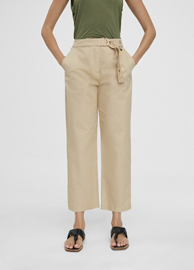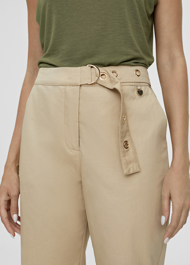 Pantalón recto con cinturón y hebilla dorada. Cerrado con cremallera frontal y gancho metálico interno. Bolsillos laterales.