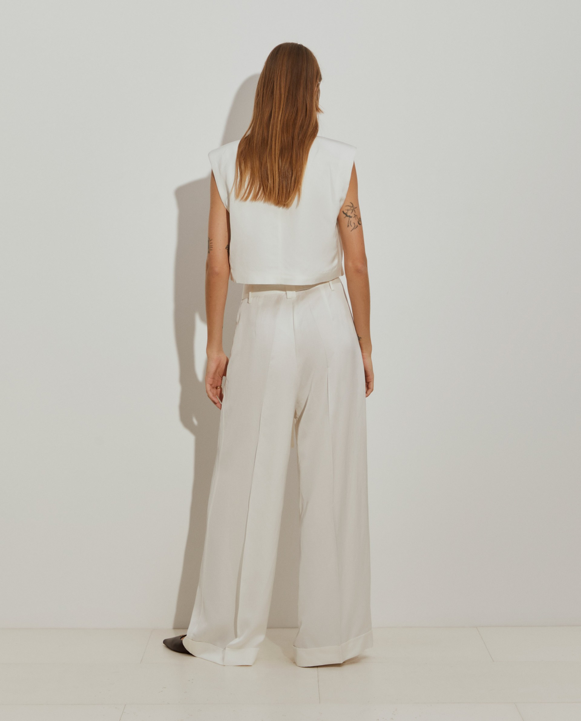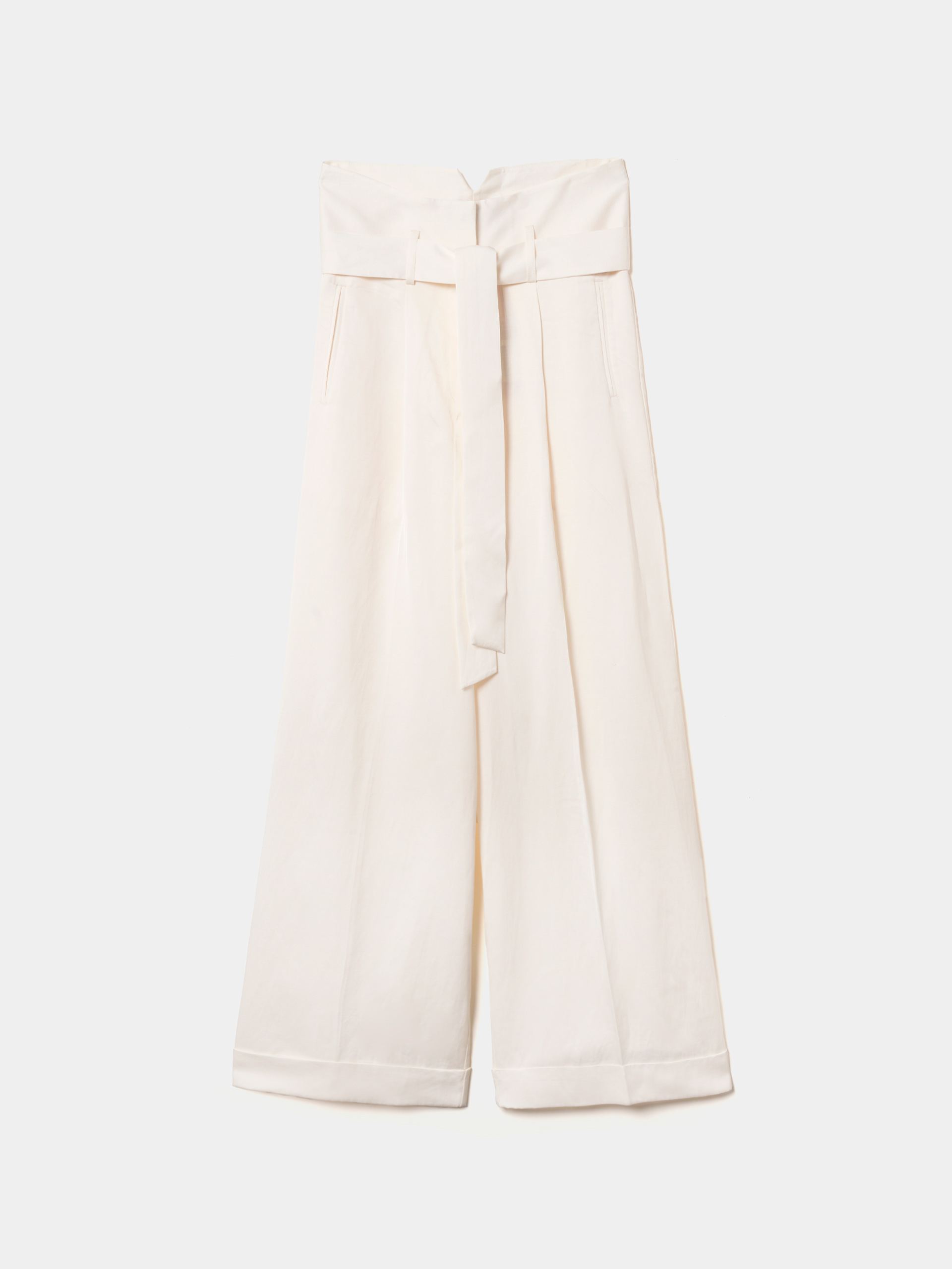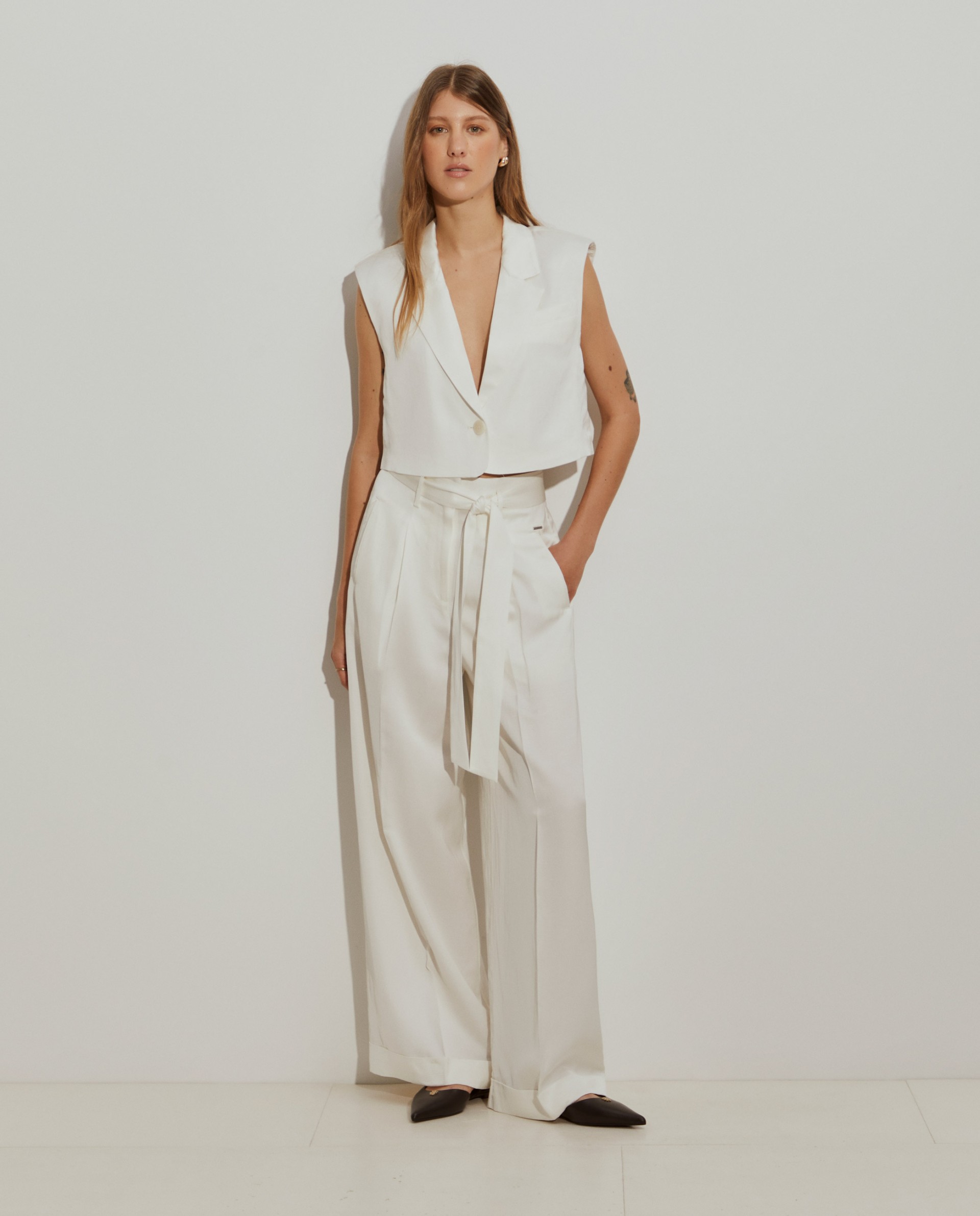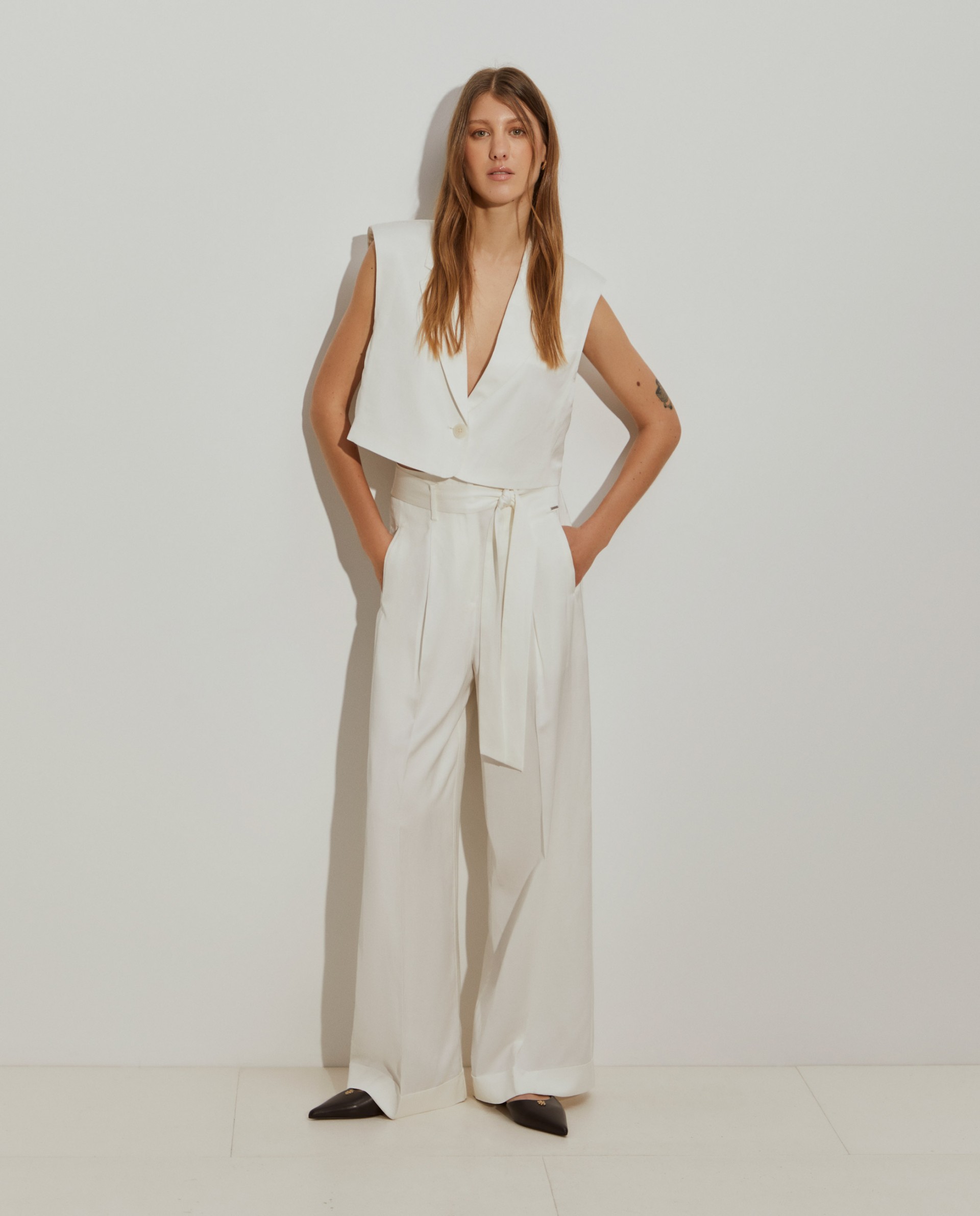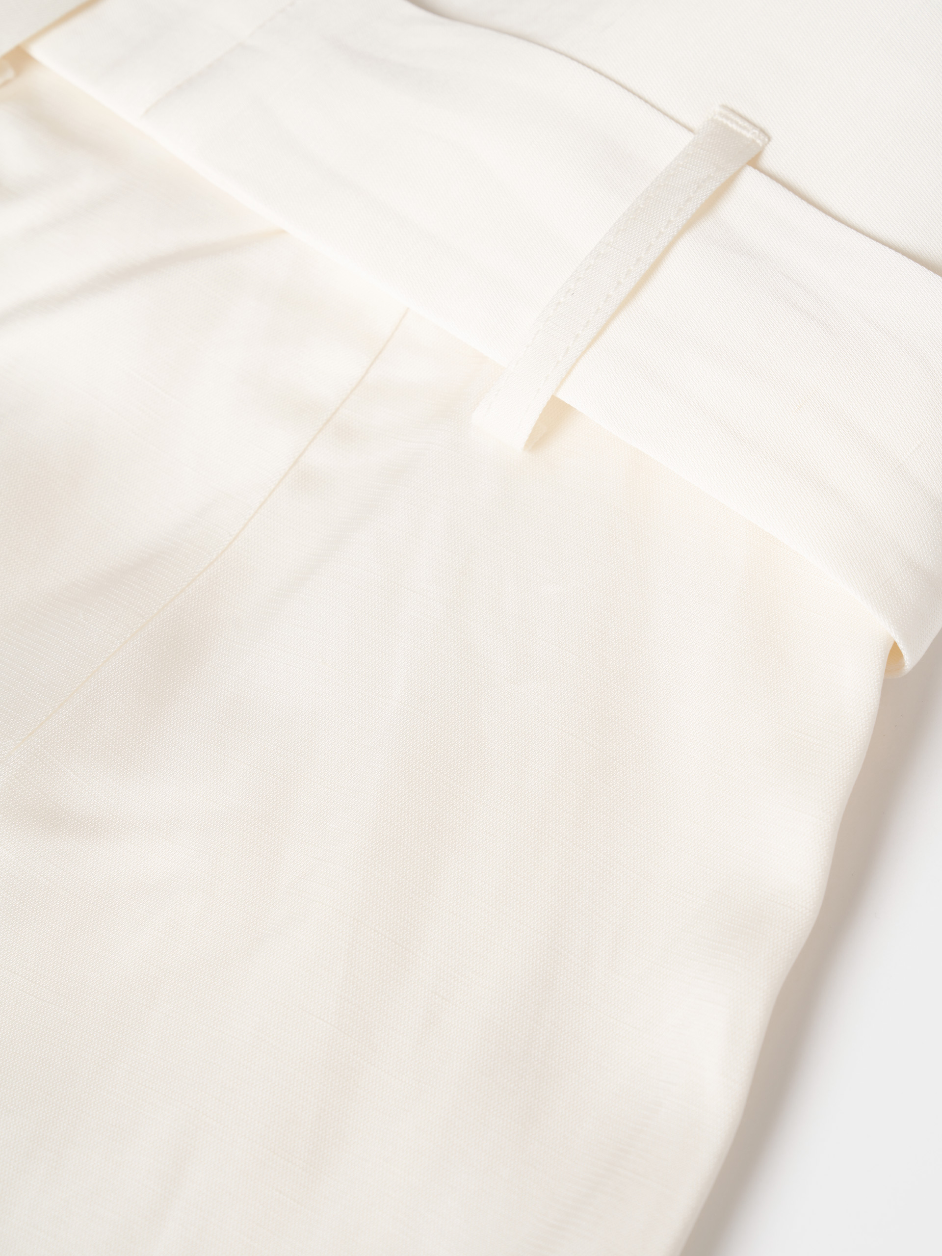 Pantalón, de cintura alta, con cinturón en el mismo tono y tejido para ajustar al gusto. El tejido confeccionado con una mezcla de lino le da un aspecto más ligero y rústico. Detalle de pliegue en el bajo. Tiene dos bolsillos en la parte delantera y dos sutiles pliegues en la parte superior. Para un look completo, mira también el chaleco de la misma colección.