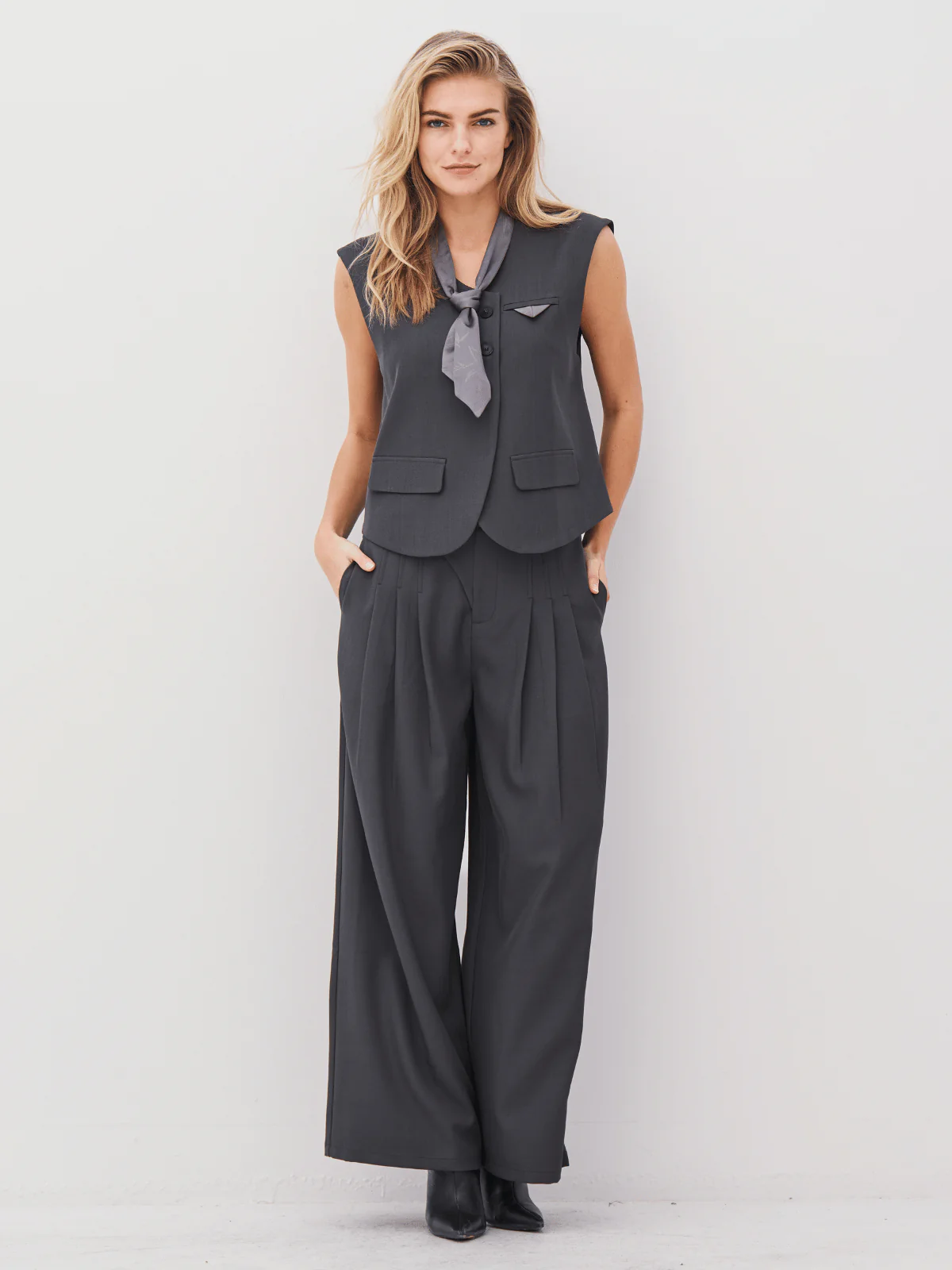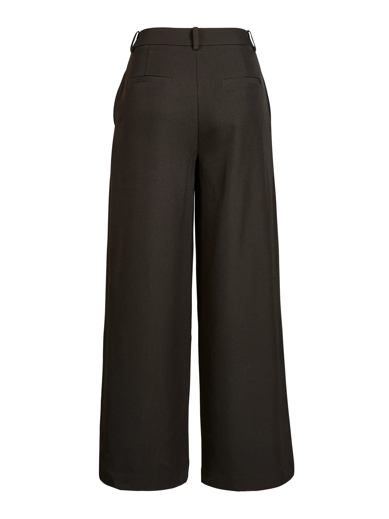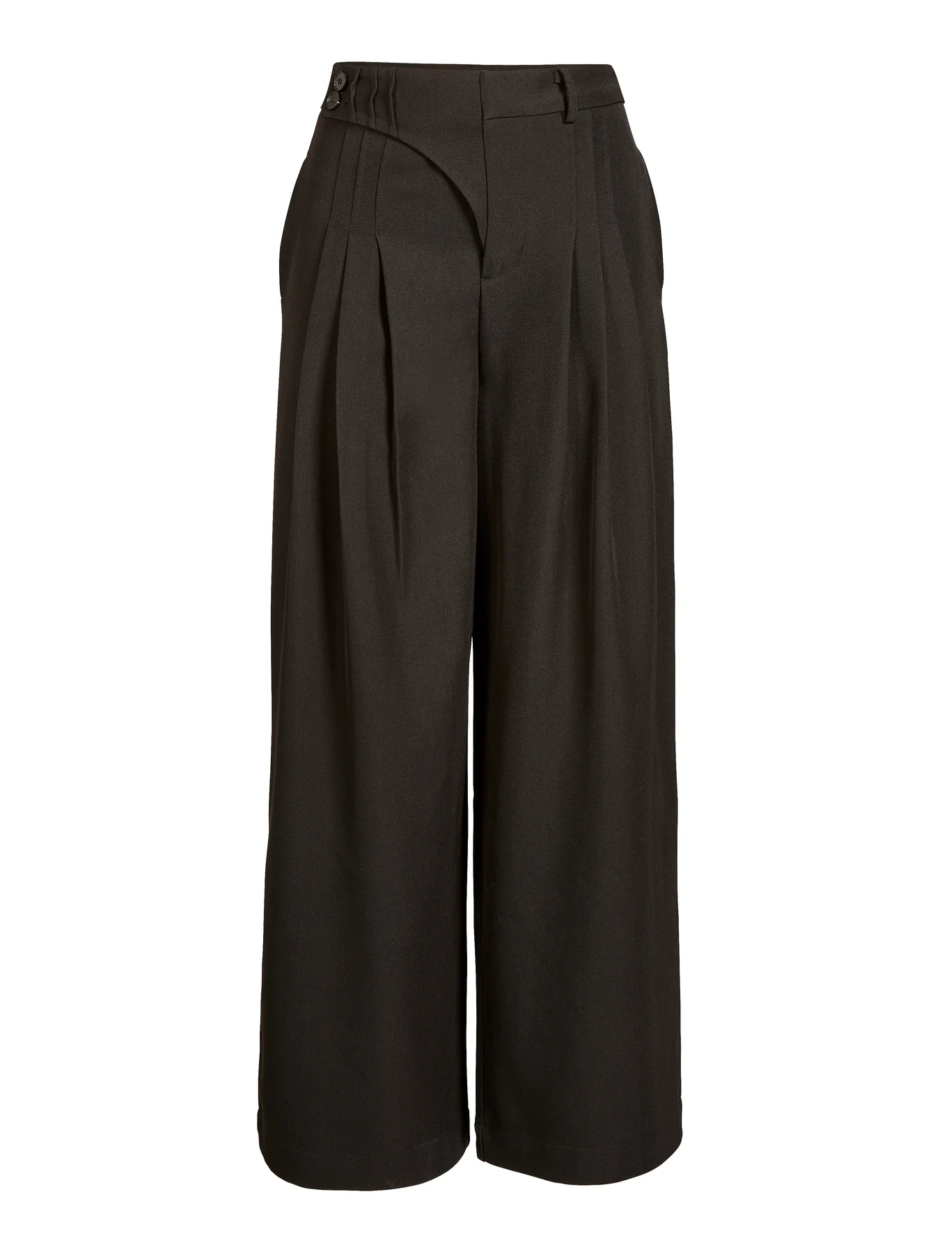 Estos pantalones tienen perneras anchas y rectas, y un corte elegante y entallado. Presentan pinzas distintivas en la parte delantera y un detalle asimétrico decorativo en la cintura, que les da un toque moderno. Cuentan con trabillas, cierre oculto y bolsillos de ribete en la parte trasera, realzando su estilo clásico y depurado.