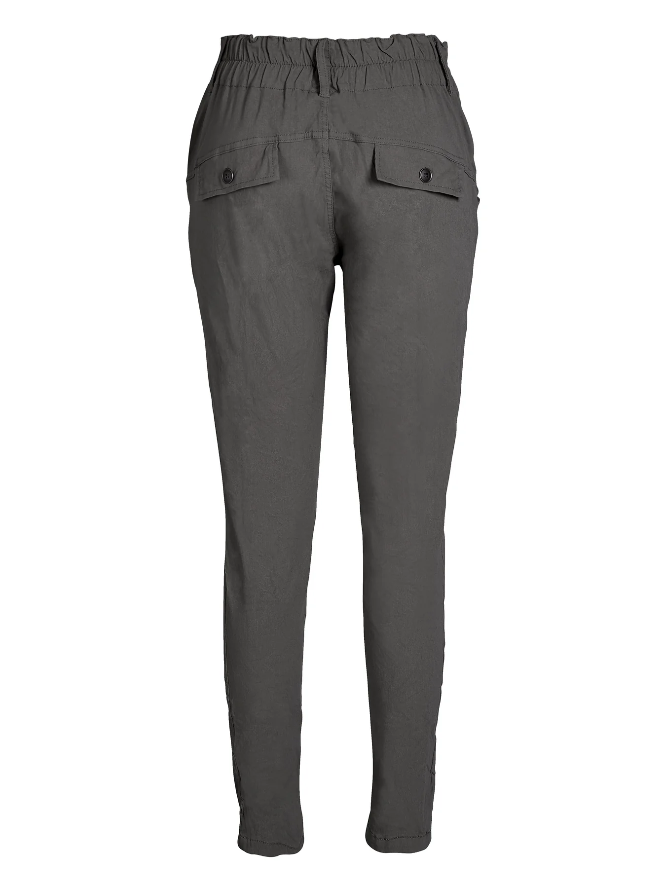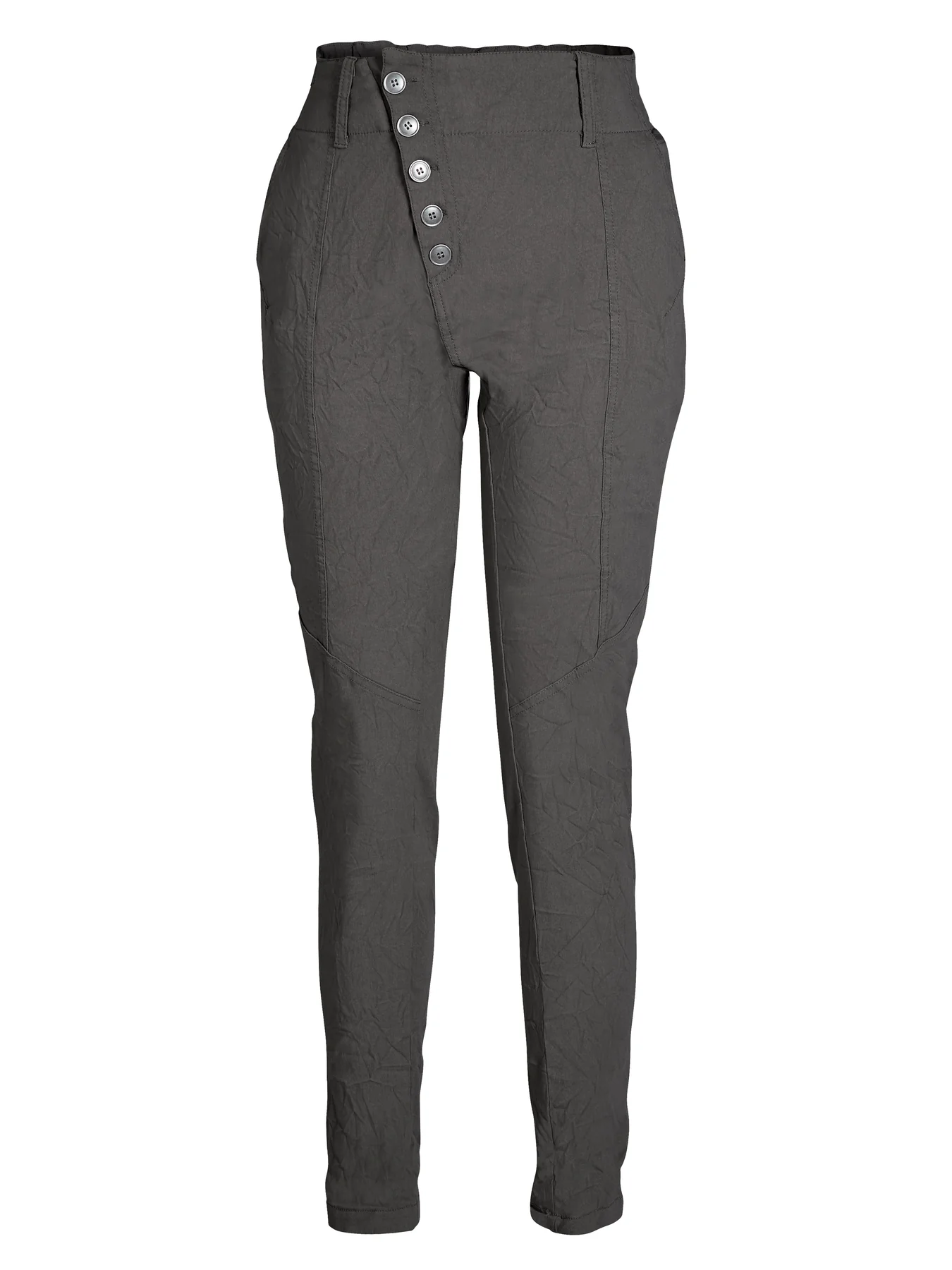 Estos pantalones combinan un diseño moderno con comodidad en un corte ajustado. El cierre de botones inclinados en la parte delantera crea un look único y llamativo, mientras que el elástico en la parte trasera garantiza un ajuste flexible. Las costuras decorativas y los bolsillos traseros con solapa añaden un toque de detalle a su diseño sencillo.