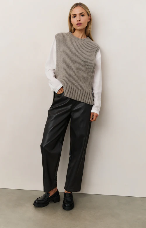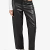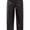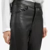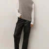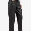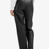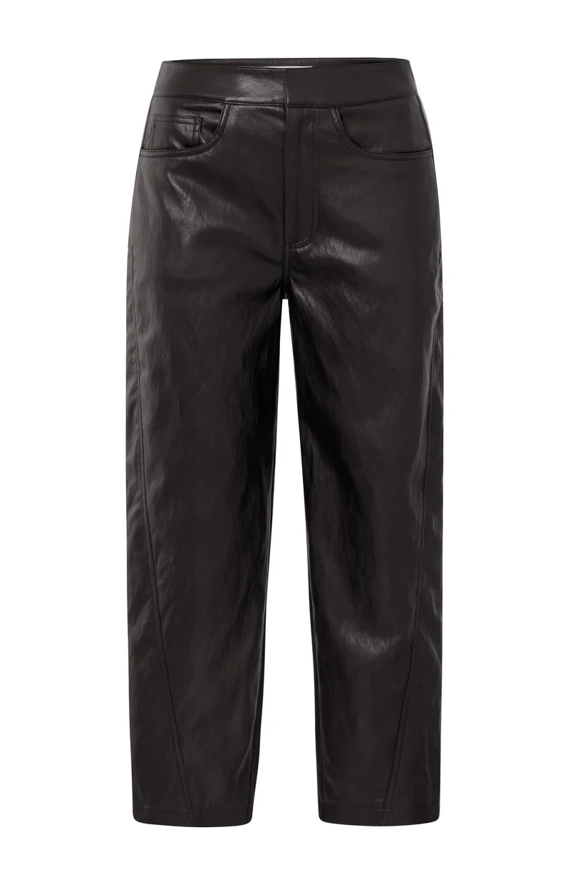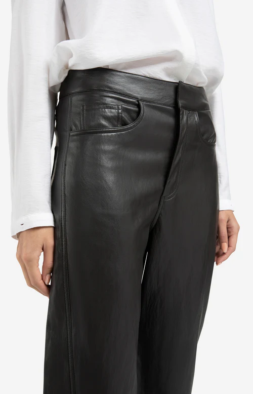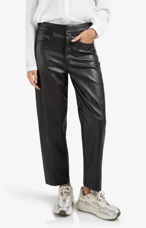 Este pantalón contemporáneo está confeccionado en suave piel sintética y presenta cintura alta y perneras estrechas y ajustadas. El corte holgado en la cadera se estrecha elegantemente hacia los tobillos. Cuenta con bolsillos de ojal delanteros, bolsillos de parche en la parte trasera y costuras decorativas que le aportan carácter. Su sutil brillo le da un aspecto moderno. La modelo mide 175 cm y usa la talla 36.