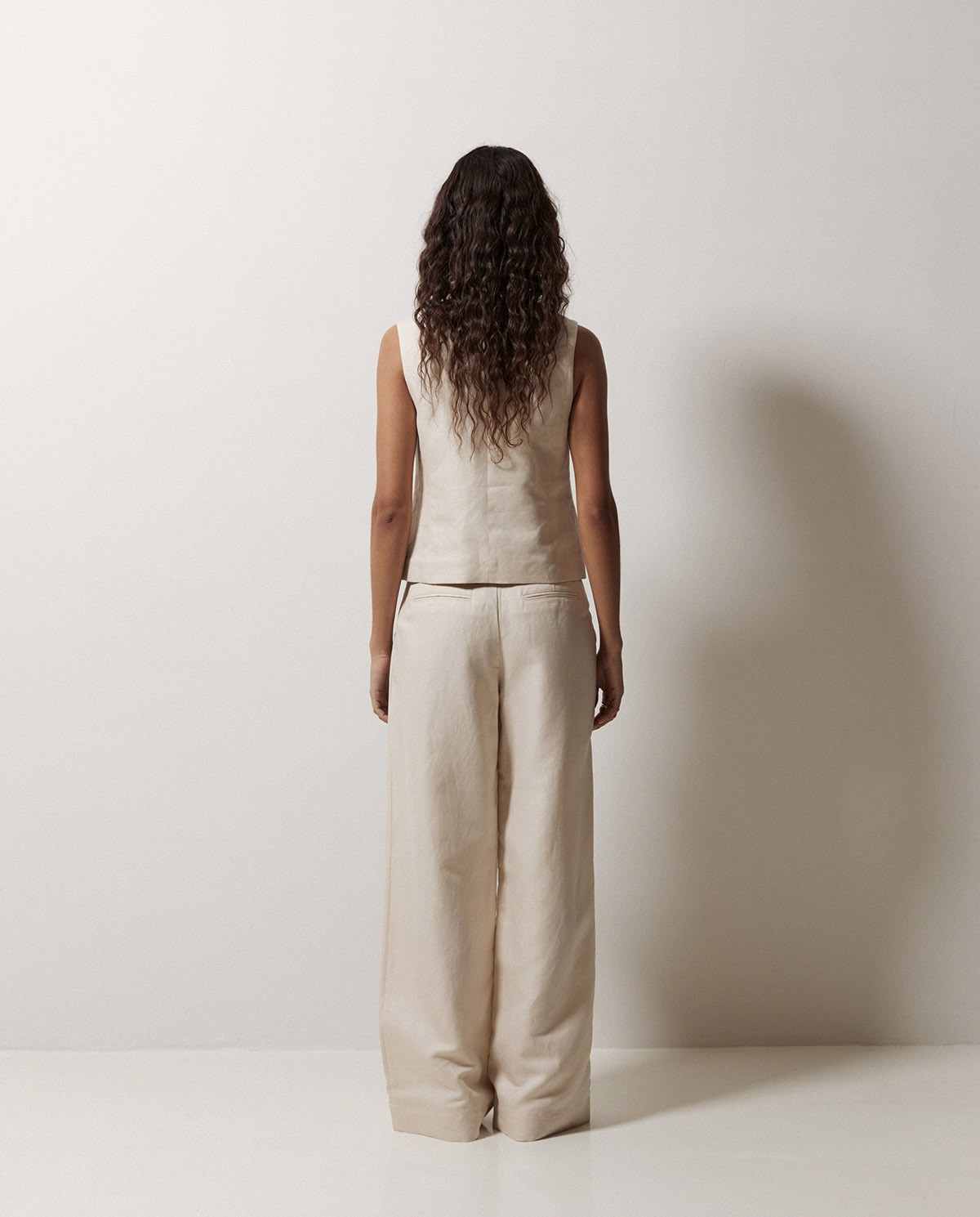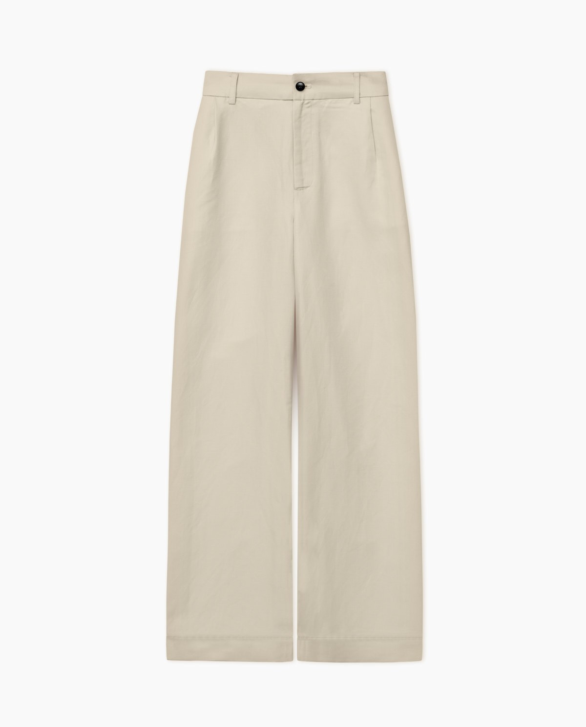 Pantalones wide leg. Tejido mezcla de lino, lyocell y algodón. Wide leg. Tiro alto. Detalle pinzas. Cierre con cremallera y botón. Con trabillas para cinturón. Dos bolsillos laterales. Dos bolsillos de ribete detrás.