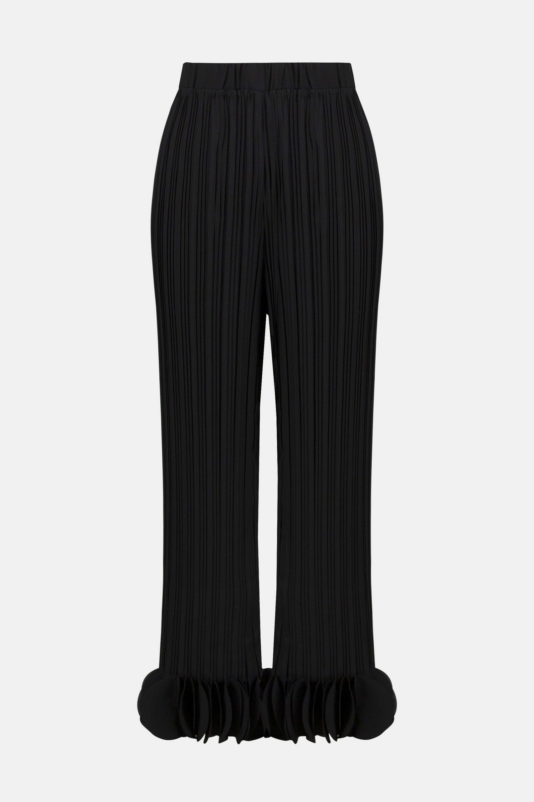 Acapara todas las miradas con estos impresionantes pantalones de pierna ancha, confeccionados en georgette ligero y fluido que te ofrece una elegancia y movimiento sin esfuerzo. Los delicados pliegues aportan volumen y estilo, mientras que la cinturilla estructurada y contorneada estiliza la cintura para una silueta elegante. Un llamativo aplique circular en las aberturas de las piernas le da un toque único y llamativo, convirtiéndolos en la opción perfecta para cualquier ocasión especial.