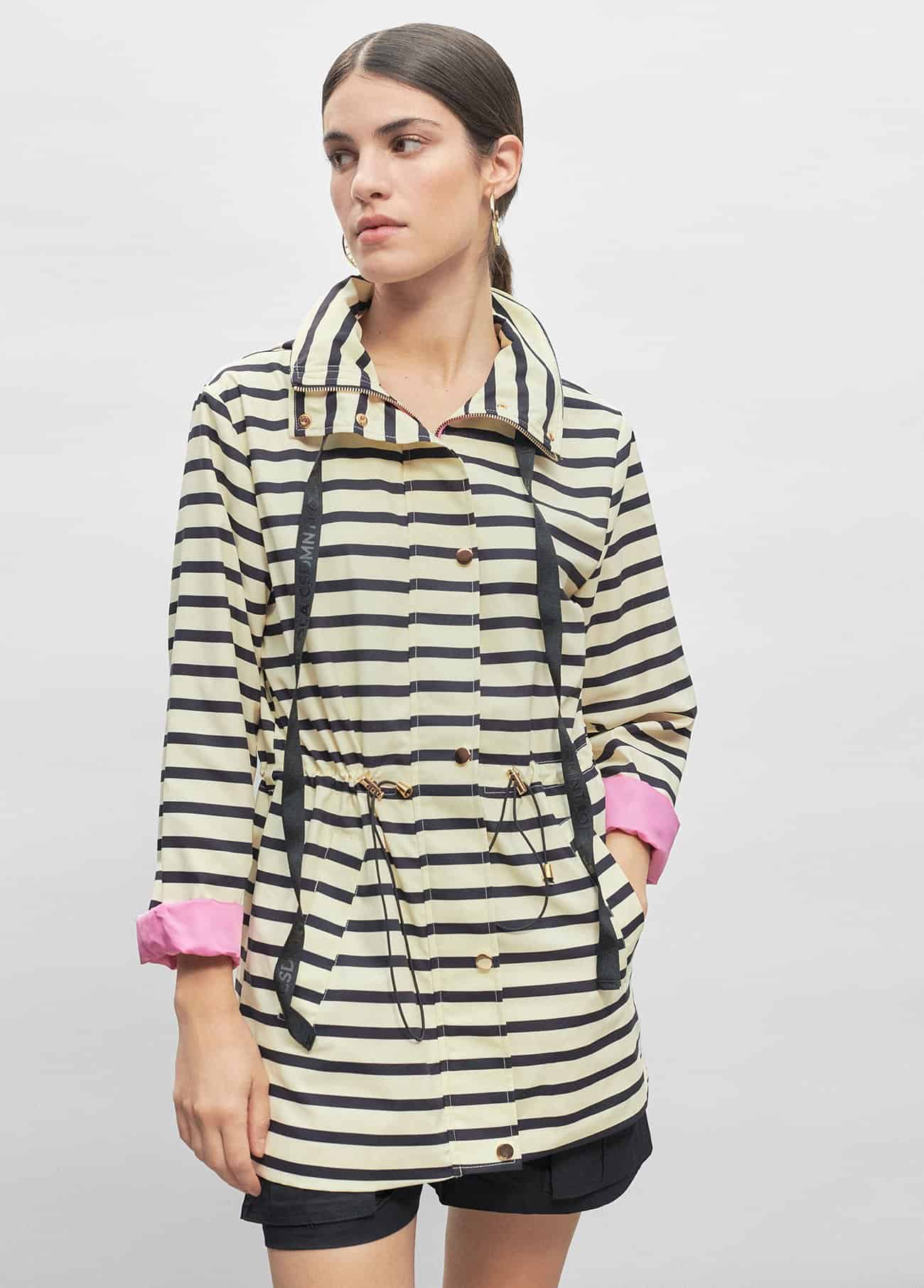 Parka de rayas bicolor con forro a contraste y bolsillos laterales.