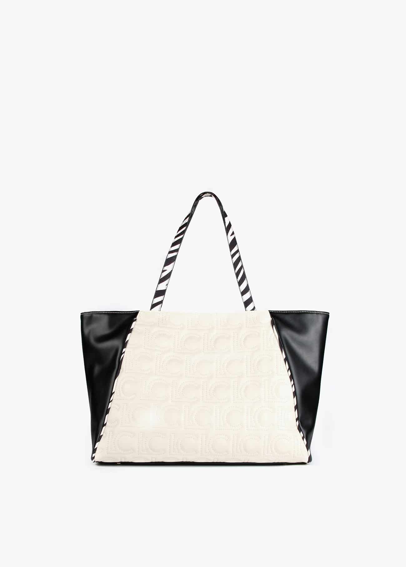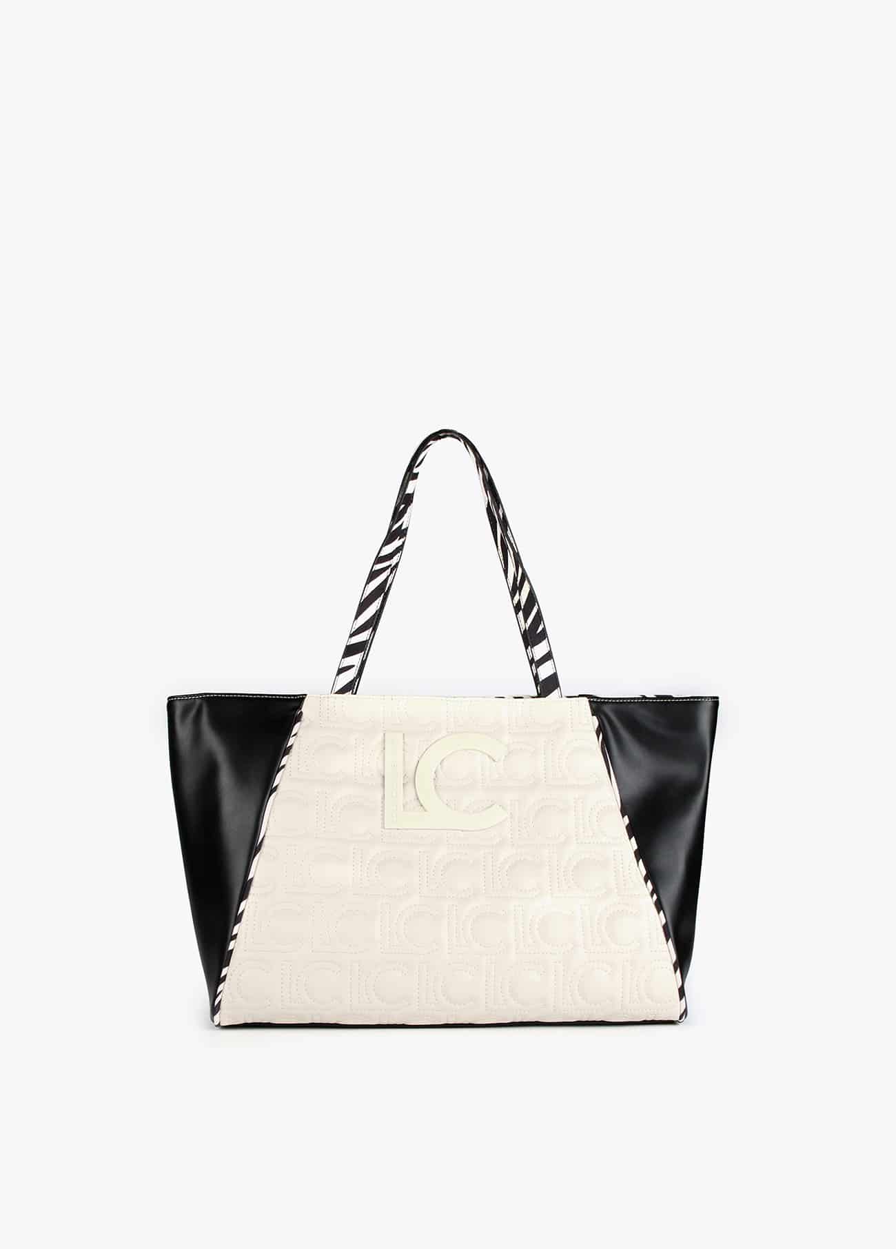 Bolso shopper bicolor combinado con animal print, monograma bordado y maxi logo lacado. Cierre con lengüeta y botón imantado. Detalle bolso interior logotipado.