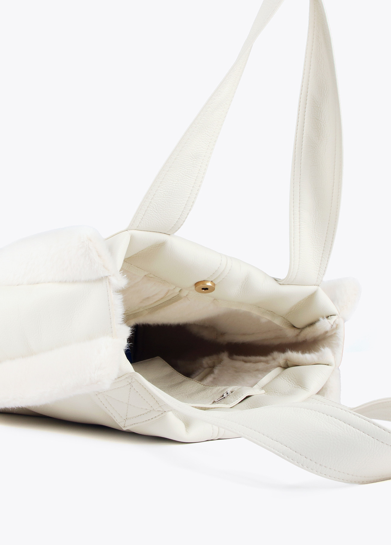 Bolso tipo shopper en efecto piel y efecto pelo combinados. Logo lacado en parte frontal, asa de hombro y cierre con botón imantado.
