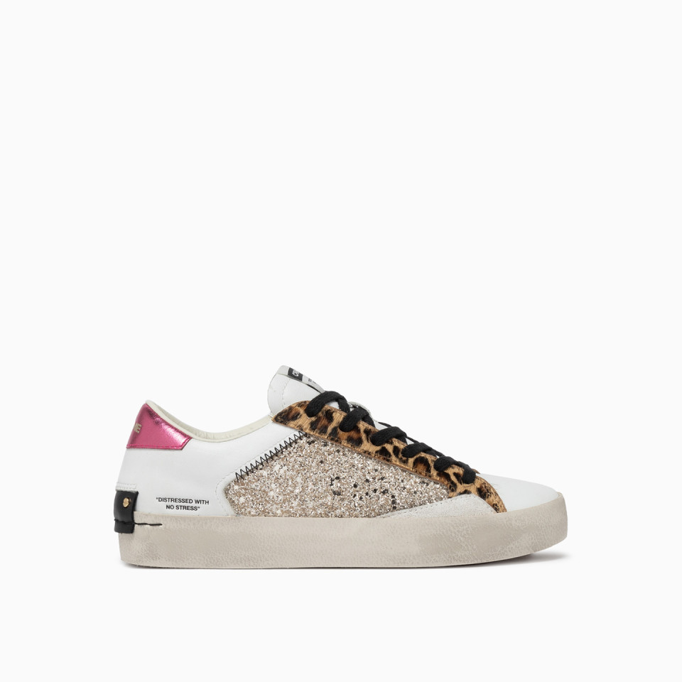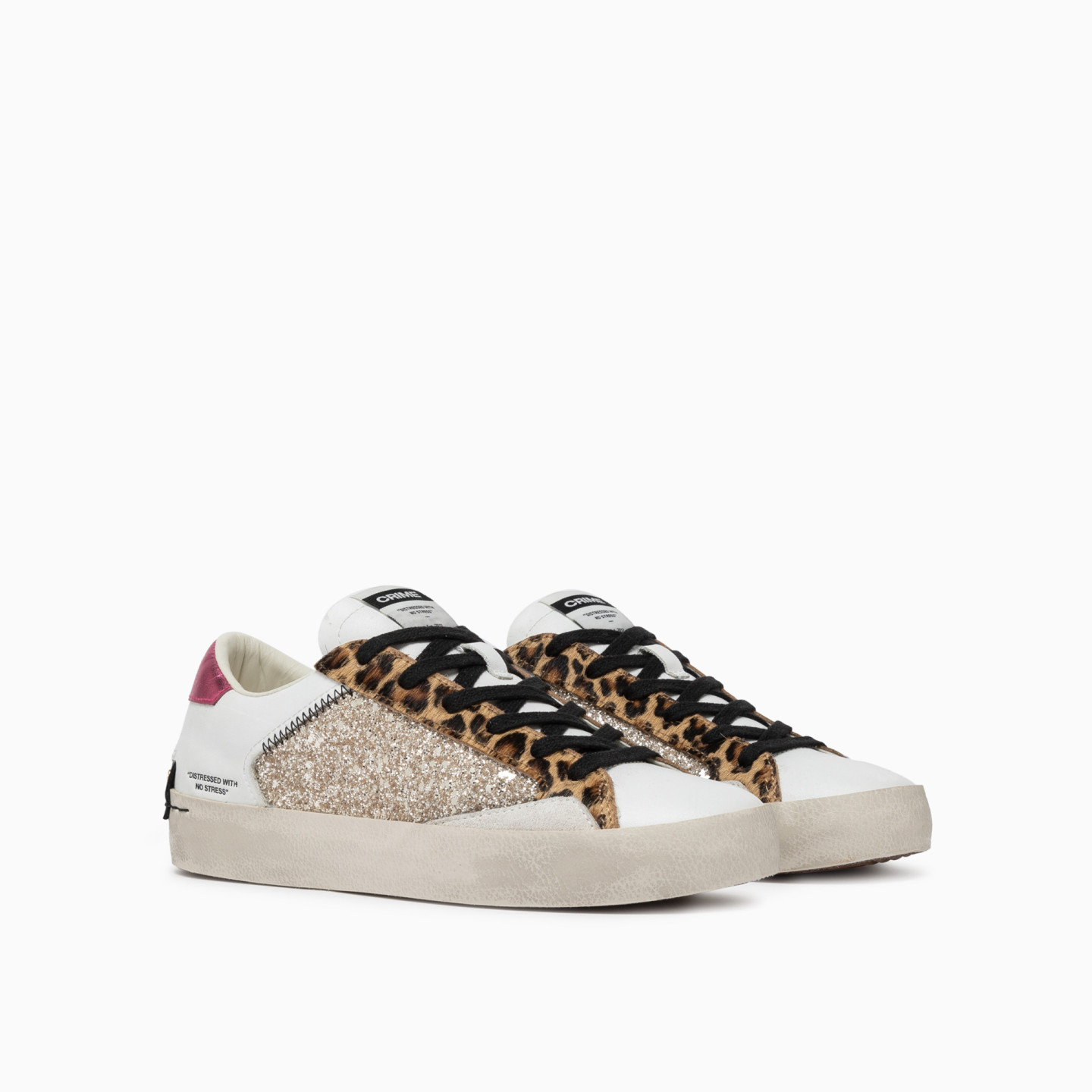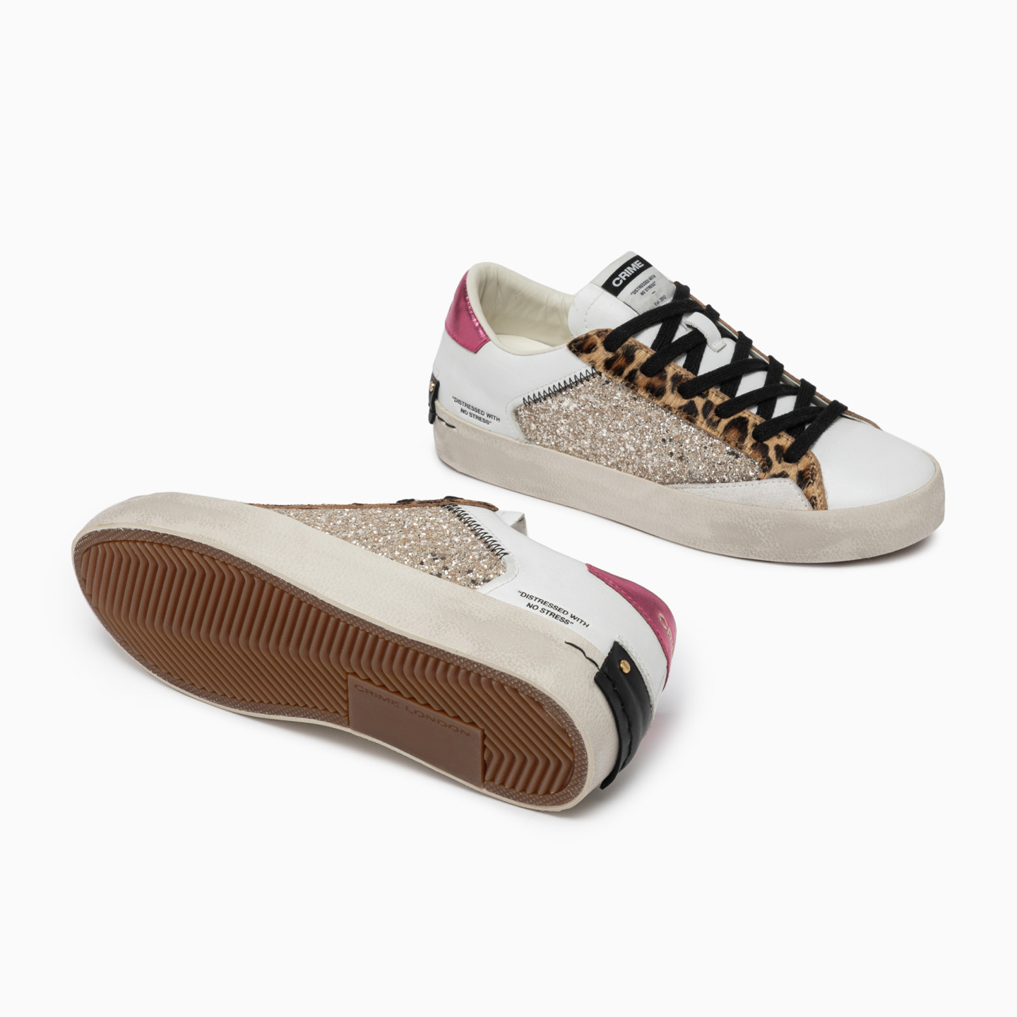- Parte superior de cuero blanco con brillo platino y piel de becerro con estampado de león.