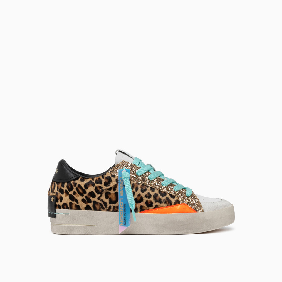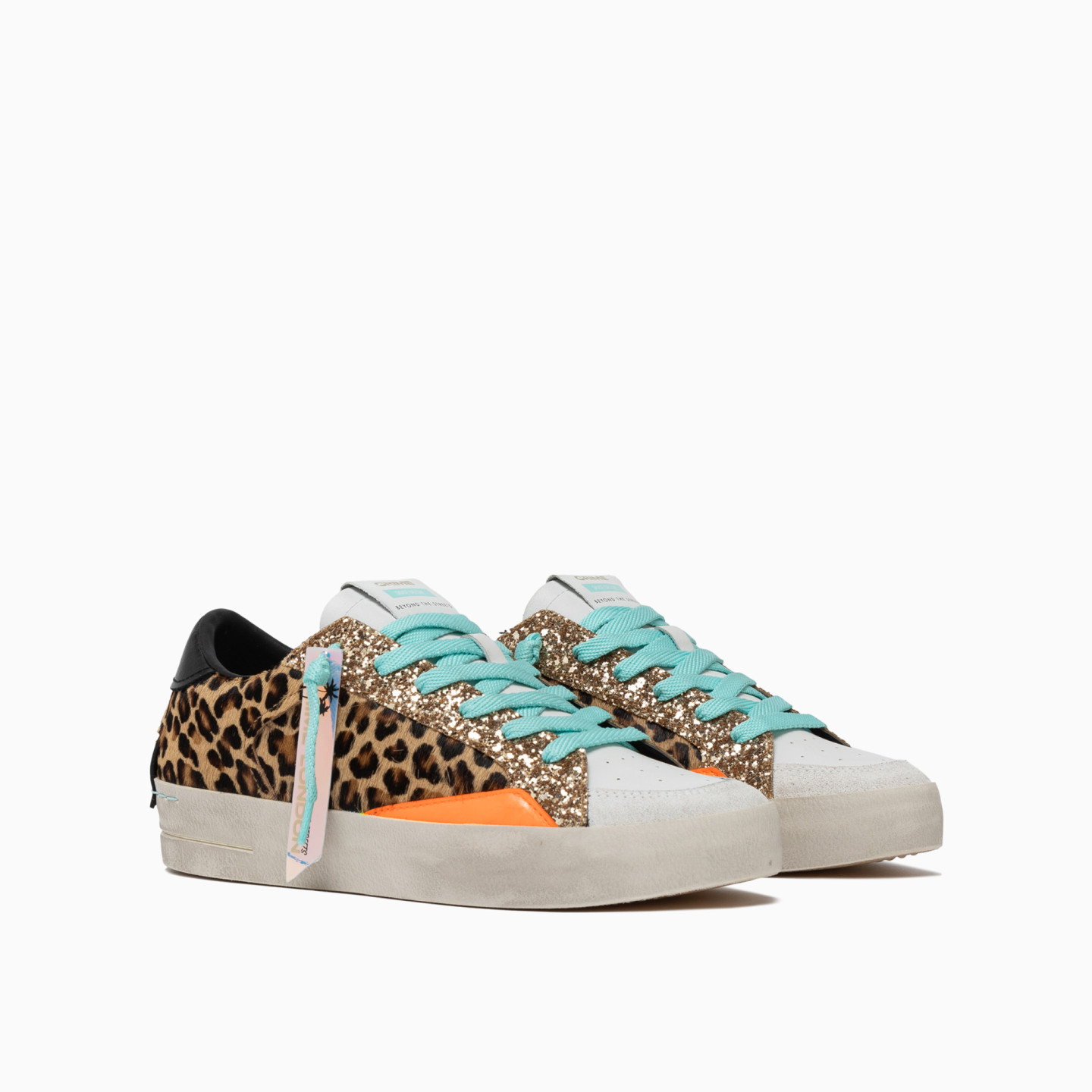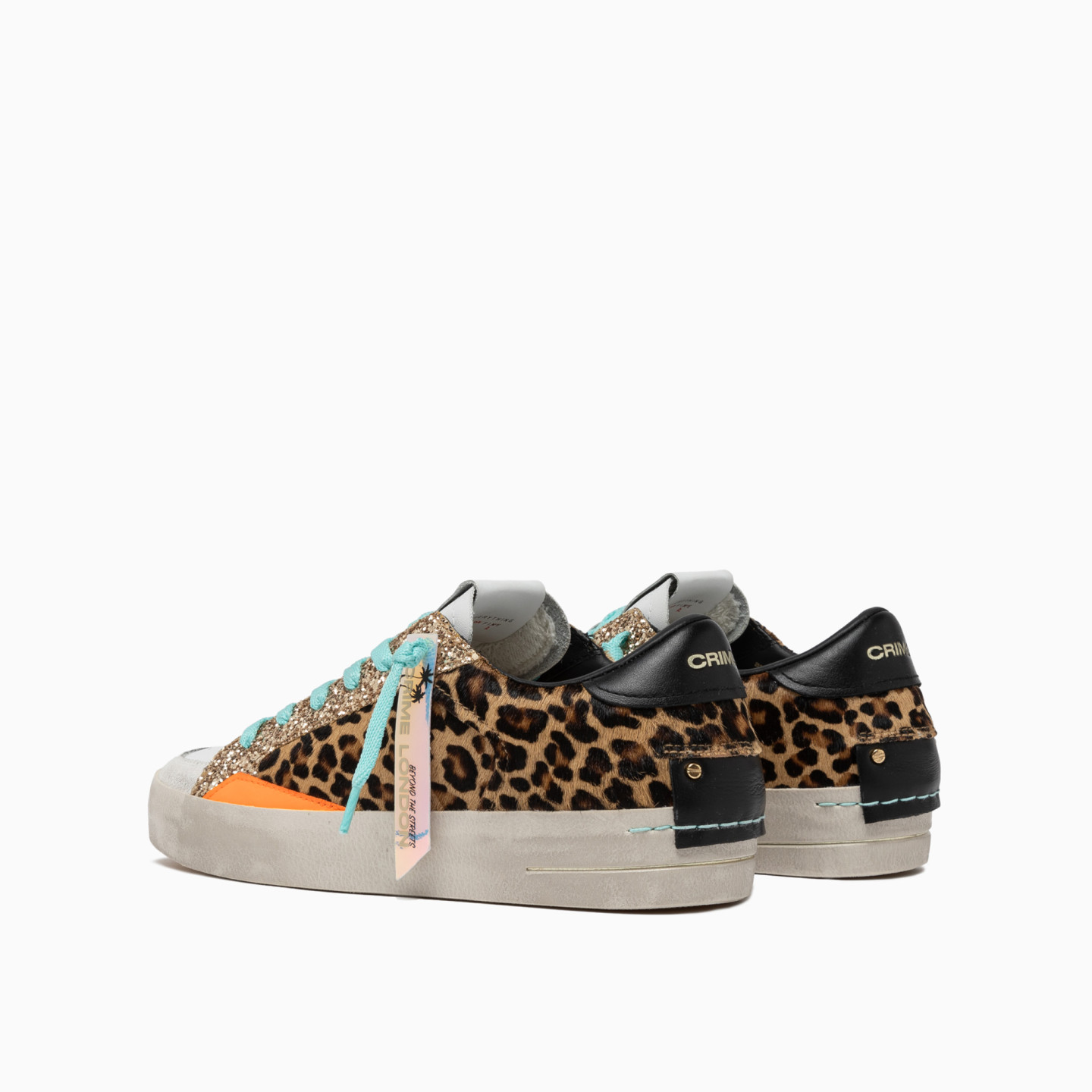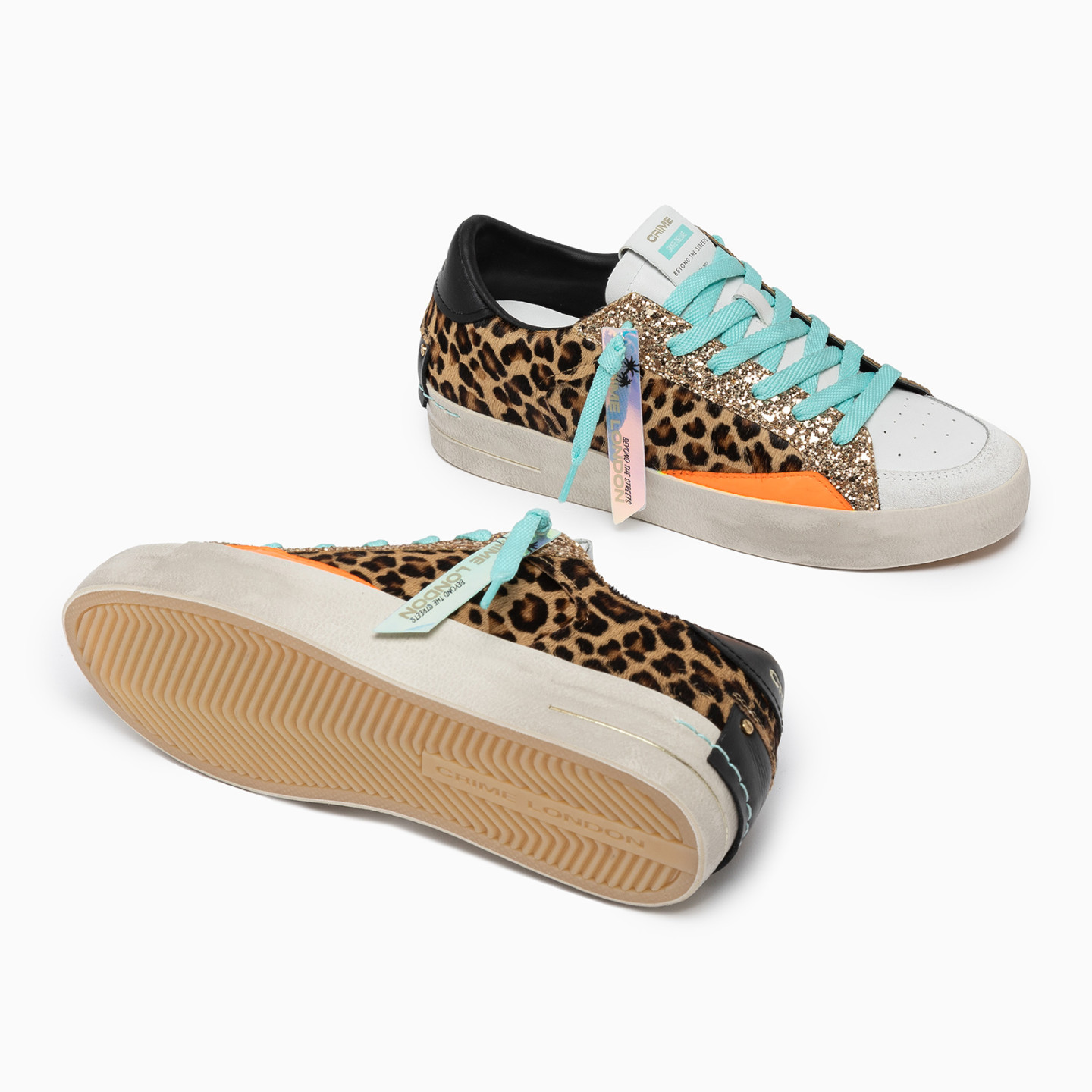 • Parte superior de piel de becerro con estampado de leo y detalles de charol en color naranja fluorescente y brillo dorado.