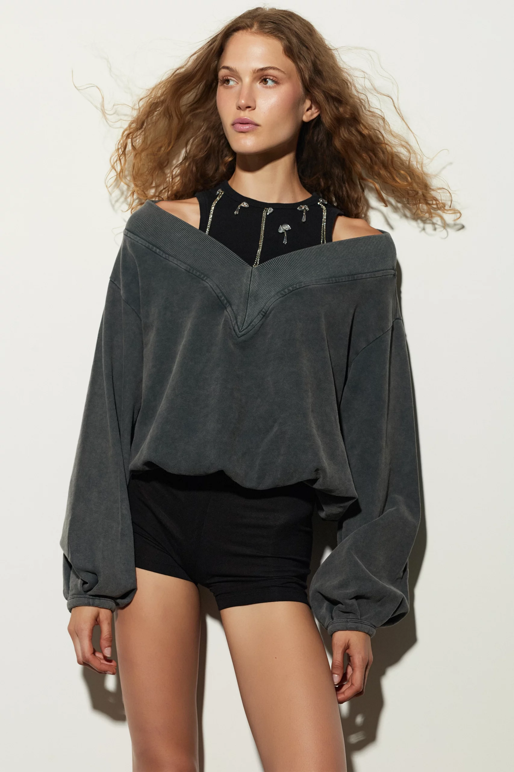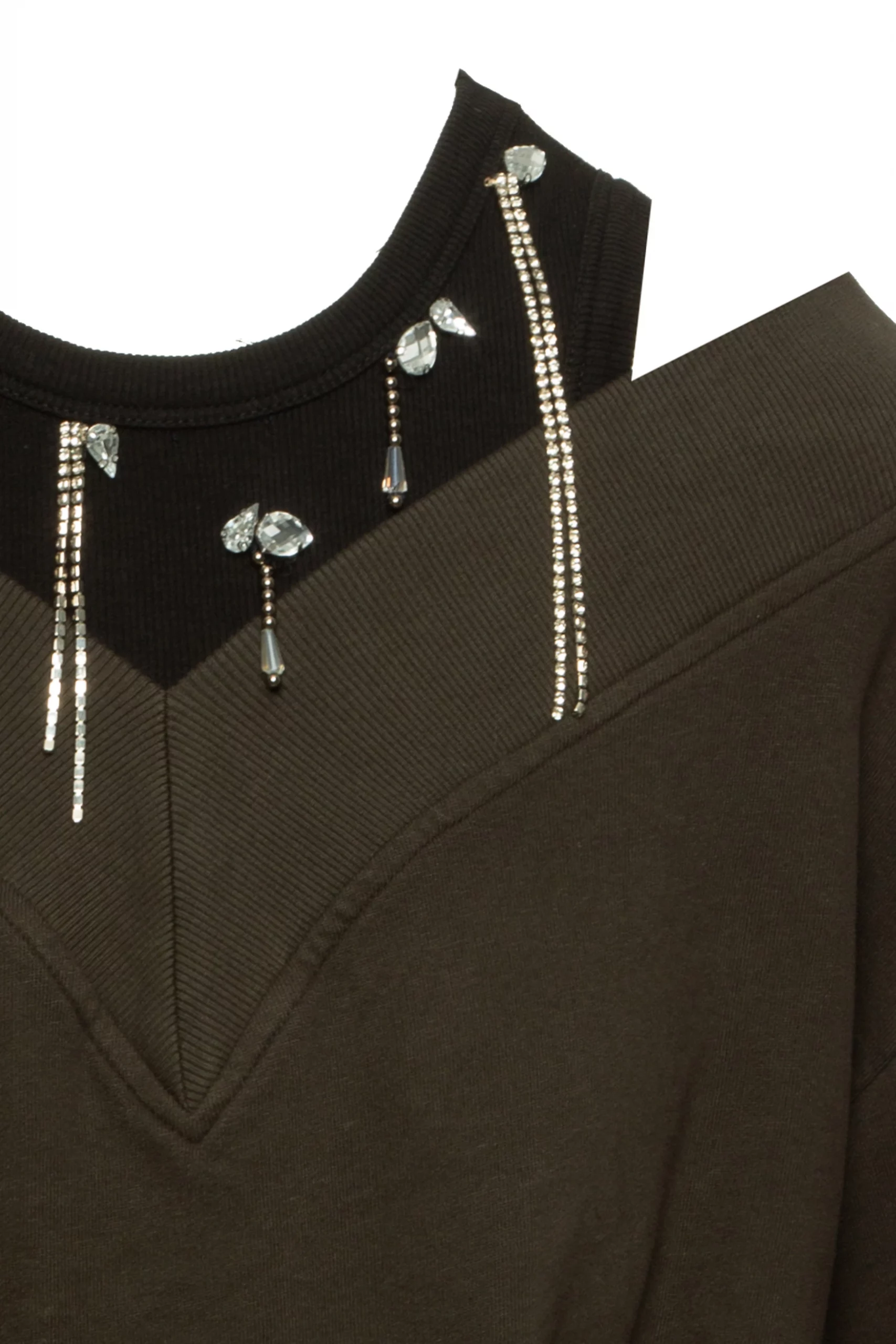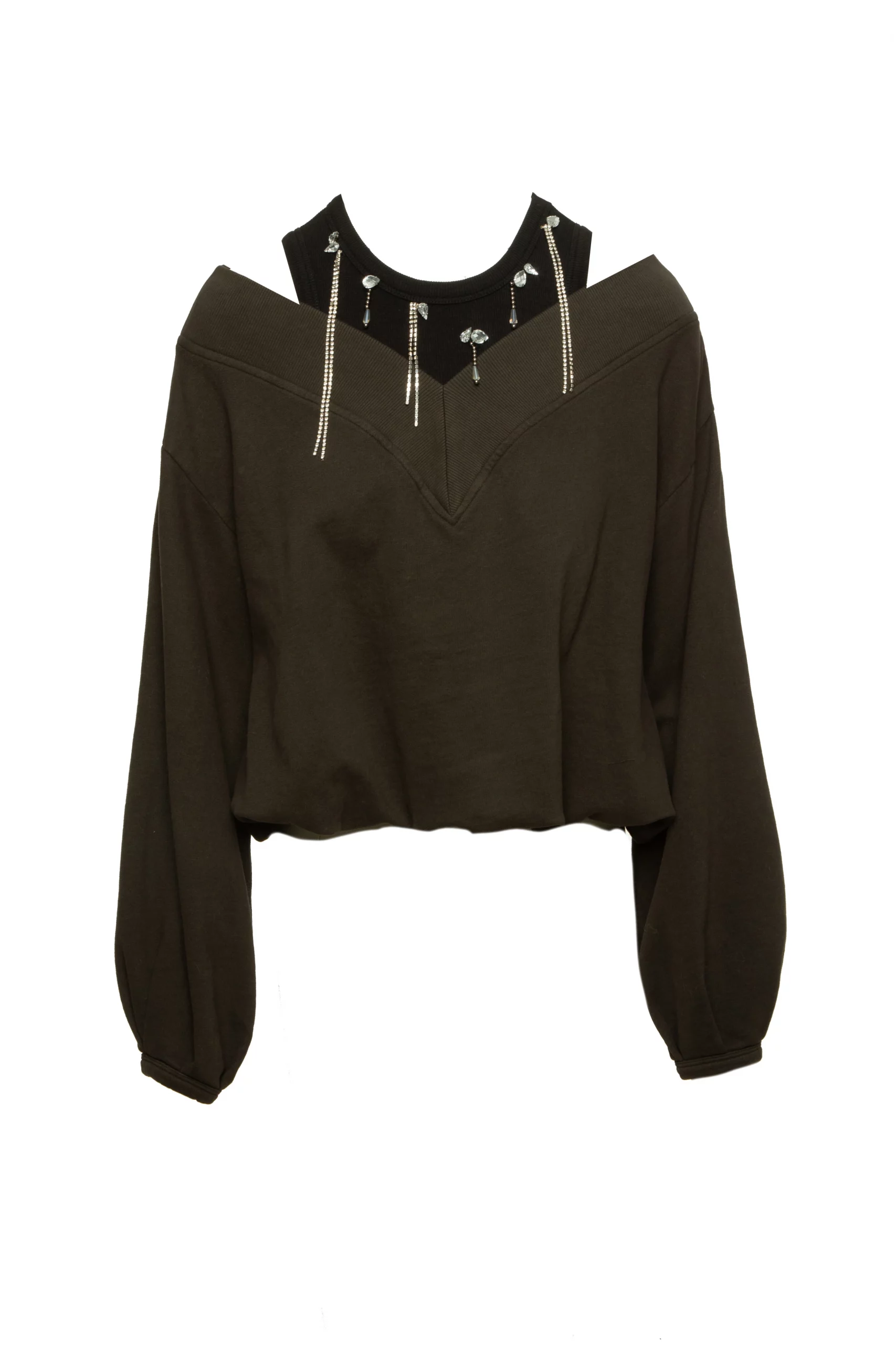 Suéter, con mangas largas, cuello en V, con parte superior interior, con pedrería, algodón, hombros descubiertos, corte regular