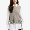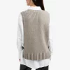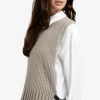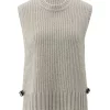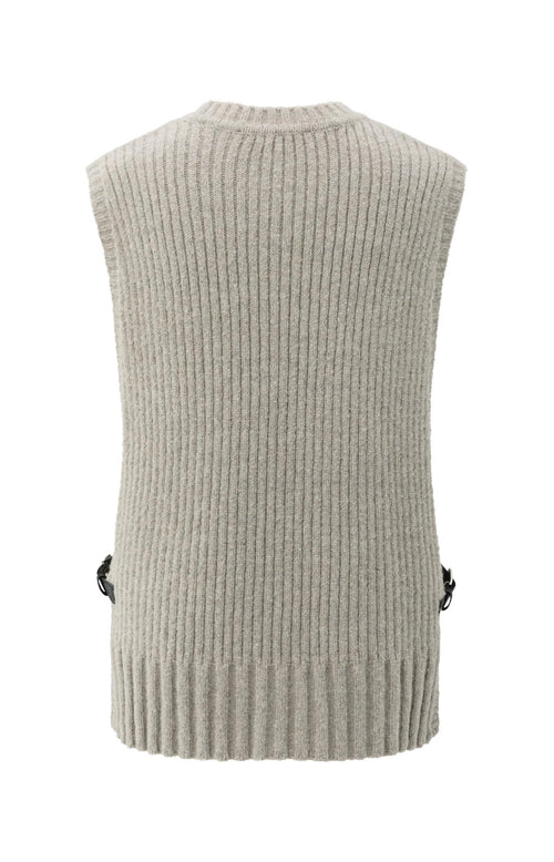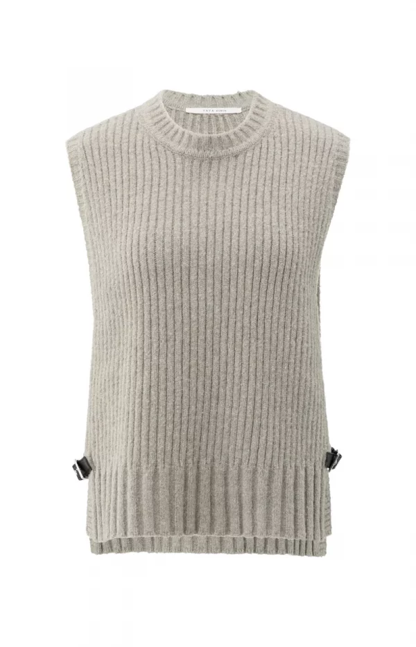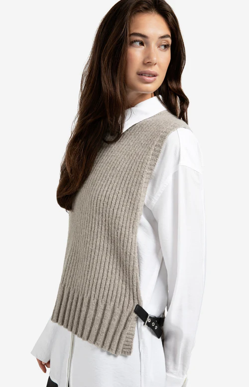 Esta prenda de punto acanalado grueso sin mangas presenta cuello redondo y un corte regular ligeramente alargado. El diseño acanalado texturizado le da un aspecto acogedor y estructurado, mientras que las hebillas laterales de cuero le dan un toque atrevido y contemporáneo. Perfecta para usarla sobre una blusa o un jersey de cuello alto en los días más fríos. La modelo mide 175 cm y usa la talla S.