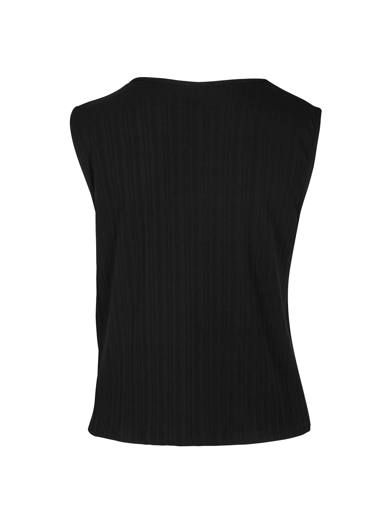 Dale un toque moderno a tu atuendo con este elegante top. Su suave tejido acanalado proporciona un ajuste cómodo, mientras que el corte drapeado en la parte delantera crea una silueta favorecedora con un ligero efecto asimétrico. Su diseño sin mangas y escote redondo lo hacen ideal tanto para el día a día como para la noche.
