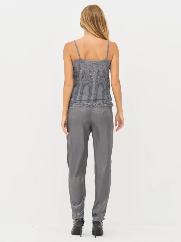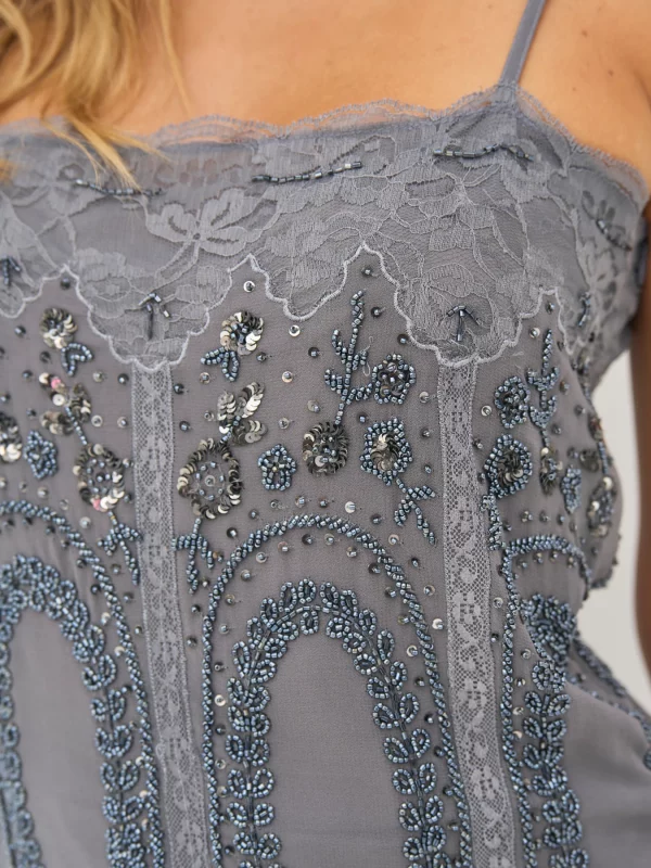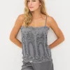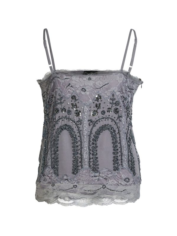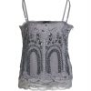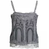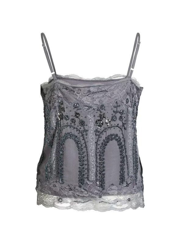 Este top rebosa de delicadeza con su delicado encaje y detalles de perlas bordadas que le dan un toque hermoso y decorativo. Su corte ligeramente entallado y sus tirantes ajustables garantizan un ajuste cómodo y personalizado. El interior suave del top ofrece mayor comodidad, mientras que la capa exterior de encaje y perlas le aporta estructura y profundidad.