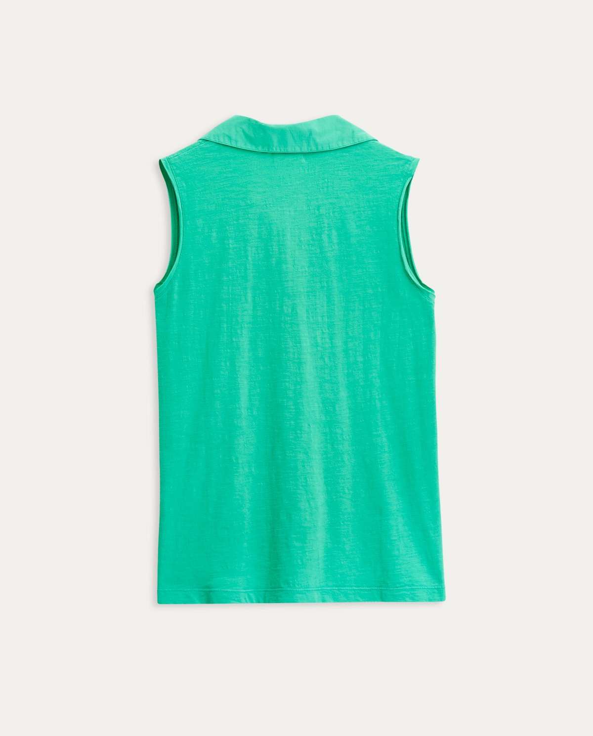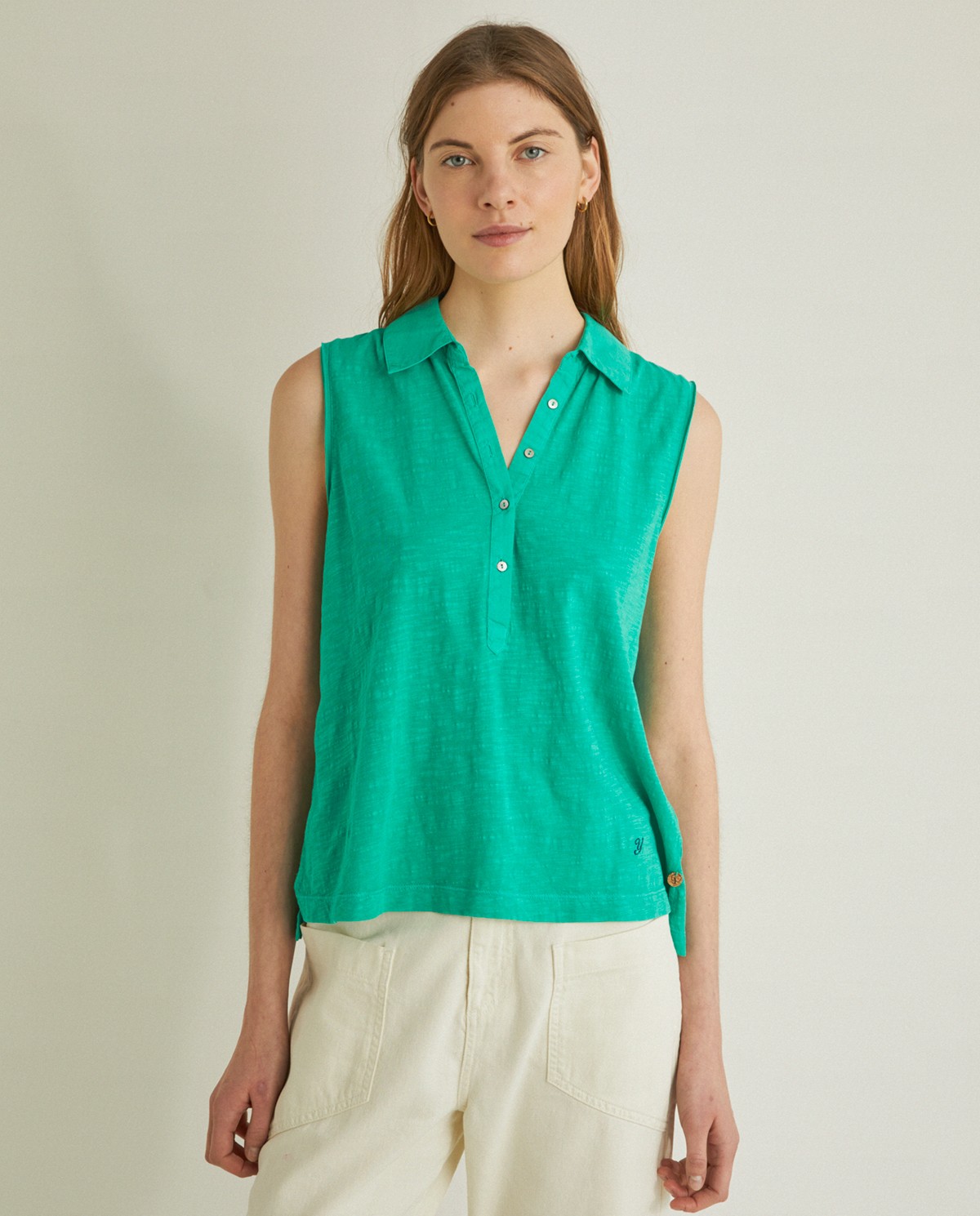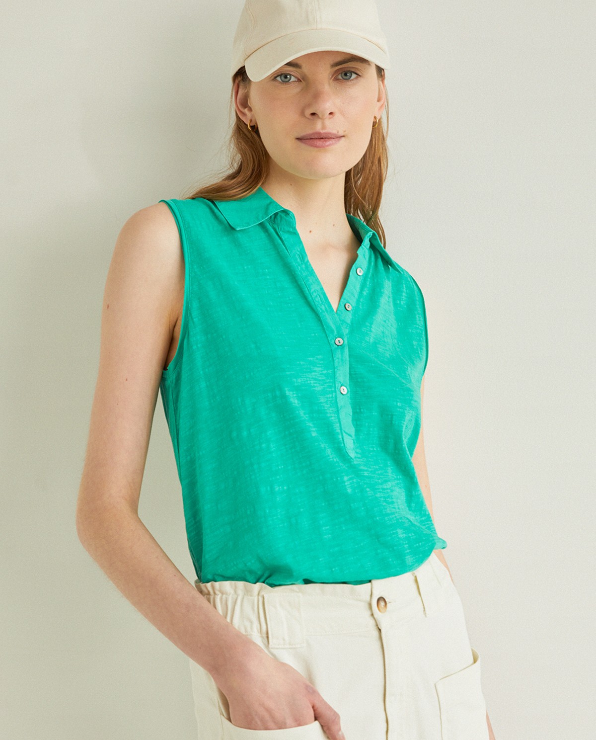 Top sin mangas y cuello polo. Detalle de botonadura. Tejido en punto liso y algodón orgánico. Detalle de bordado. Corte recto. Composición:100% algodón orgánico.