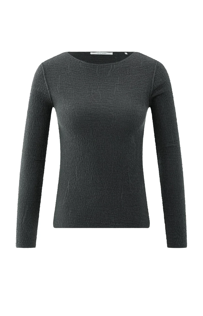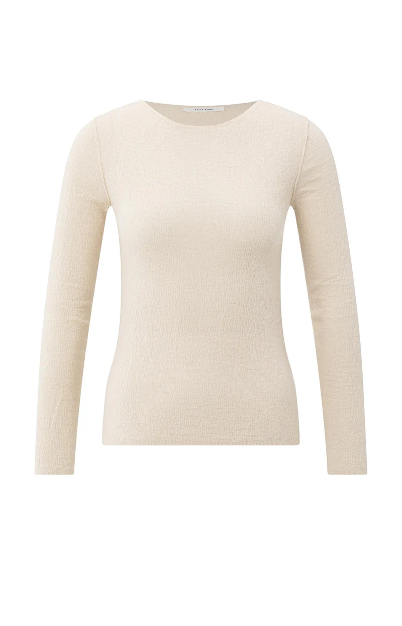 Este top de punto fino y suave presenta cuello redondo, mangas largas y corte ajustado. Su sutil textura le da un toque elegante. Confeccionado con un tejido elástico cómodo, es perfecto para llevar en capas o solo. Su largo a la cadera facilita su combinación con tus prendas favoritas para cualquier ocasión. La modelo mide 175 cm y usa la talla S.